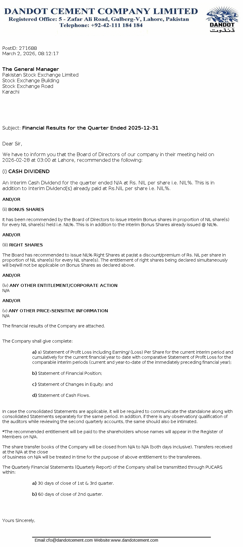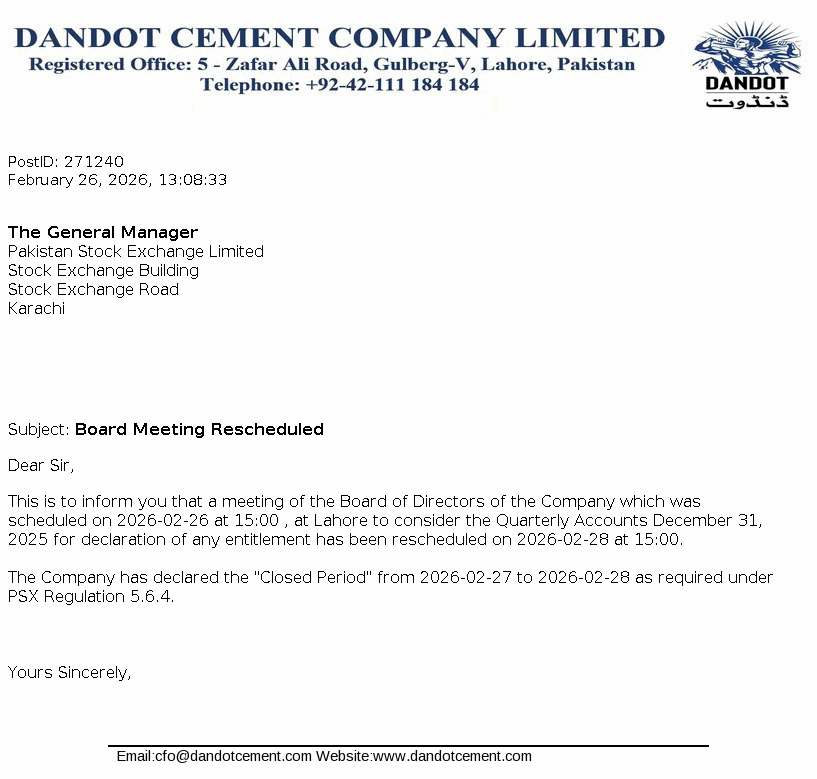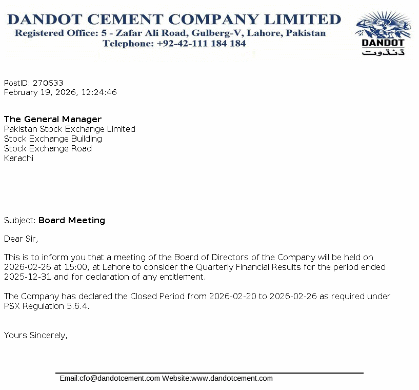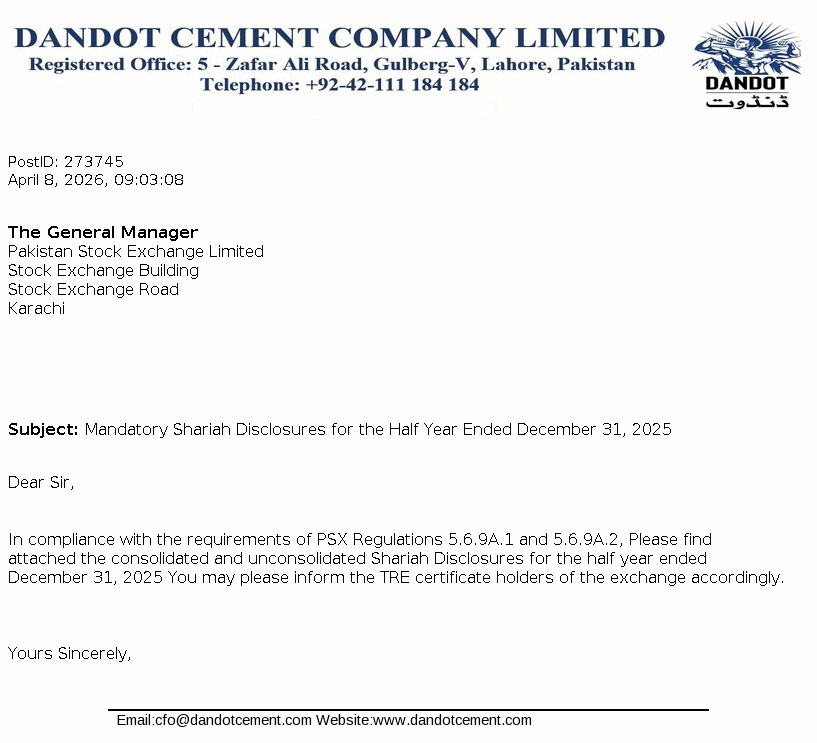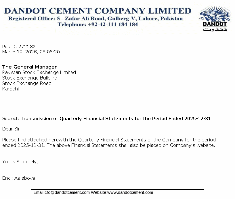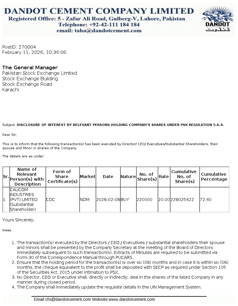 Dandot Cement Limited is a public limited Company incorporated in Pakistan. The Company started its production on 1983 and has been engaged in production and marketing of cement. The company is a subsidiary of Calicom Industries (Pvt.) Limited.