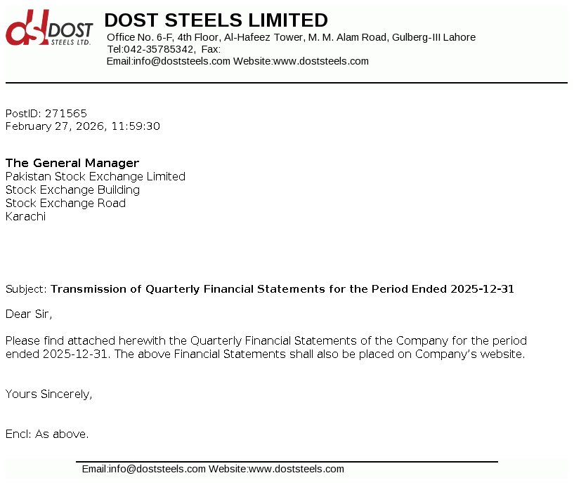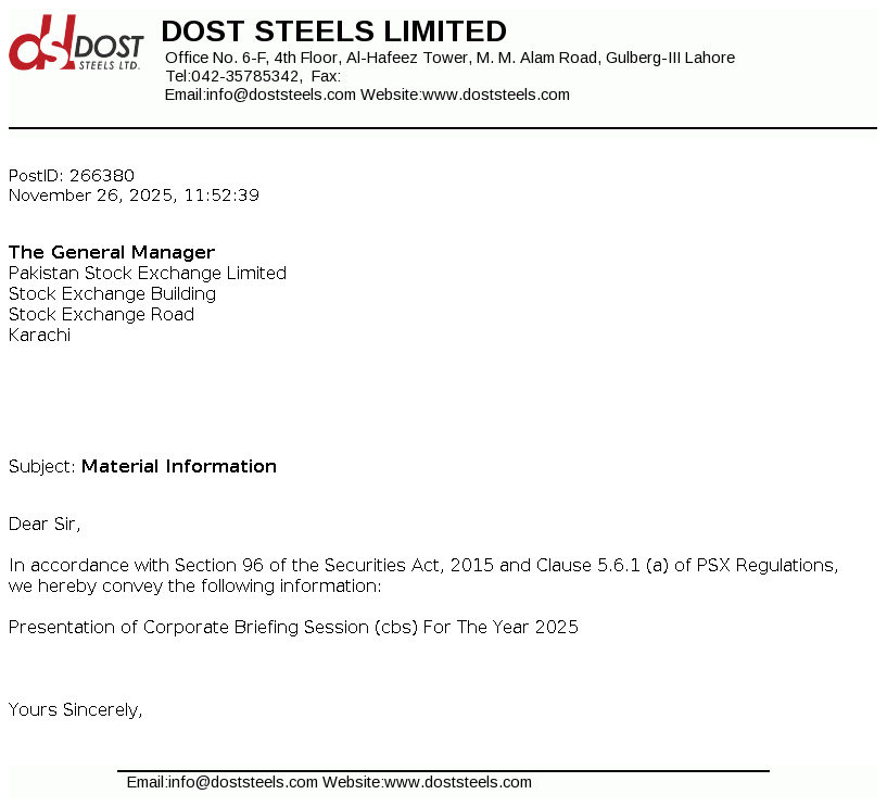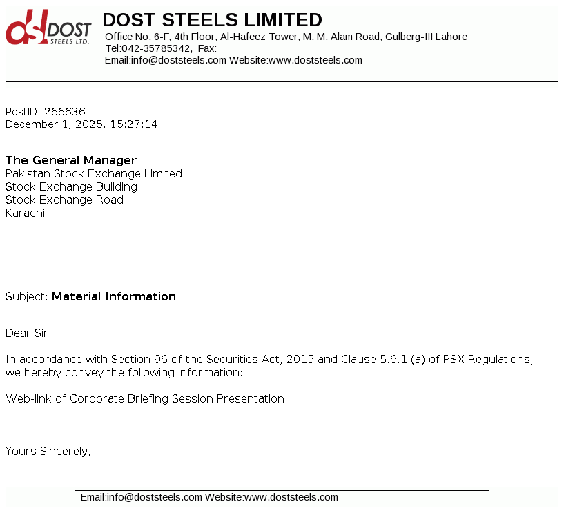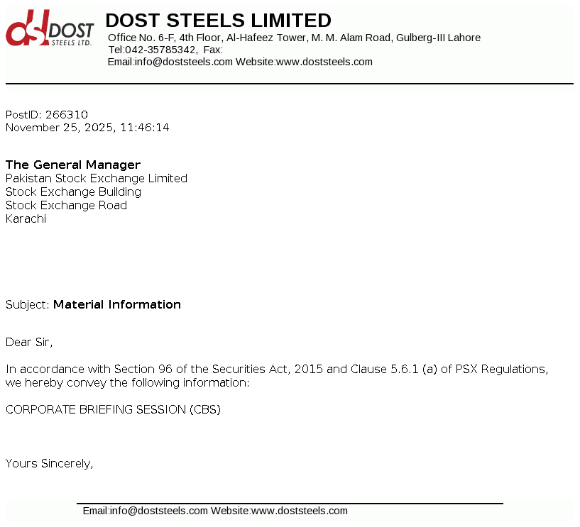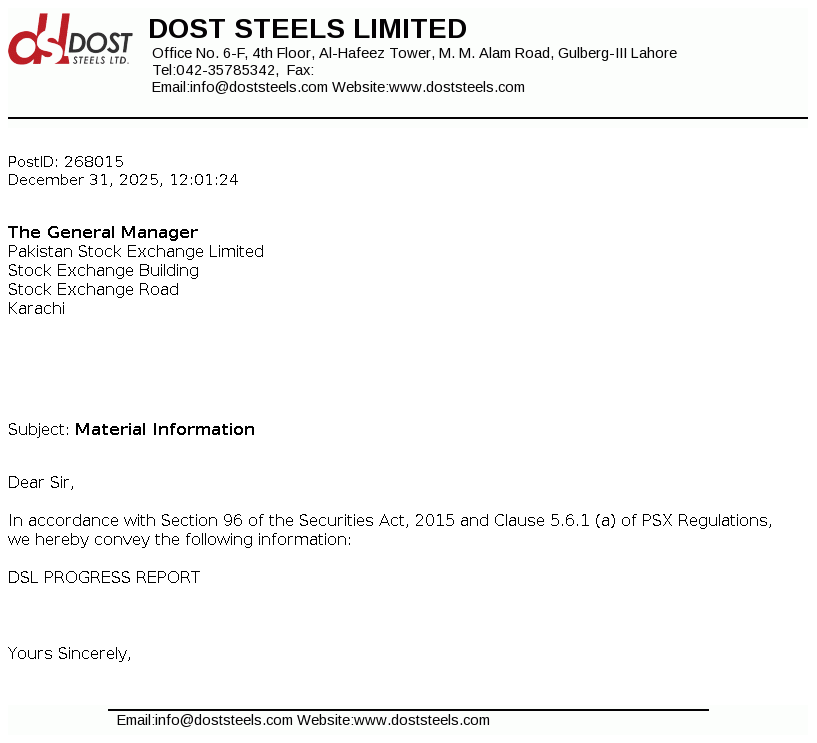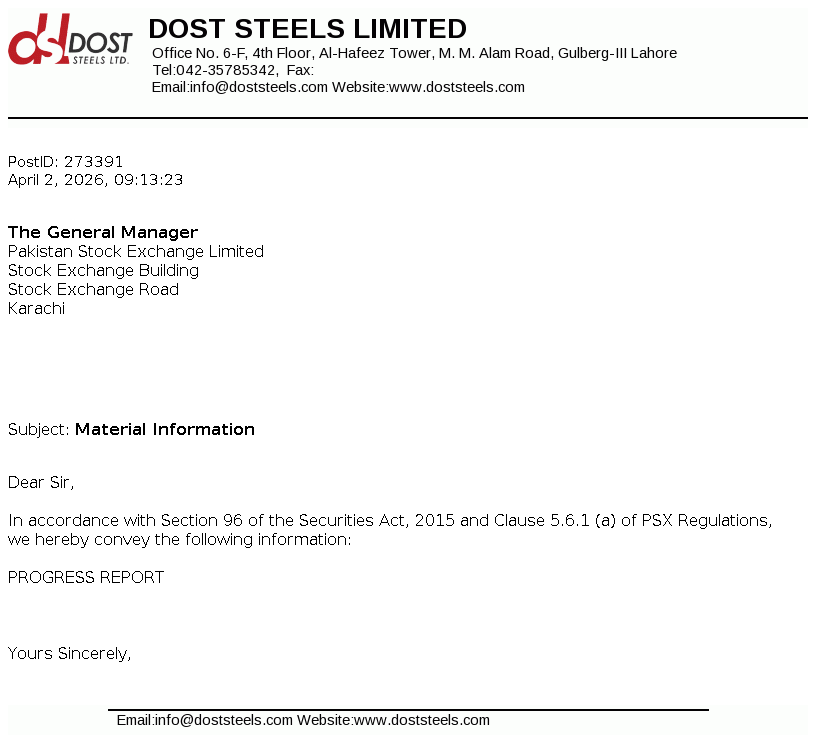 Dost Steel Limited was incorporated in Pakistan on March 19, 2004 as a private limited company under the Companies Ordinance, 1984 now the Companies Act, 2017. The principal business of the company includes manufacturing of steel, direct reduced iron, sponge iron, hot briquetted iron, carbon steel, pig iron and special alloy steel in different forms, shapes and sizes and any other product that can be manufactured within the existing facilities.