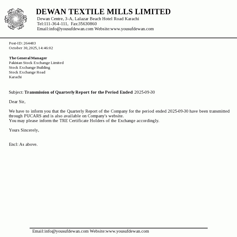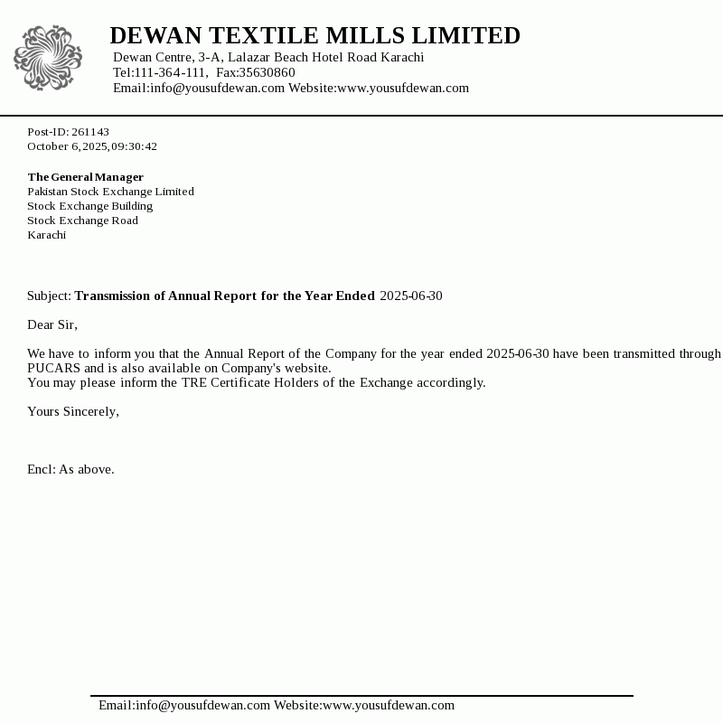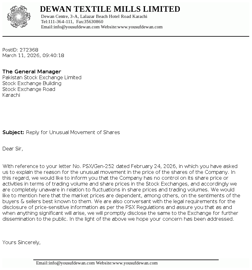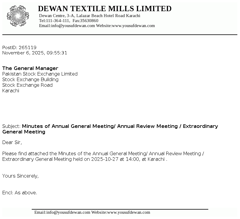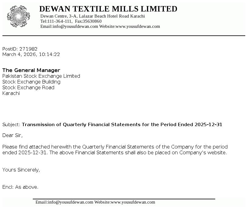 Dewan Textile Mills Limited was incorporated in Pakistan on 16 April 1970 as a public limited company. The principal activity of the Company is manufacturing and sale of yarn. However, the Company has suspended its manufacturing operations since December 2015.