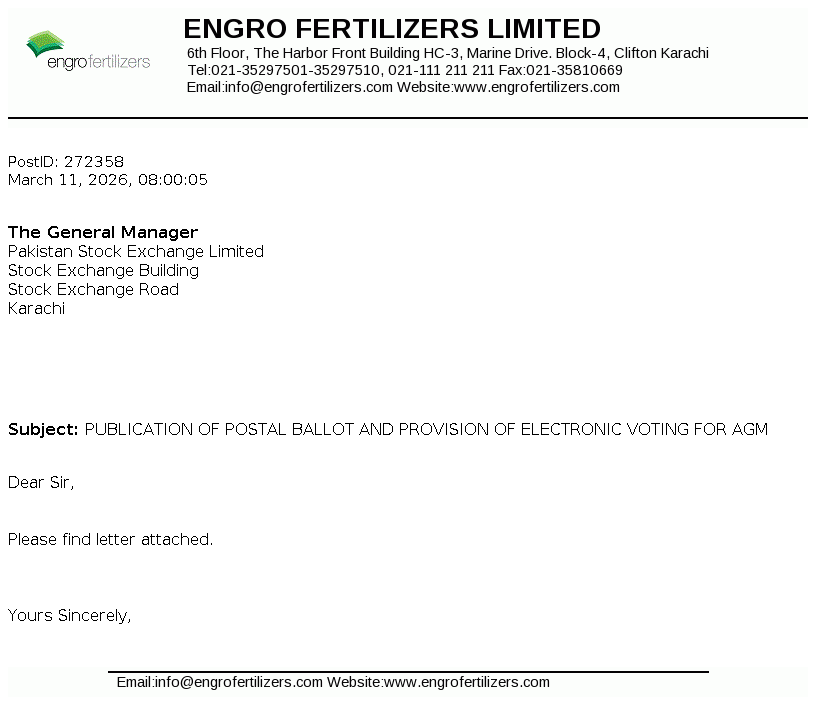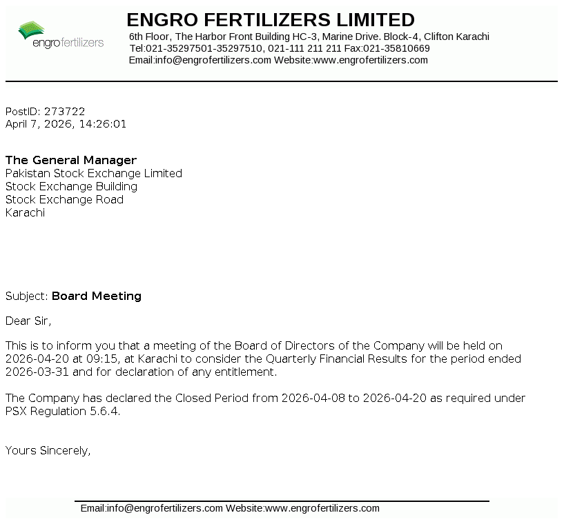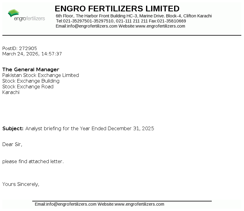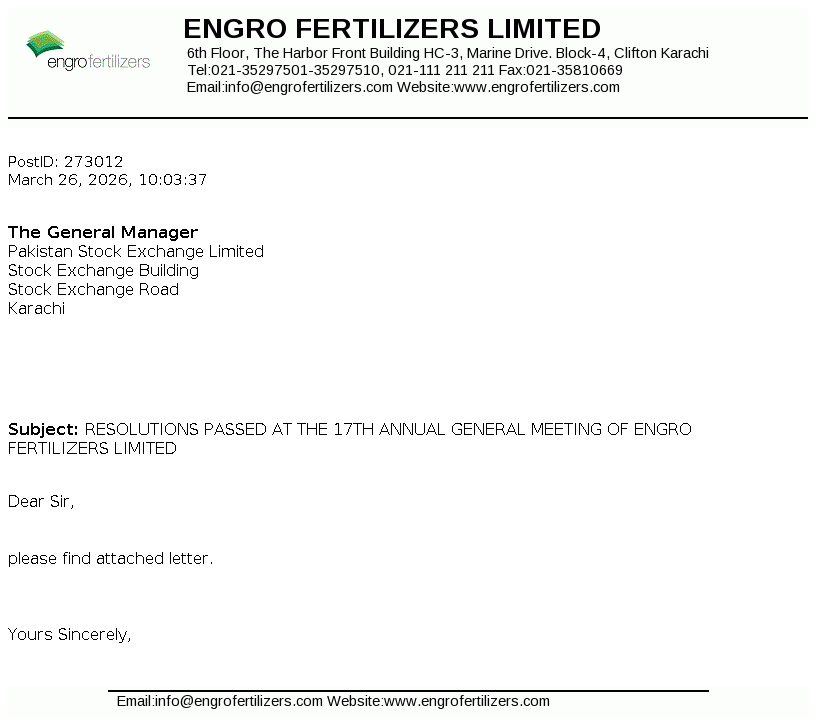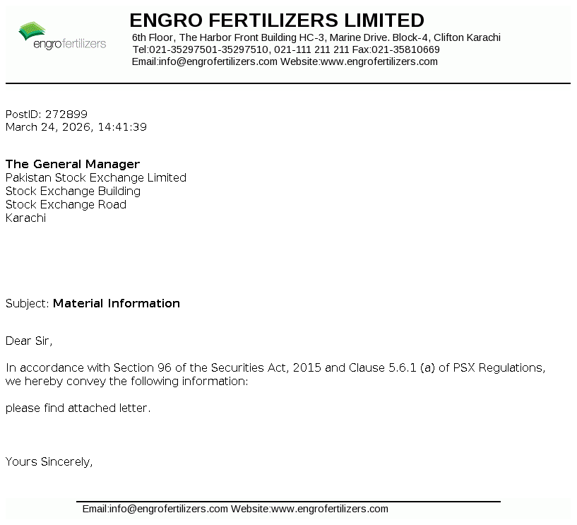 Engro Fertilizers Limited is a public company incorporated in Pakistan on June 29, 2009 as a wholly owned subsidiary of Engro Corporation Limited (the Holding Company), which is a subsidiary of Dawood Hercules Corporation Limited (the Ultimate Parent Company). The Company is engaged in the manufacturing, purchasing and marketing of fertilizers, seeds and pesticides and providing logistics services.