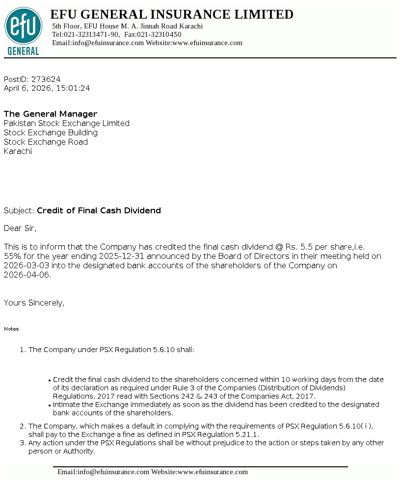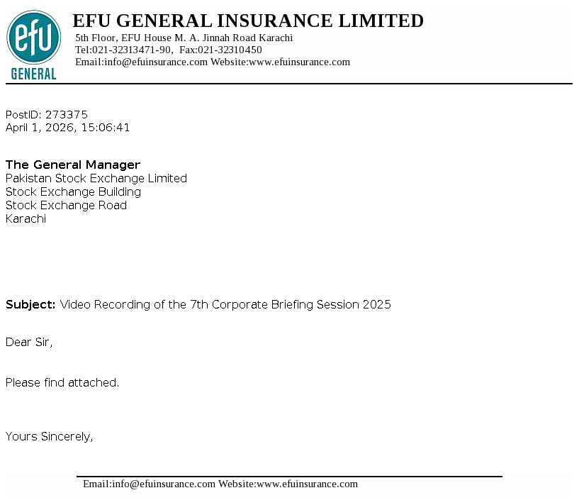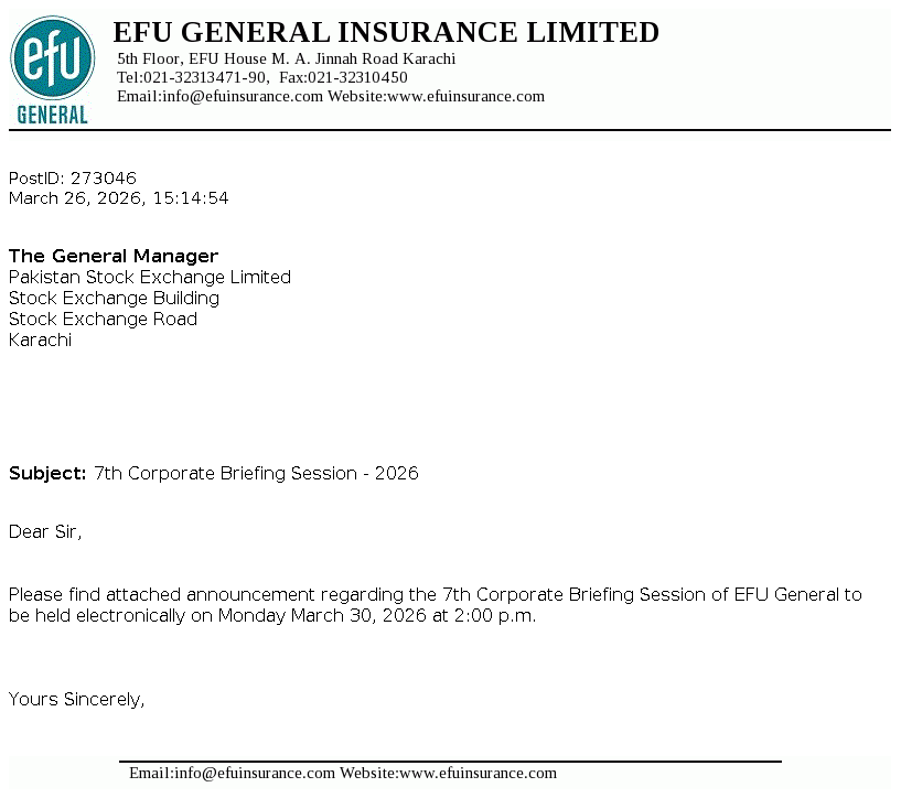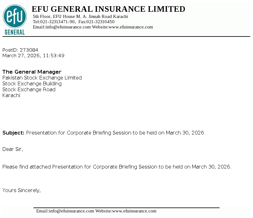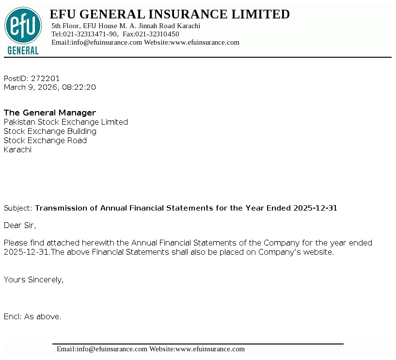 EFU General Insurance Limited was incorporated as a public limited company on 2 September 1932. The Company is engaged in non-life insurance business comprising of fire and property, marine, motor, miscellaneous etc.