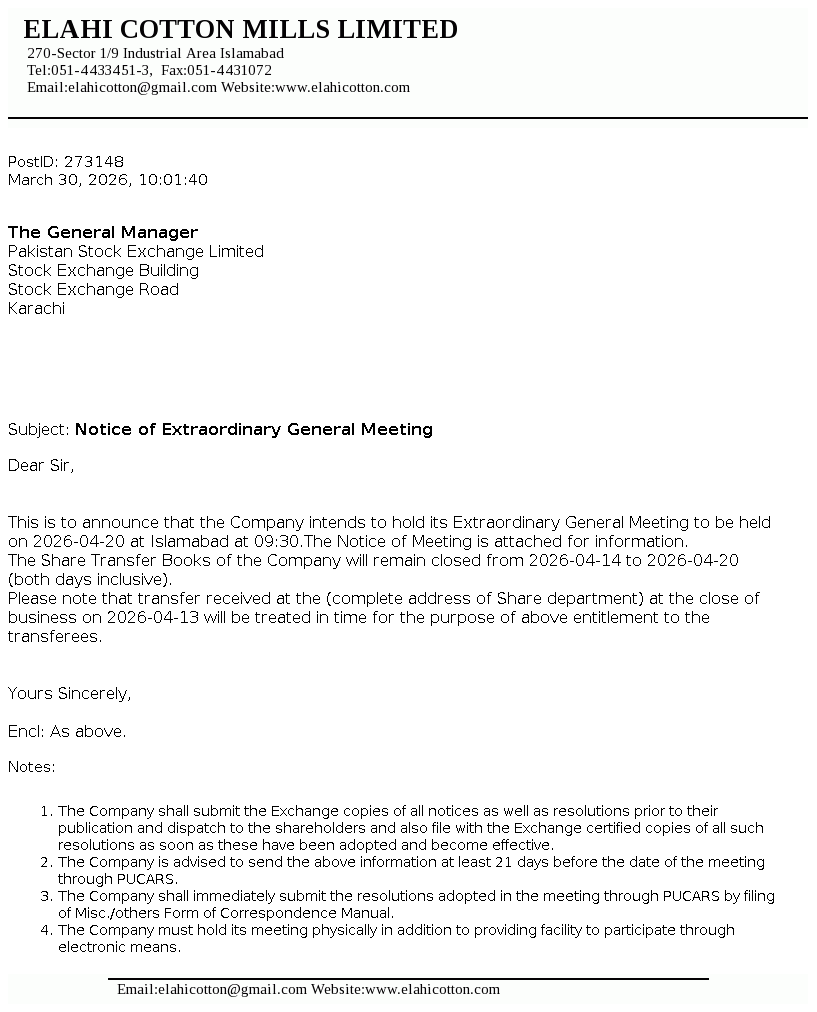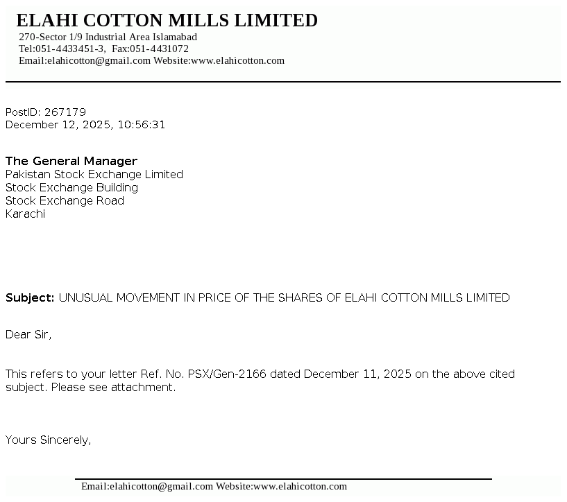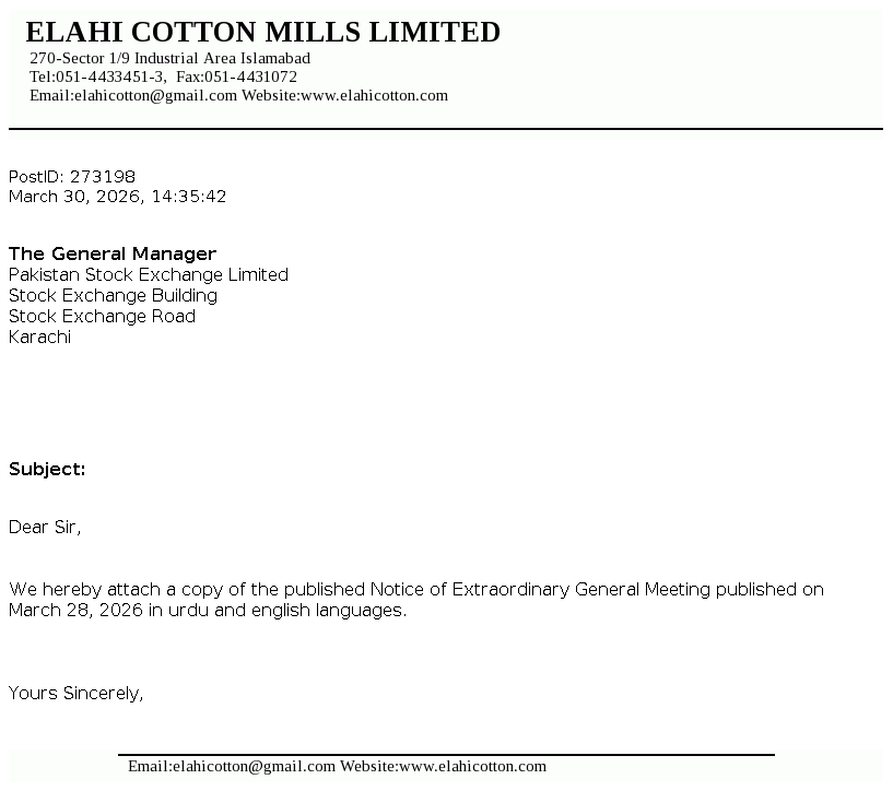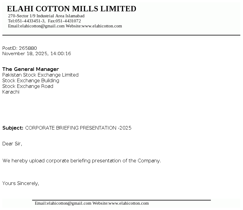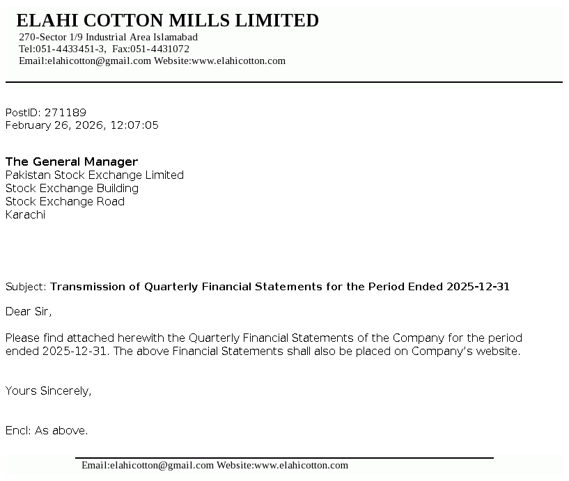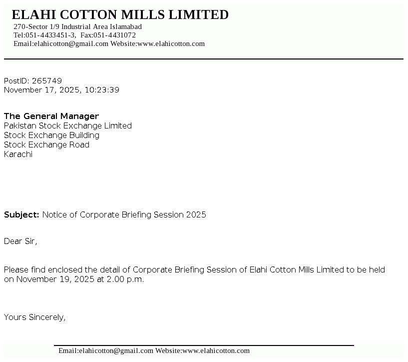 Elahi Cotton Limited was incorporated as a public limited company on June 22, 1970 under the repealed Companies Act, 1913 (now the Companies Act, 2017). The principle business of the company is manufacture and sale of yarn.