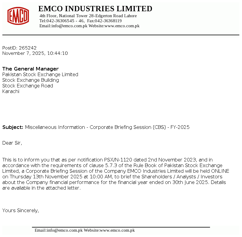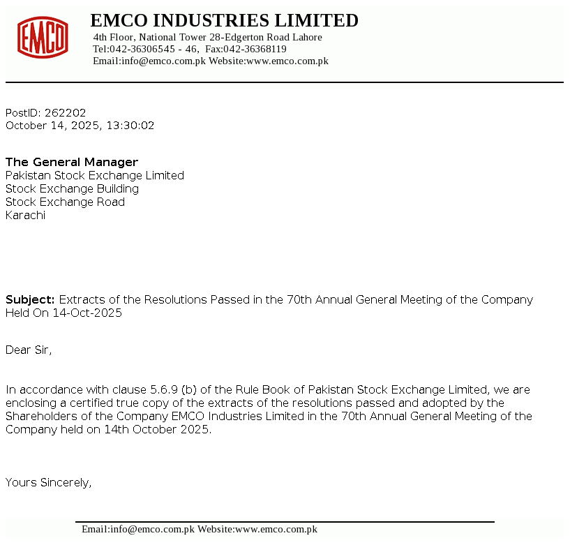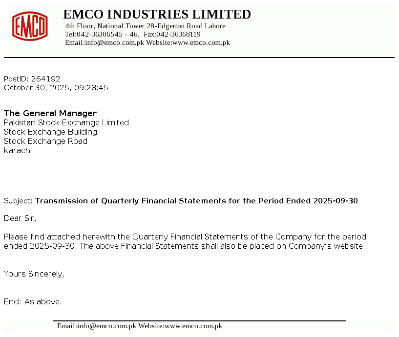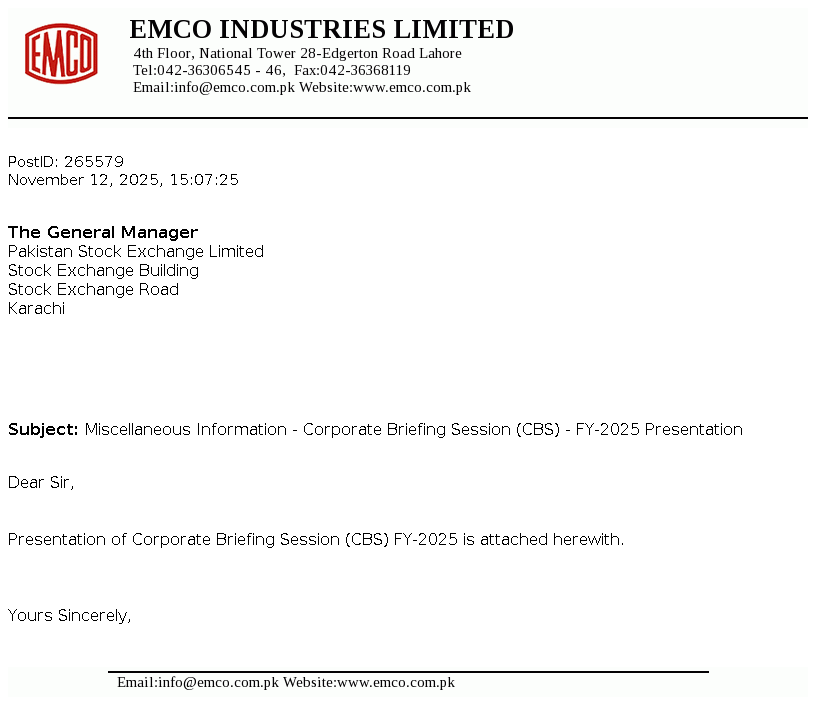 EMCO Industries Limited was incorporated as a Joint Stock Company in Pakistan under the repealed Companies Act, 1913, (now the Companies Act, 2017) on August 17, 1954 by the name of Electric Equipment Manufacturing Company (Private) Limited. Later, it was converted into a public company on August 20, 1983 and its name was changed to EMCO Industries Limited on September 12, 1983. The Company is principally engaged in the manufacture and sale of high / low tension electrical porcelain insulators and switchgear.