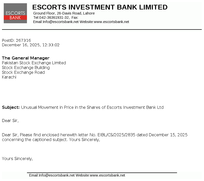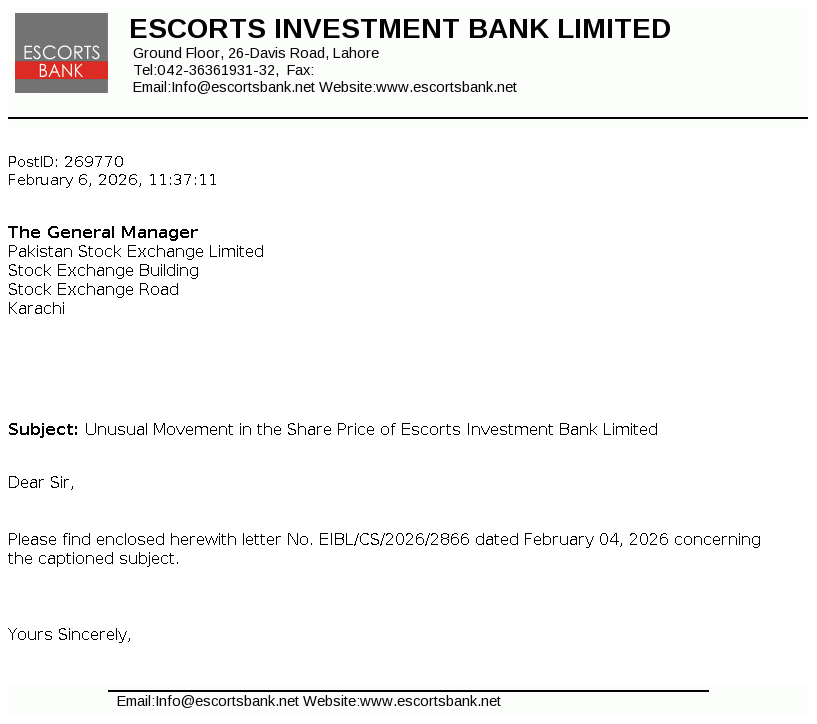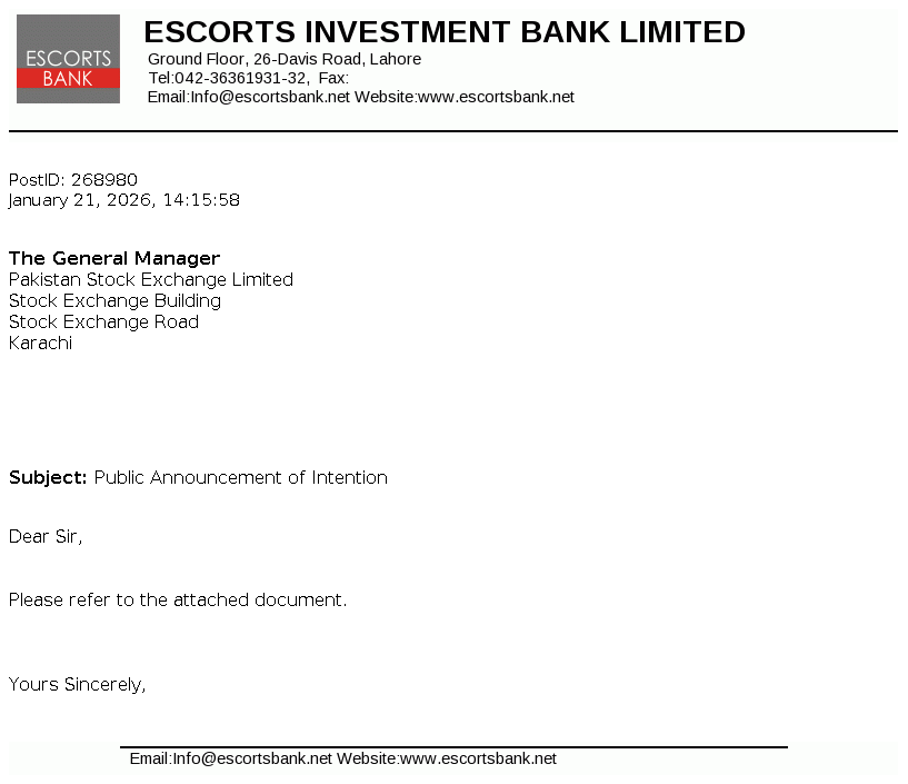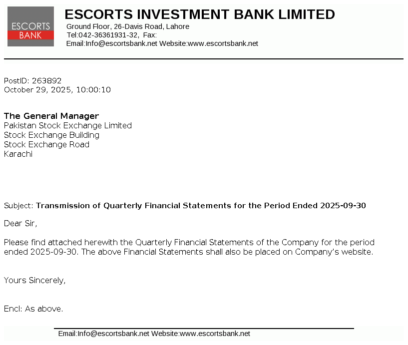 Escorts Investment Bank Limited is a public limited company incorporated in Pakistan under the provisions of the repealed Companies Ordinance, 1984 (Now the Companies Act, 2017) on 15 May 1995. The Company started its commercial operations on 16 October 1996. The Company is licensed to carry out investment finance services, as a Non-Banking Finance Company under Section 282-C of the Companies Ordinance, 1984 and Non-Banking Finance Companies (Establishment and Regulations) Rules, 2003.