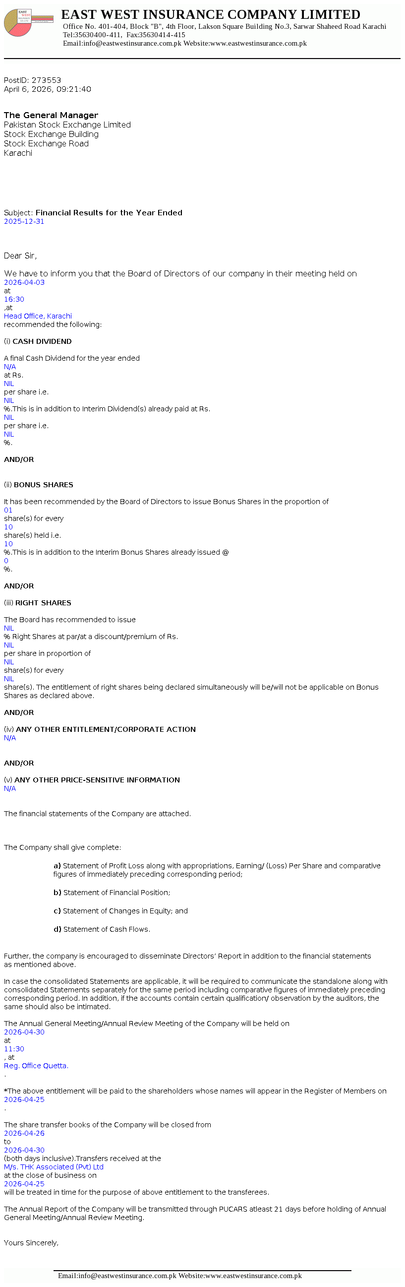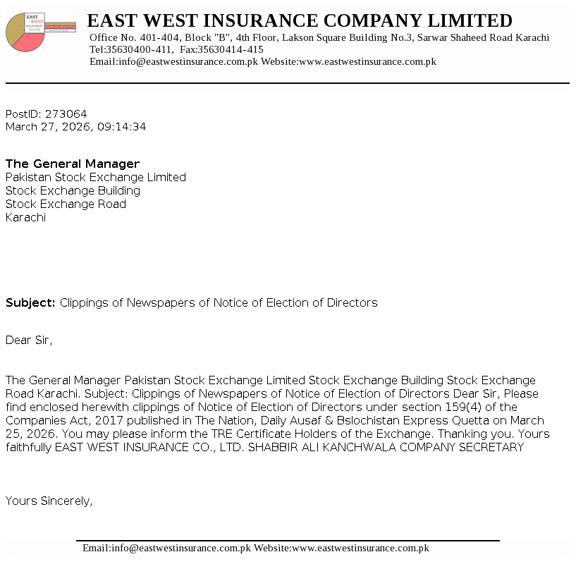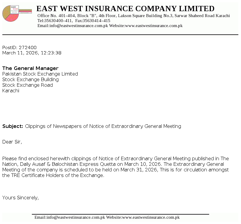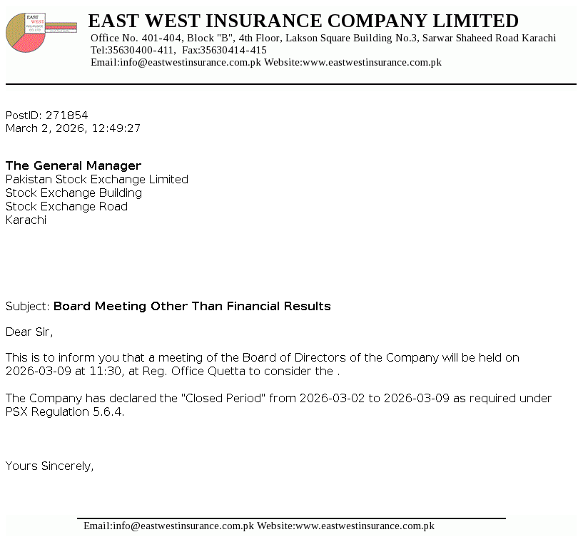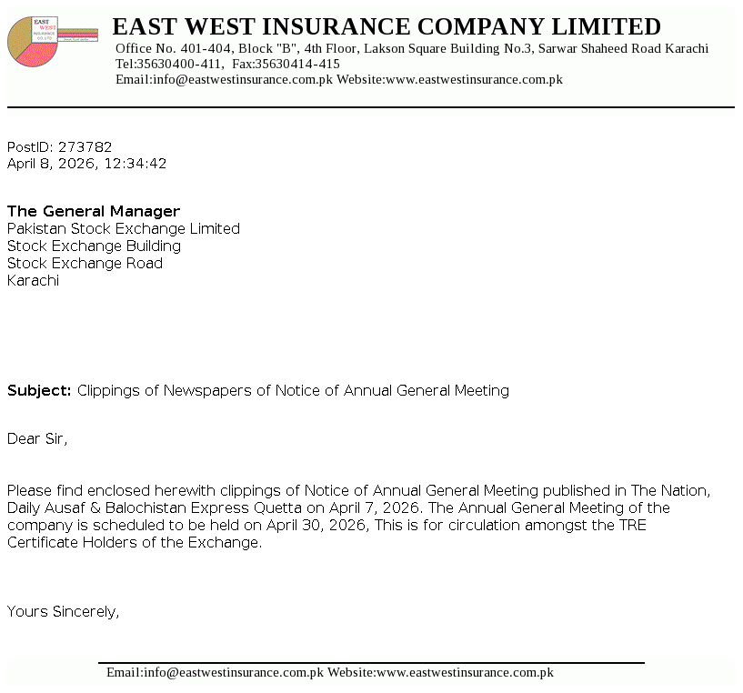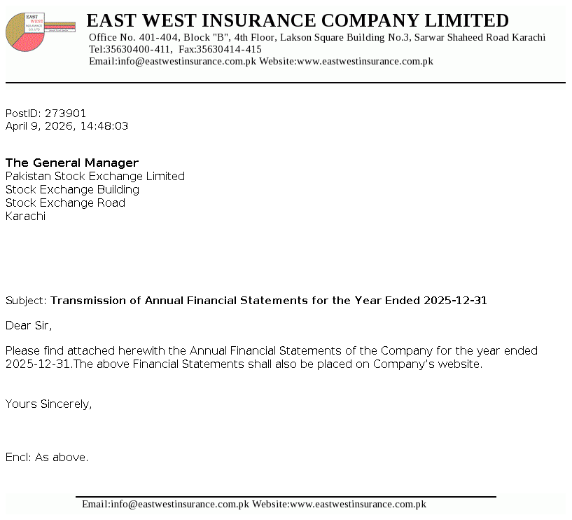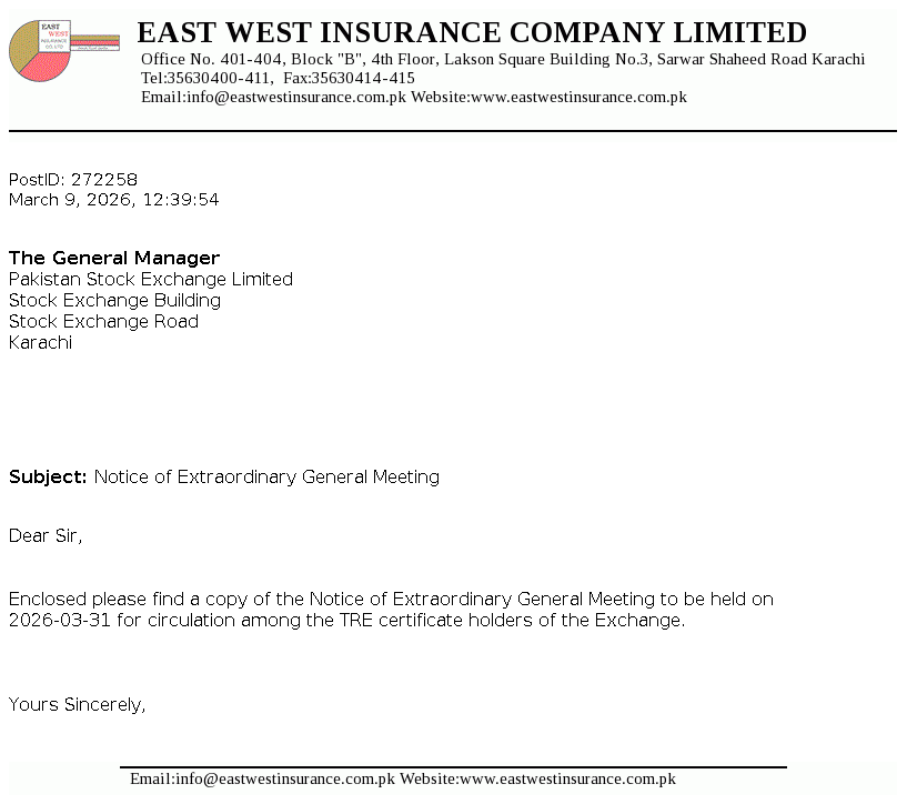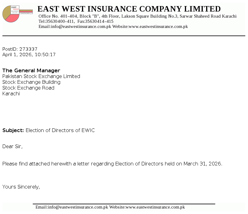 East West Insurance Company Limited was incorporated as a public limited company in the year 1983 under the repealed Companies Act, 1913 (now Companies Act, 2017). The Company is engaged in the general insurance business comprising of fire and property, marine, aviation and transport, motor and miscellaneous etc. The company commenced Window Takaful Operations (WTO) from May 08, 2018 as per Securities and Exchange Commission of Pakistan (SECP) Takaful Rules, 2012.