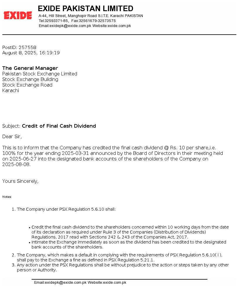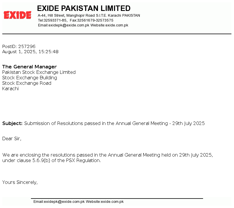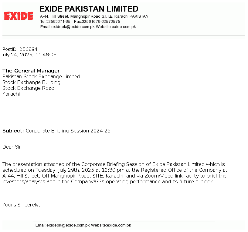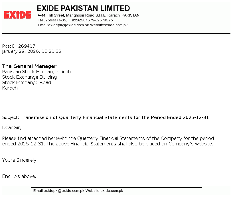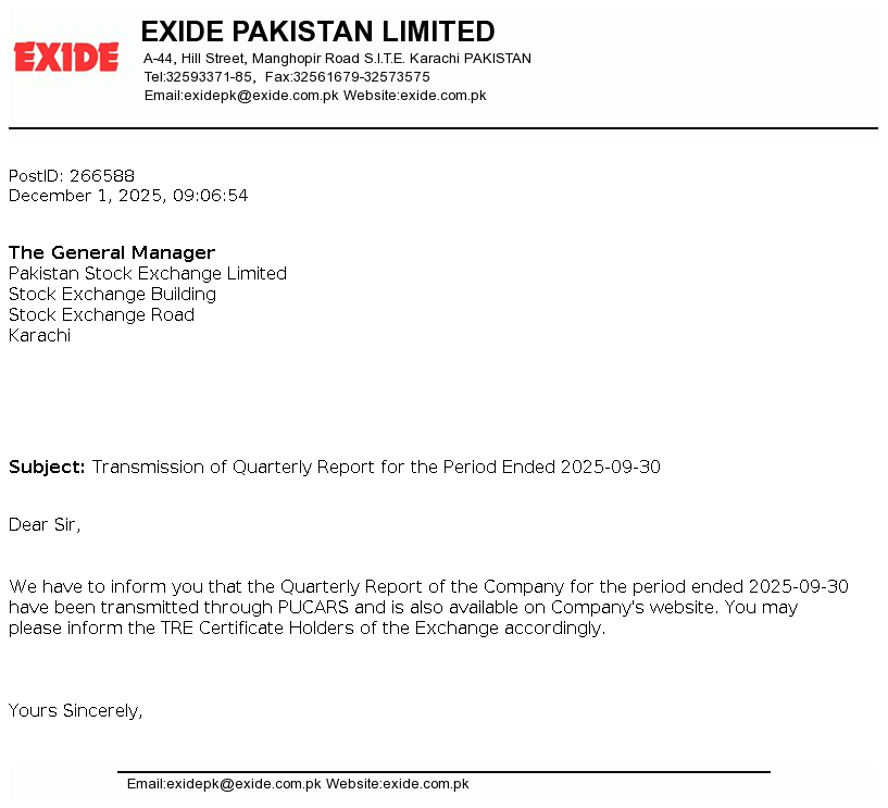 Exide Pakistan Limited is a public limited company and is incorporated in Pakistan. The Company is engaged in the manufacturing and sale of batteries, chemicals and acid and also supply solar energy solutions.