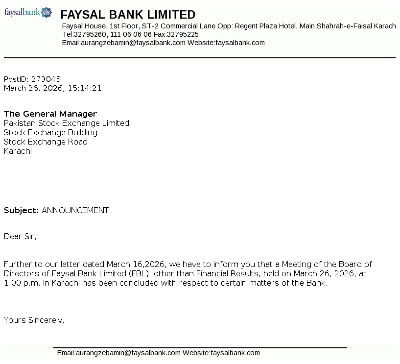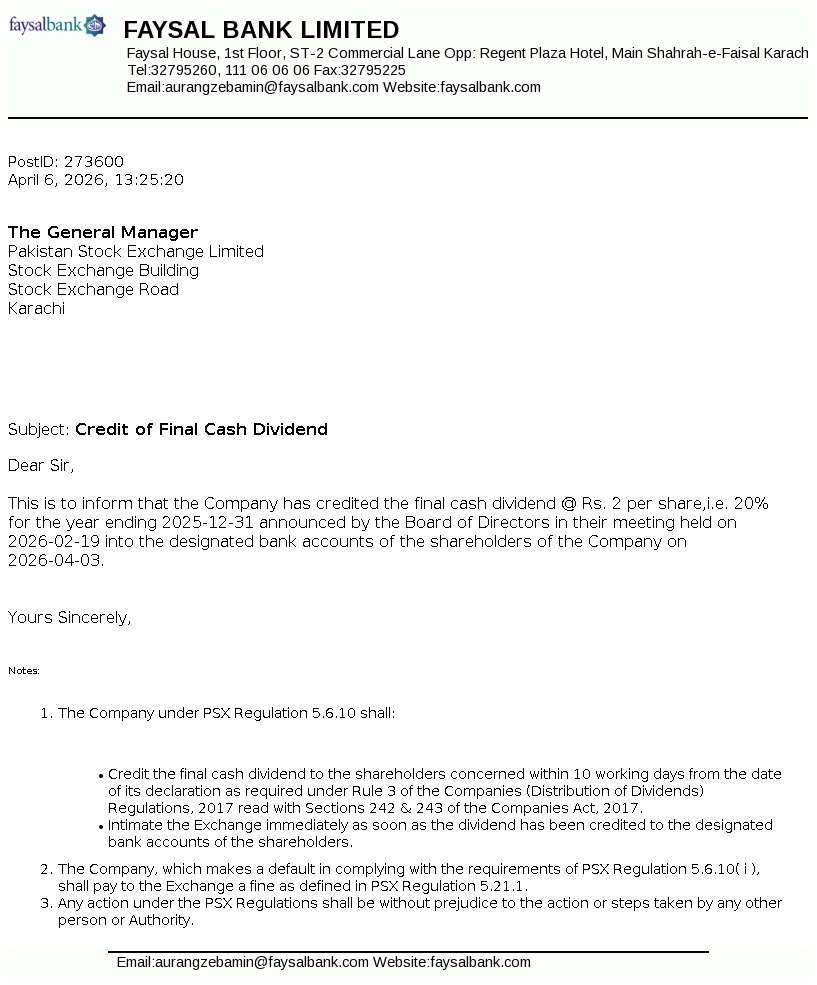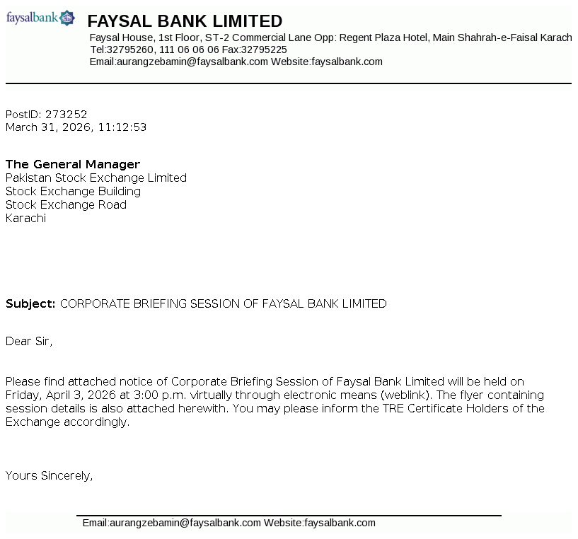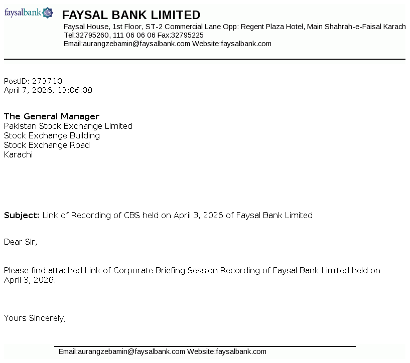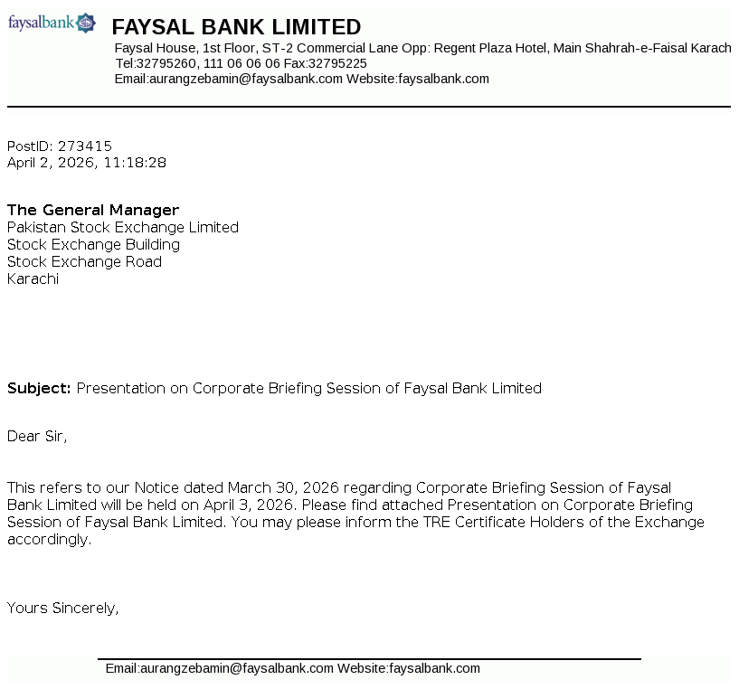 Faysal Bank Limited Faysal House, St-02, Commercial Lane, Main Shahrah-e-Faisal, Karachi, Pakistan.