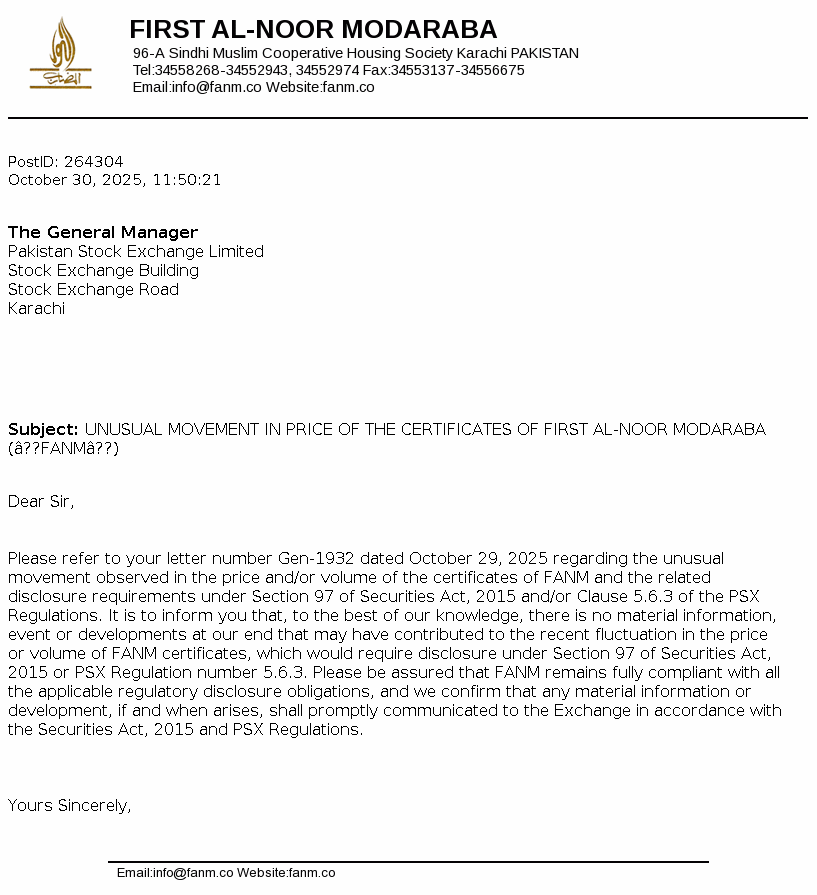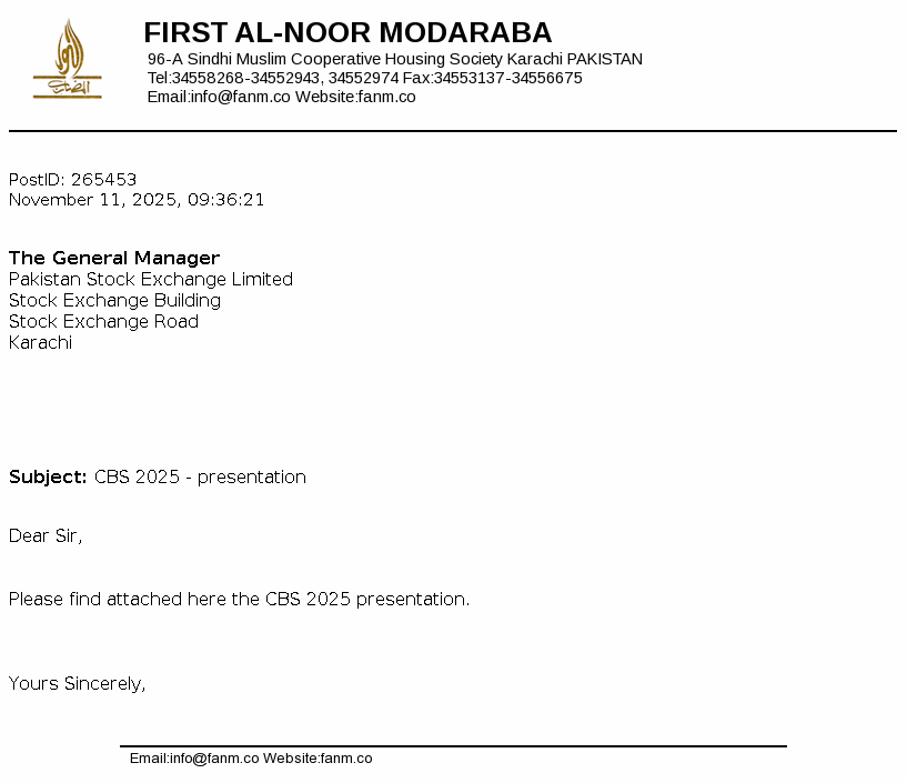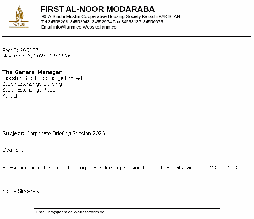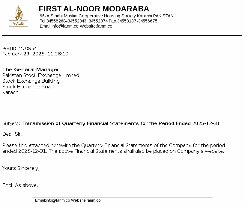 The First Al-Noor Modaraba was formed under the Modaraba Companies and Modaraba (Floatation and Control) Ordinance, 1980 and the rules framed thereunder and is managed by Al-Noor Modaraba Management (Private) Limited, a company incorporated in Pakistan. The Modaraba is a perpetual, multi purpose and multi dimensional Modaraba and is primarily engaged in providing Ijarah financing, Musharakah, Diminishing Musharakah, Musawamah, equity investment and other Shariah compliant trading activities.