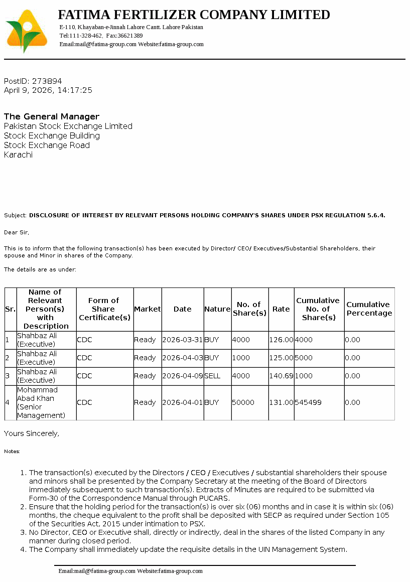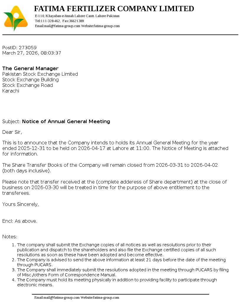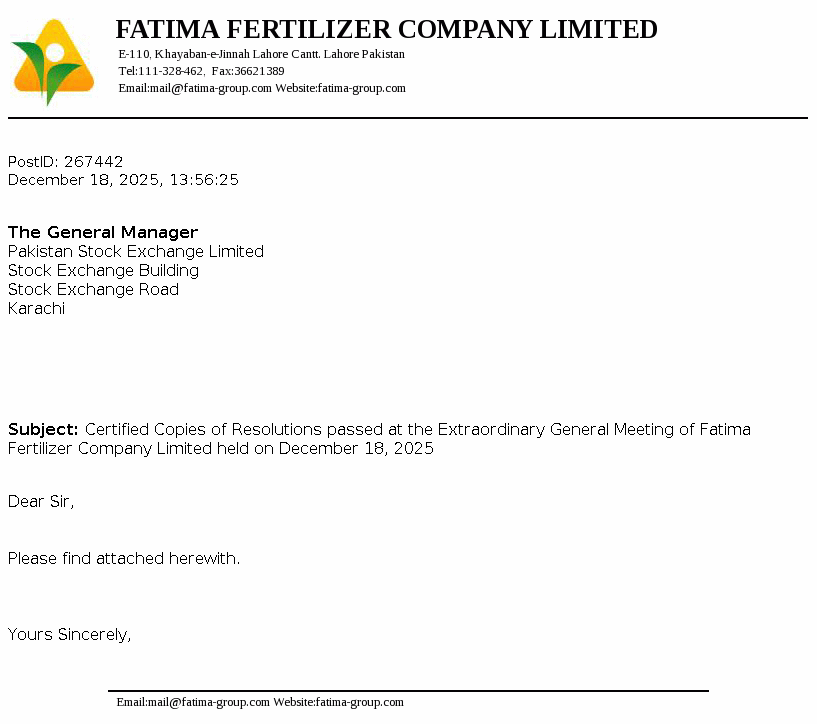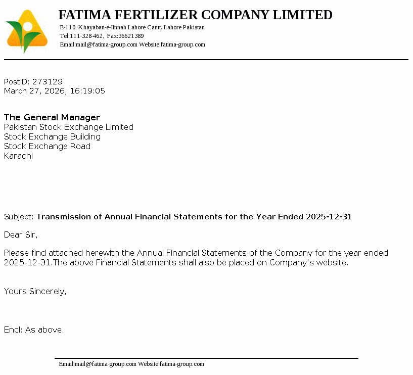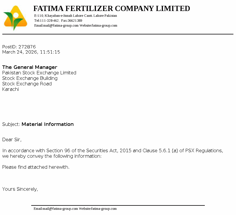 Fatima Fertilizer Company Limited was incorporated in Pakistan on December 24, 2003 as a public company under the repealed Companies Ordinance, 1984 (now Companies Act, 2017). The principal activity of the Company is manufacturing, producing, buying, selling, importing and exporting fertilizers and chemicals.