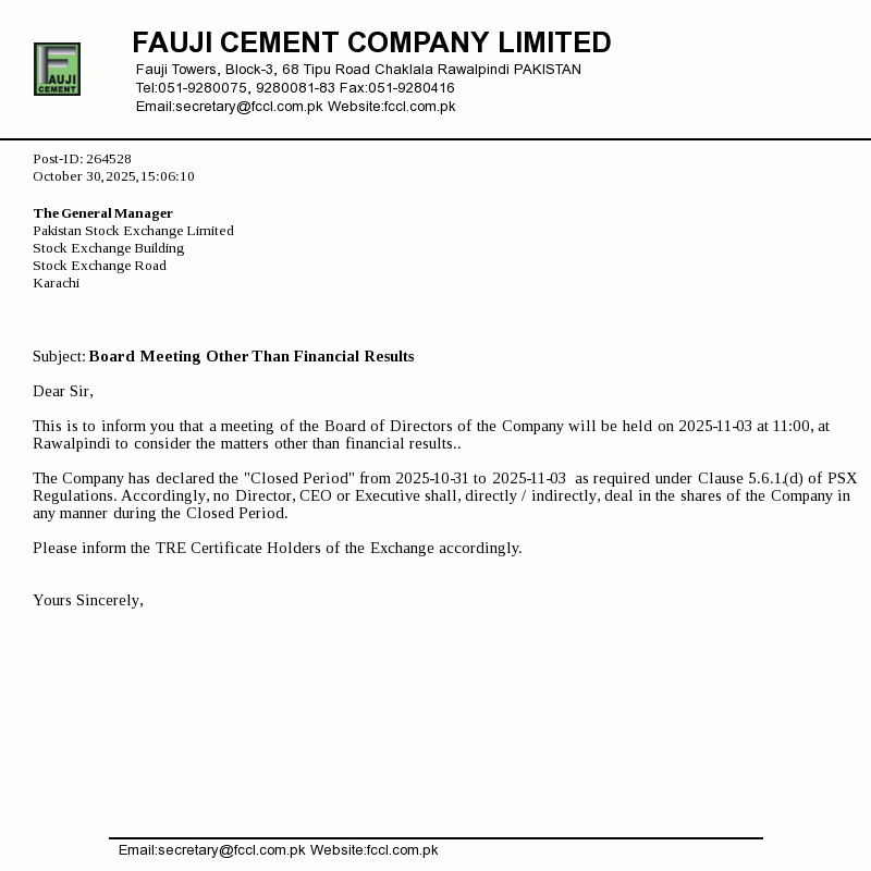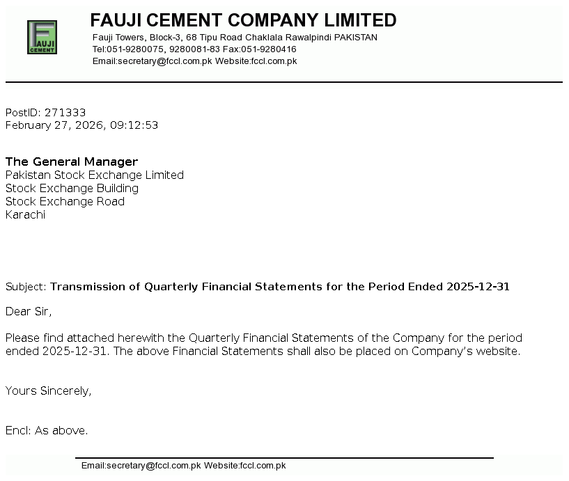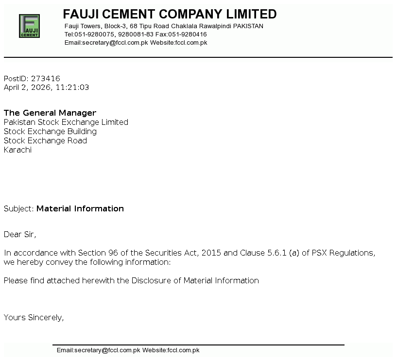 Fauji Cement Company Limited is a public limited company incorporated in Pakistan on 23 November 1992 under the Companies Ordinance, 1984 (Repealed with the enactment of the Companies Act, 2017 on May 30, 2017). The Company commenced its business with effect from 22 May 1993. The principal activity of the Company is manufacturing and sale of different types of cement.