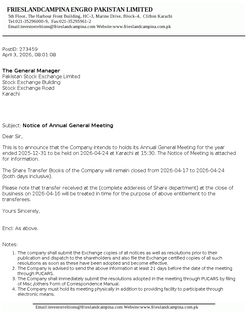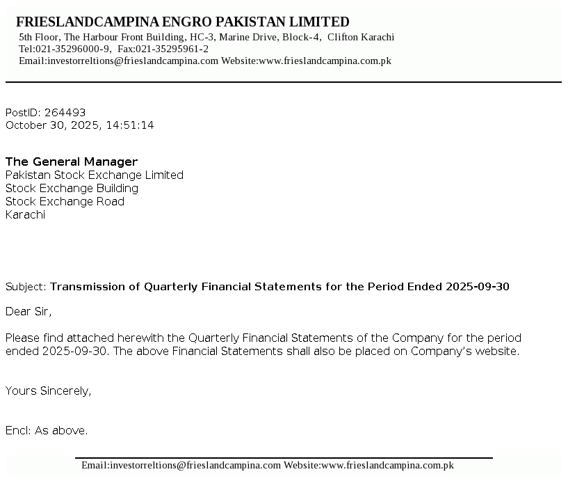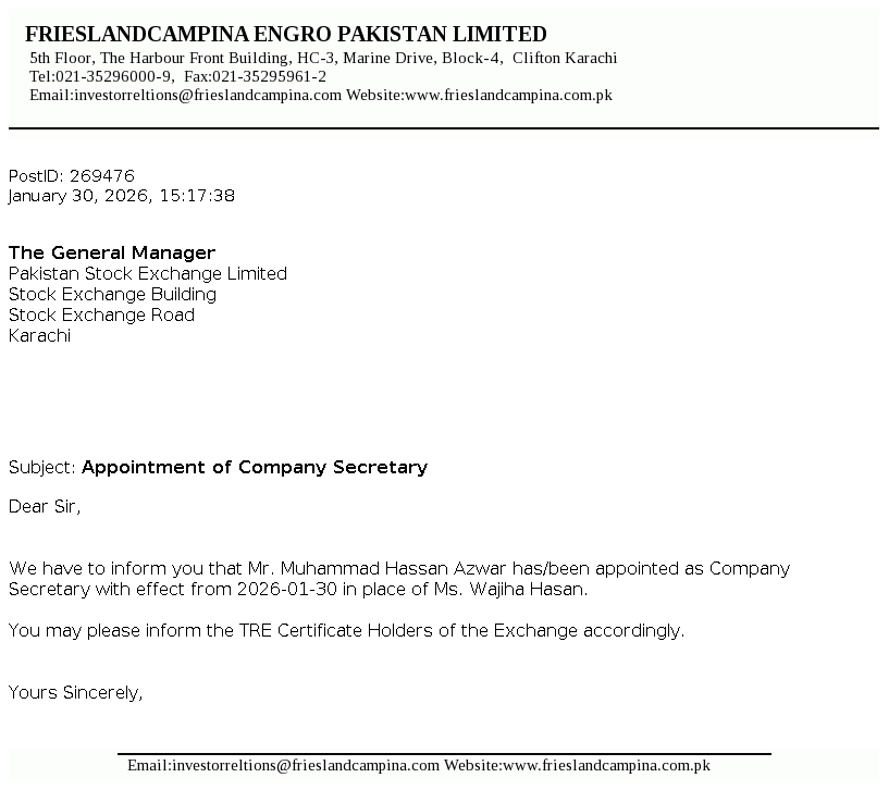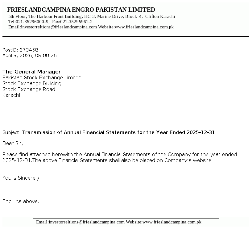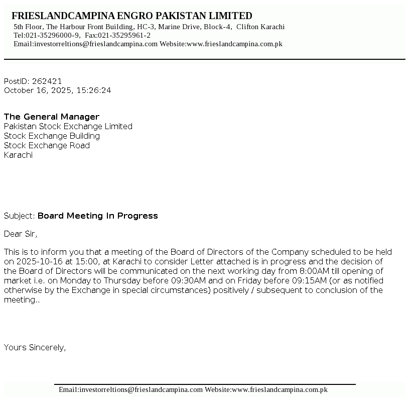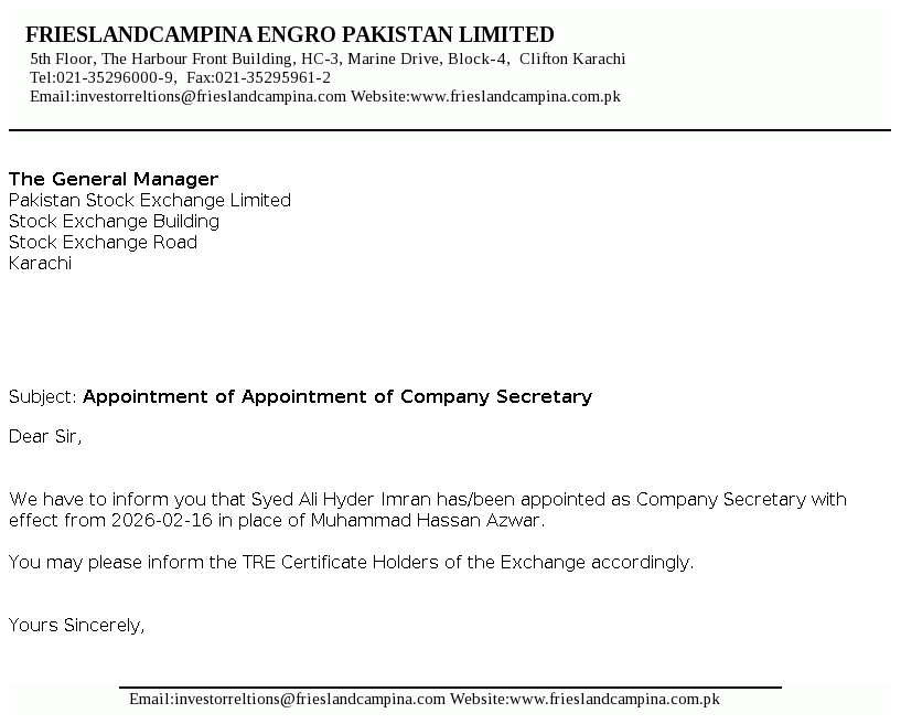 FrieslandCampina Engro Pakistan Limited, is a public listed company incorporated in Pakistan, under the repealed Companies Ordinance, 1984 (now the Companies Act 2017). The Company is a subsidiary of FrieslandCampina Pakistan Holdings B.V. (the Holding Company) which is a subsidiary of Zuivelcoöperatie FrieslandCampina UA (the Ultimate Parent Company). The principal activity of the Company is to manufacture, process and sell dairy based products and frozen desserts. The Company also owns and operates a dairy farm.