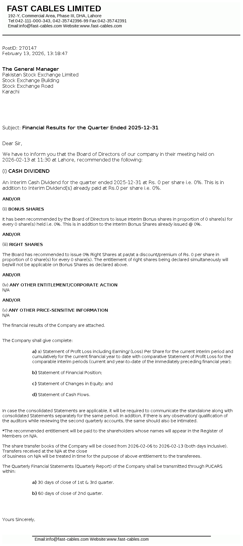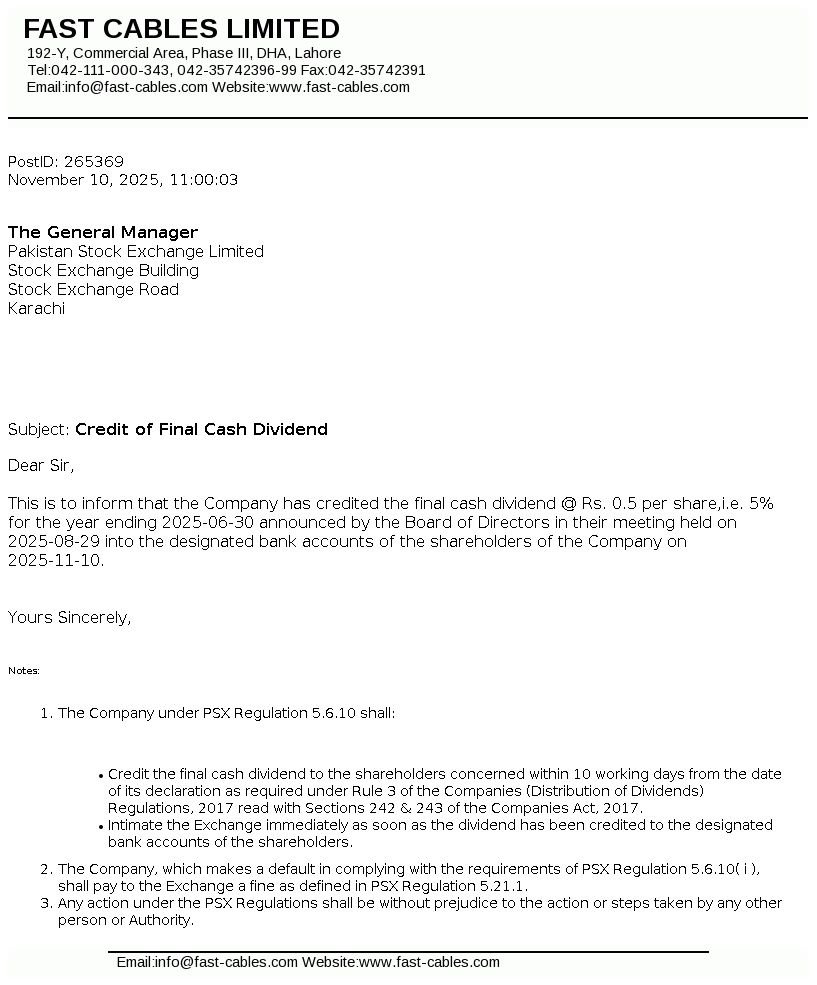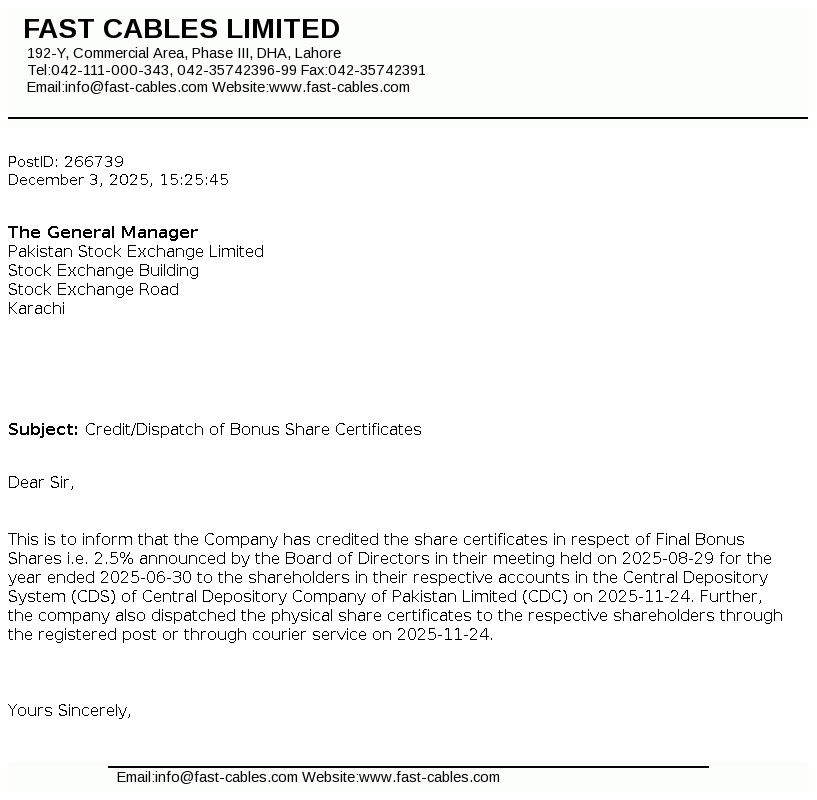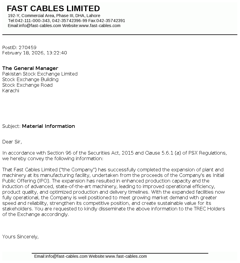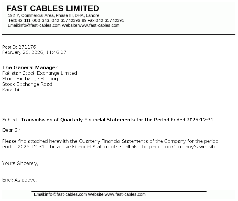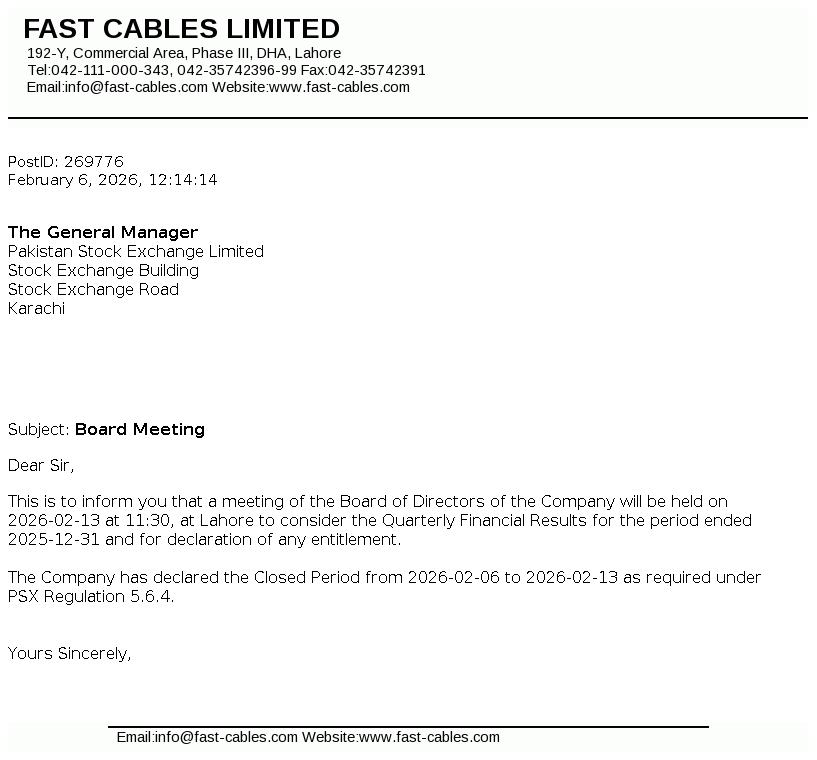 Fast Cables Limited, formerly registered as a partnership named Fast Cables & Co. on September 02, 1998, later incorporated as a public limited company on December 29, 2008 under the repealed Companies Ordinance, 1984 (now the Companies Act, 2017).The Company is engaged in manufacturing and selling of all types of electric wires, cables and conductors.