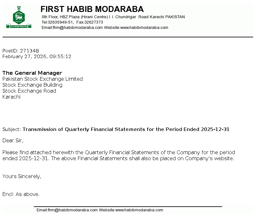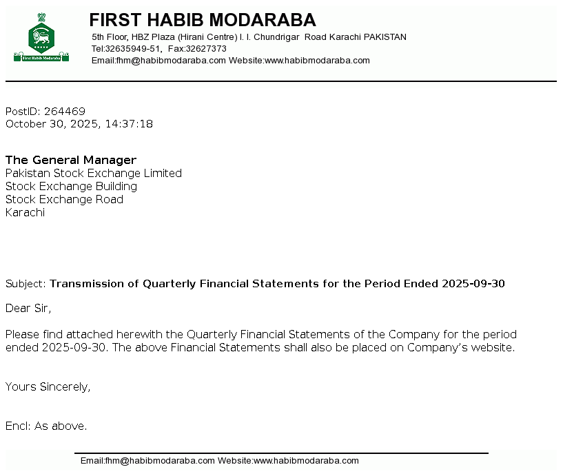First Habib Modaraba is a perpetual, multi-purpose modaraba managed by Habib Metropolitan Modaraba Management Company (Private) Limited. The Modaraba is engaged in the business of leasing, Musharaka, Murabaha financing and other related business.