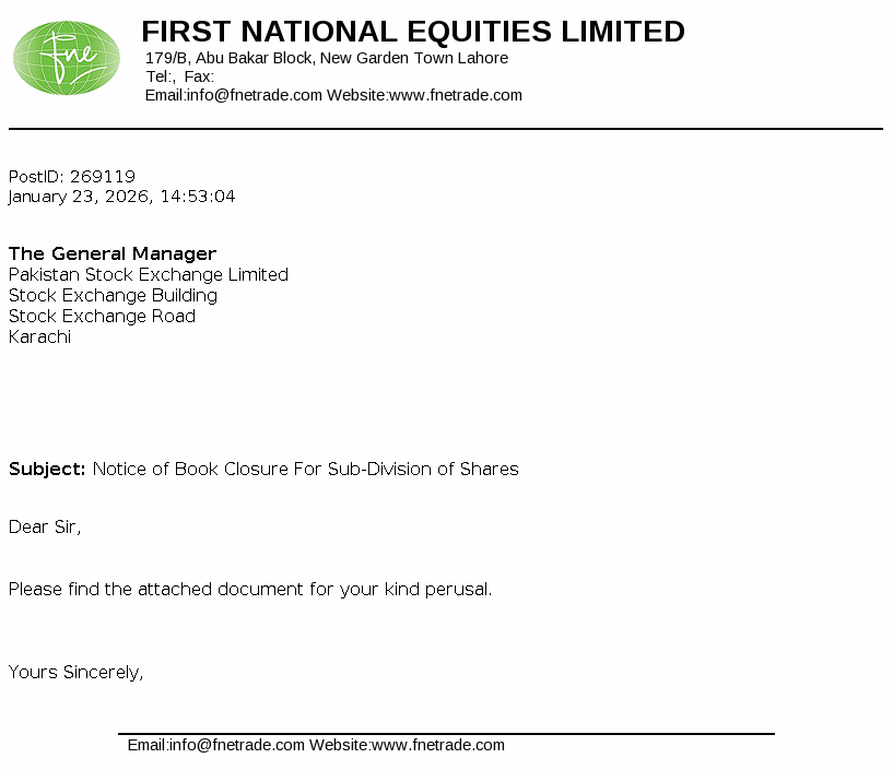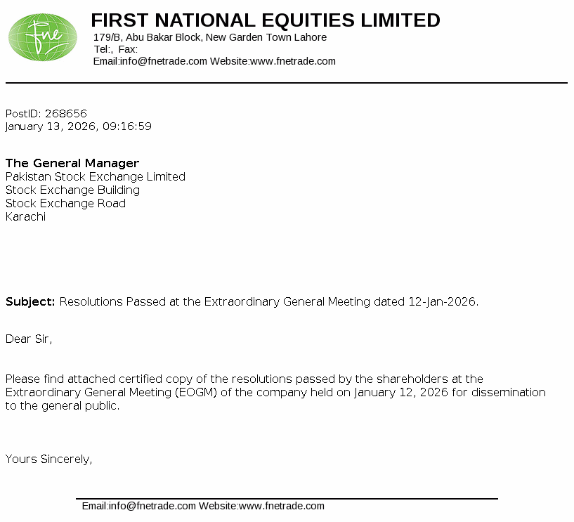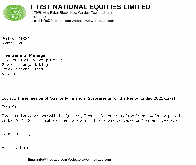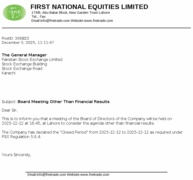 First National Equities Limited is a limited liability company incorporated in Pakistan under the Companies Ordinance , 1984 (now the Companies Act, 2017) . The company is a holder pf TREC of Pakistan Stock Exchange. The principal activities of the Company include shares brokerage, consultancy services and portfolio investments.