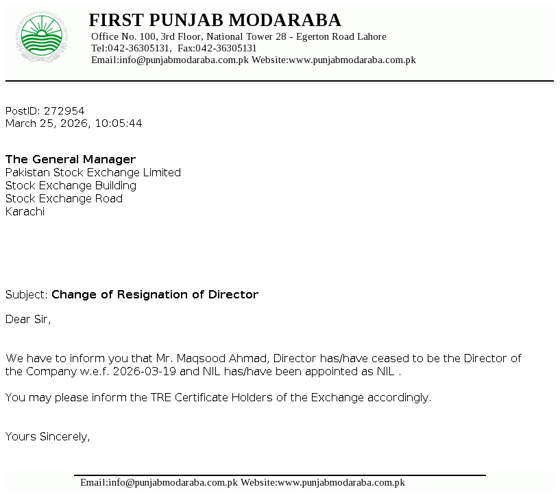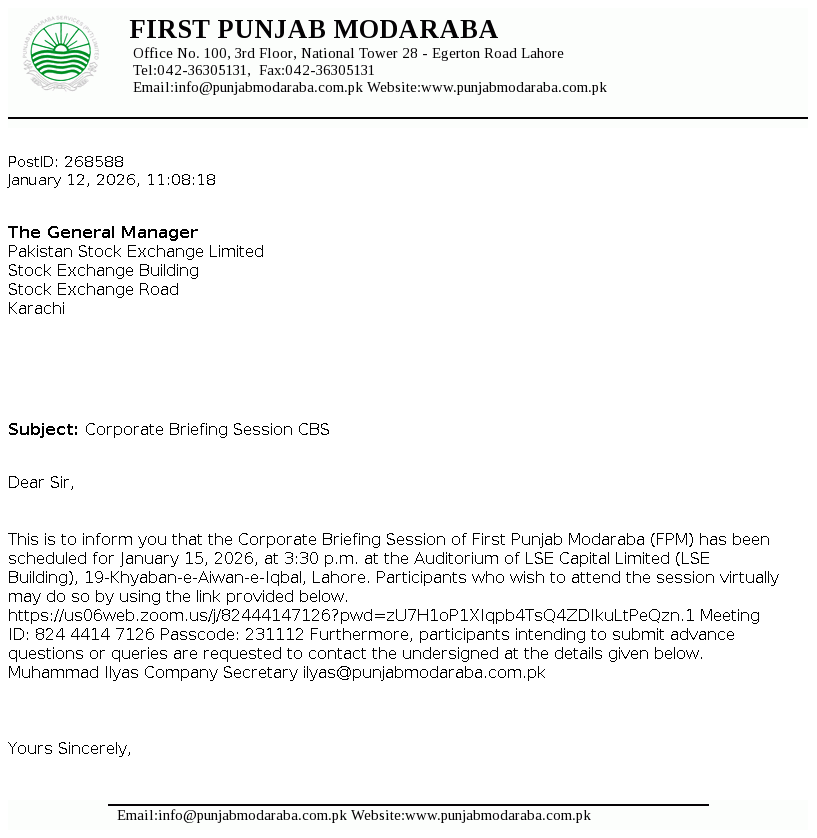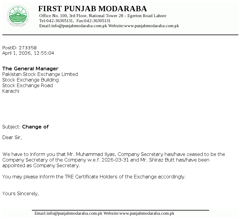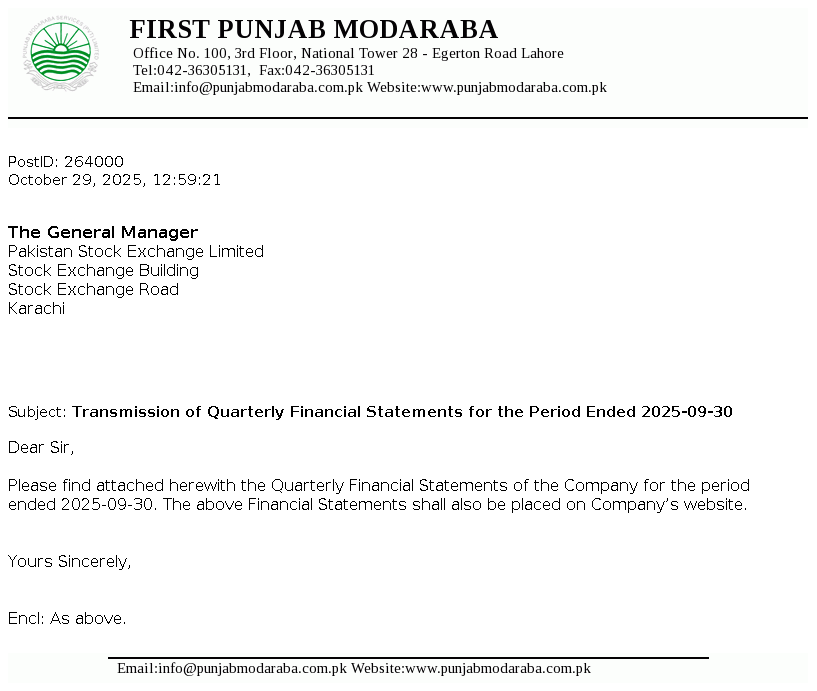 First Punjab Modaraba (the Modaraba) was formed under the Modaraba Companies and Modaraba (Floatation and Control) Ordinance, 1980 and is managed by Punjab Modaraba Services (Private) Limited. The Modaraba is a perpetual, multi purpose and multi dimensional modaraba and is primarily engaged in the business of ijarah, musharika and morabaha financing, equity investment and other related business in accordance with the injunctions of Islam