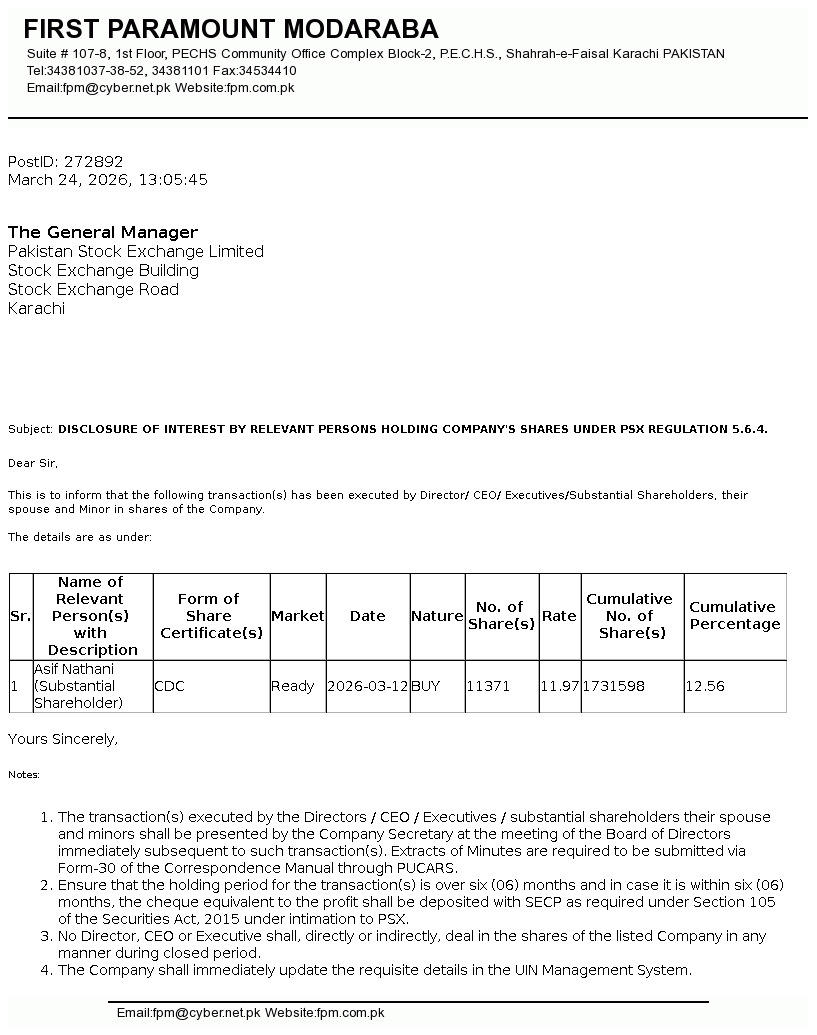 First Paramount Modaraba is a multi purpose, perpetual and multidimensional Modaraba floated under the Modaraba Companies and Modaraba (Floatation and Control) Ordinance, 1980. Modaraba's principal activities include deployment of funds on murabaha, modaraba and musharaka arrangements.