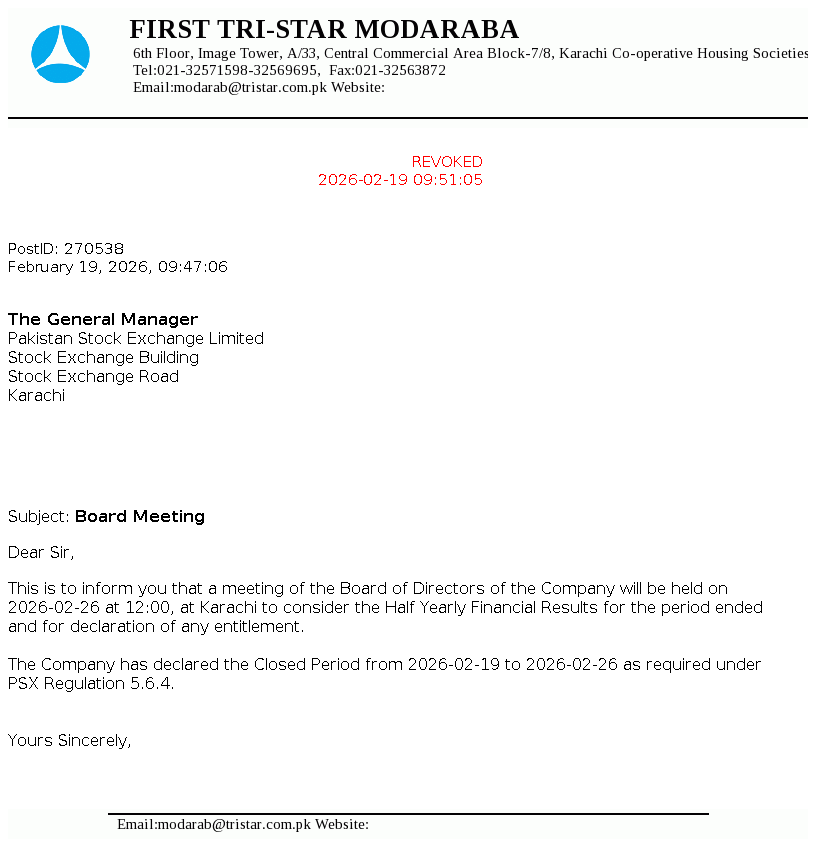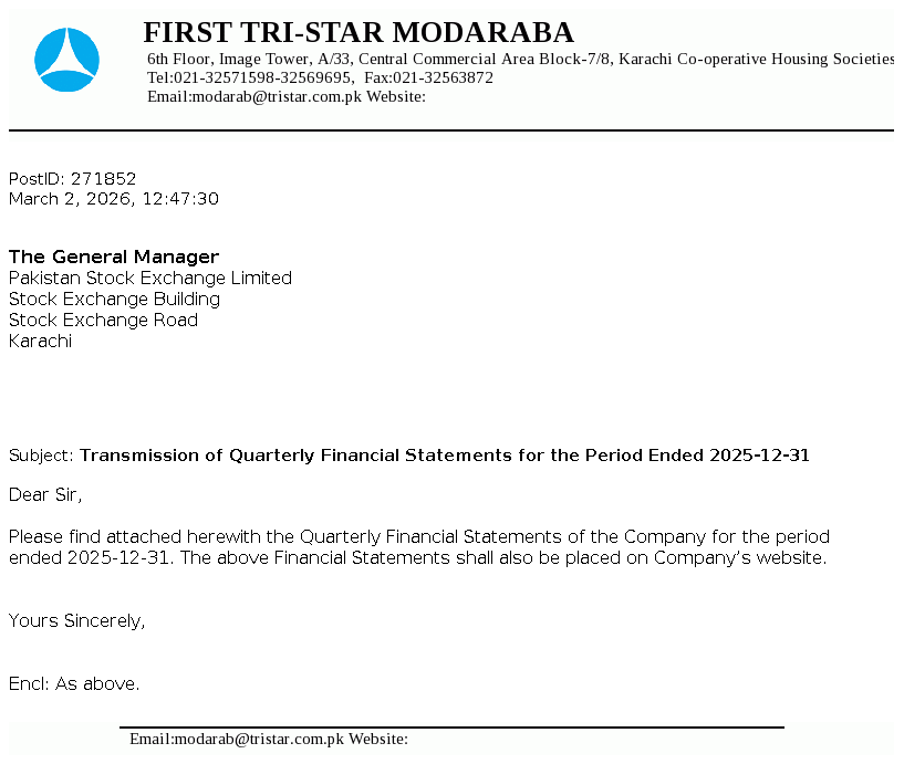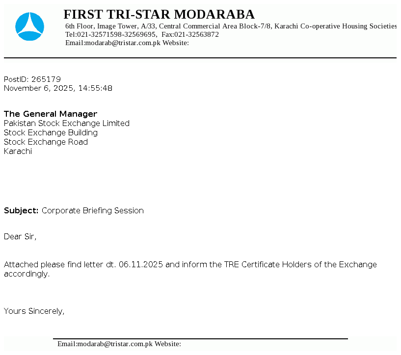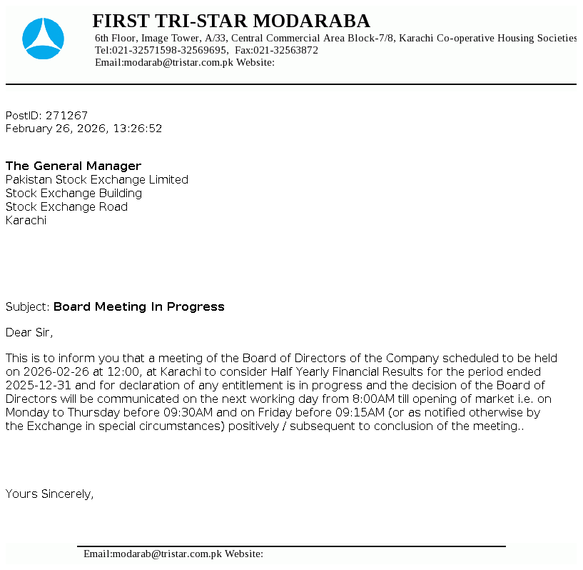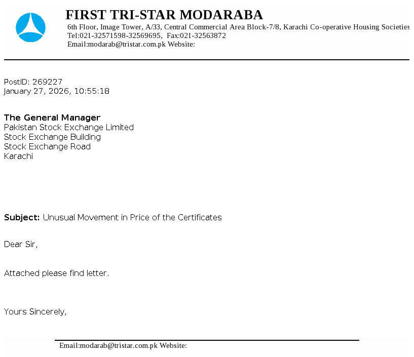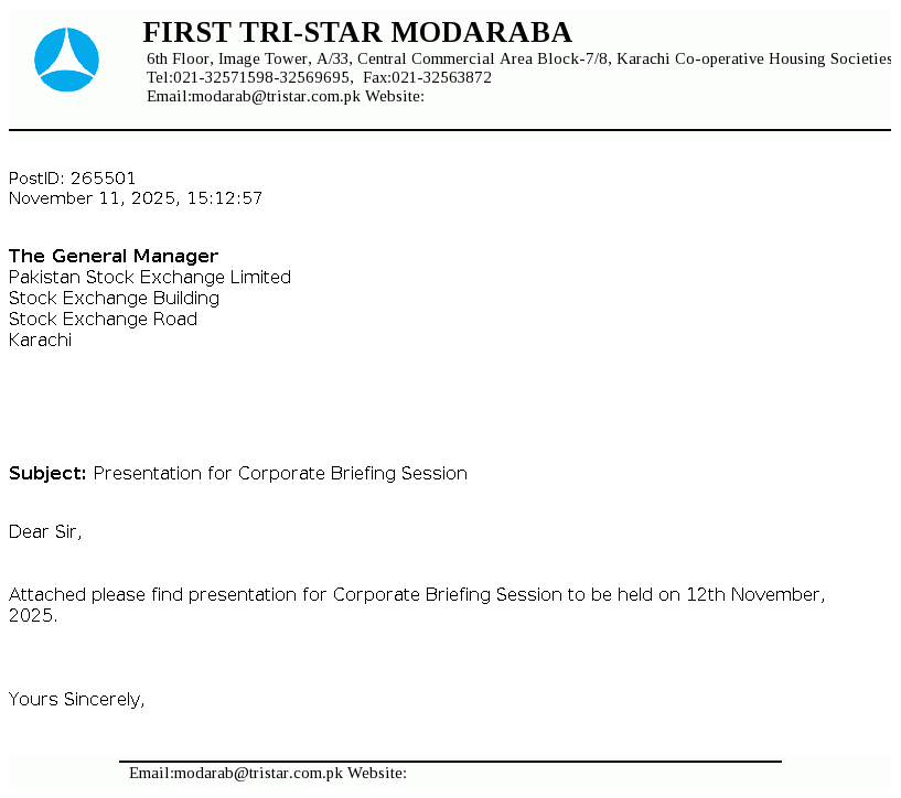First Tri-Star Modaraba was formed under the Modaraba Companies and Modaraba (Floatation and Control) Ordinance, 1980 and the Rules framed thereunder and is managed by A.R.T. Modaraba Management (Private) Ltd. It is a perpetual, multipurpose and multidimensional Modaraba