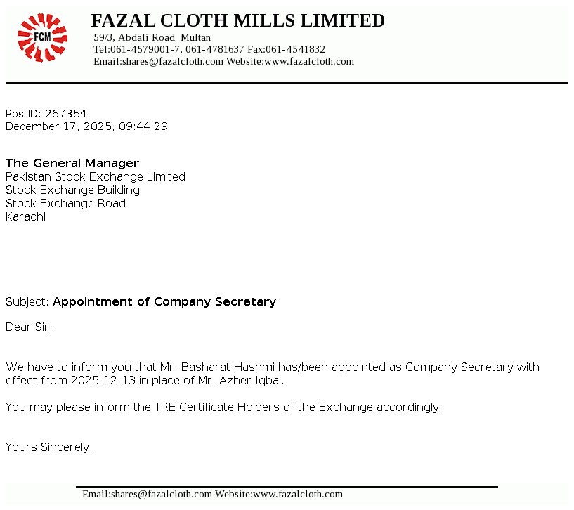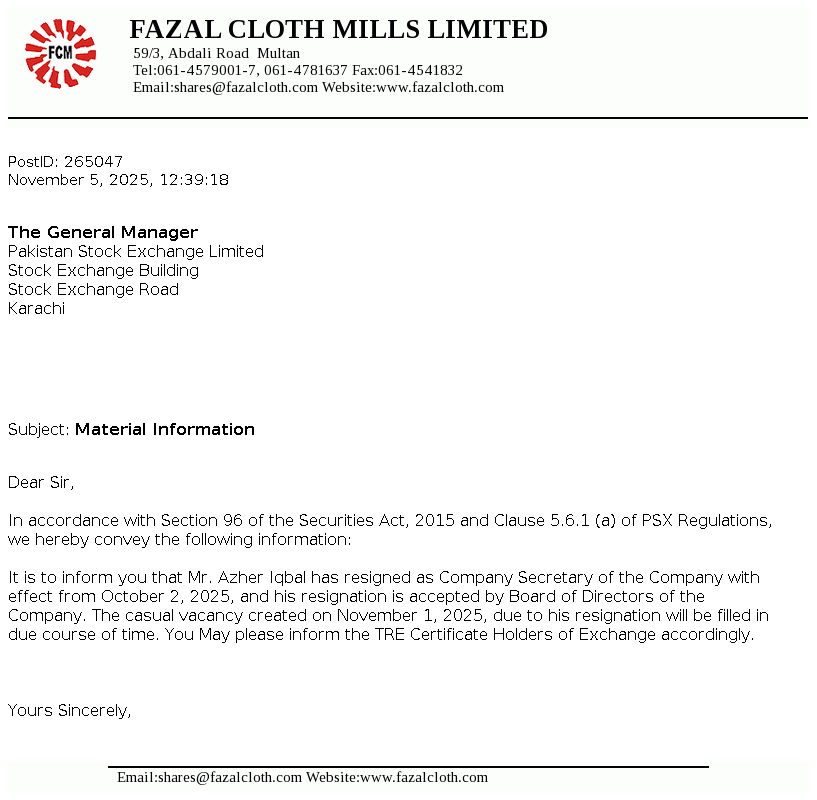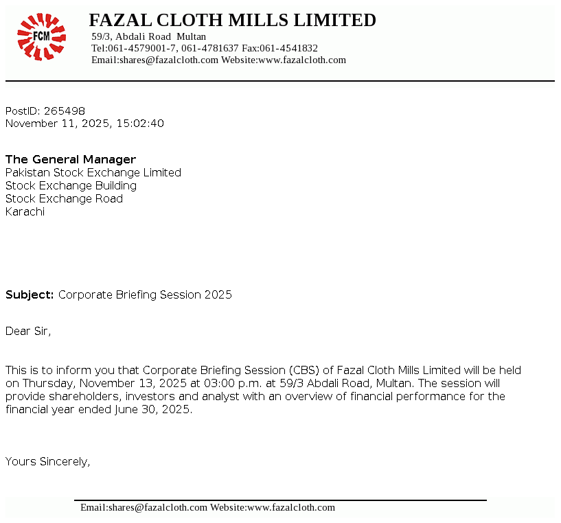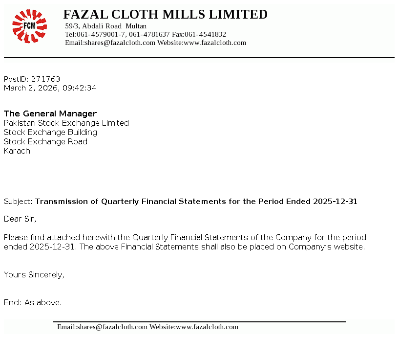 Fazal Cloth Mills Limited was incorporated in Pakistan in 1966 as a Public Limited Company under the Companies Act, 1913 (now the Companies Act, 2017). The Company is principally engaged in manufacture and sale of yarn and fabric.