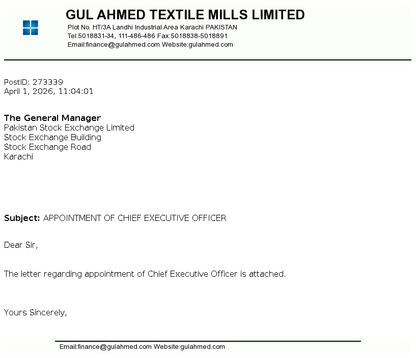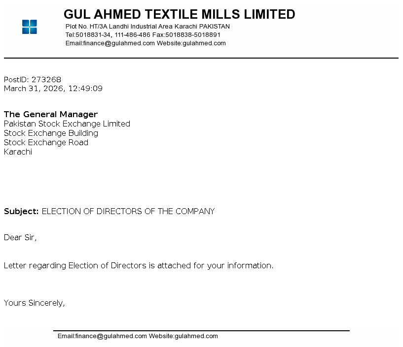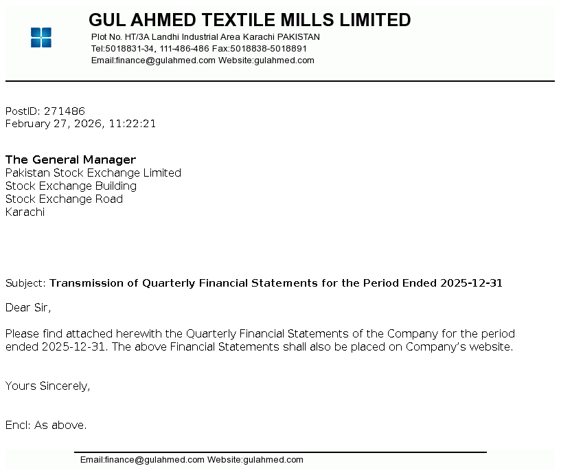 Gul Ahmed Textile Mills Limited was incorporated on April 01, 1953 in Pakistan as a private limited company, subsequently converted into public limited company on January 07, 1955. The Company is a composite textile mill and is engaged in the manufacture and sale of textile products. The Company is subsidiary of Gul Ahmed Holdings (Private) Limited.