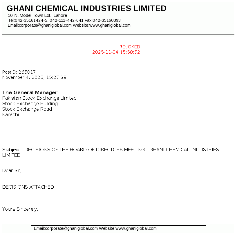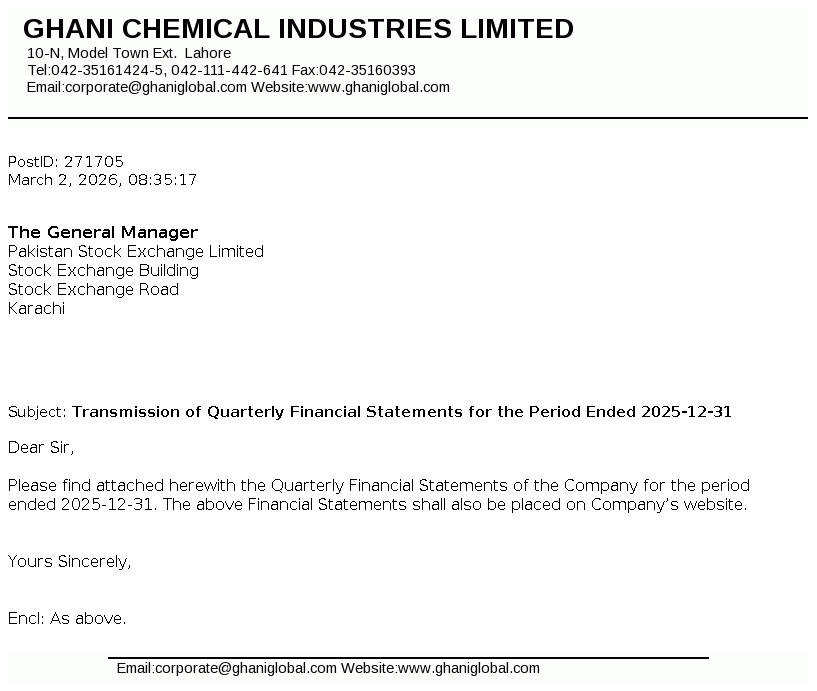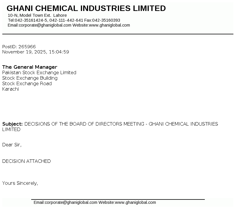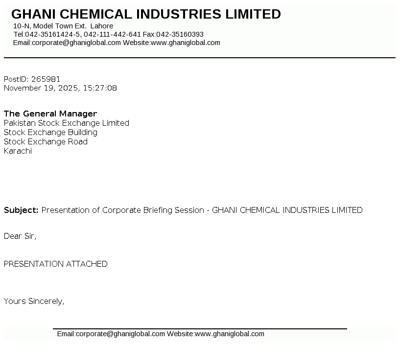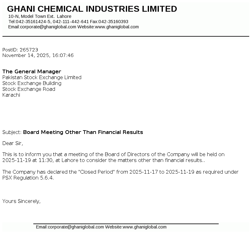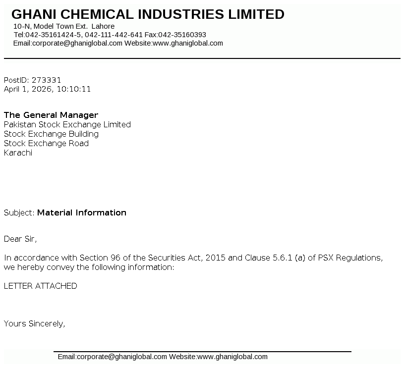 Ghani Chemical Industries Ltd. was incorporated in Pakistan as a private limited company on November 23, 2015 under the repealed Companies Ordinance, 1984 (now the Companies Act, 2017) and was converted into a public limited company on April 20, 2017. The Company is principally engaged in manufacturing, sale and trading of medical & industrial gases and chemicals.