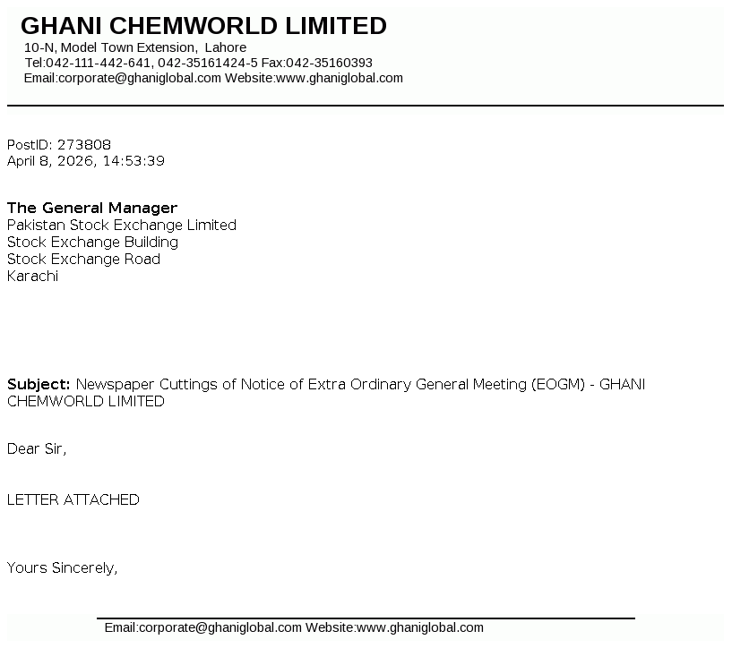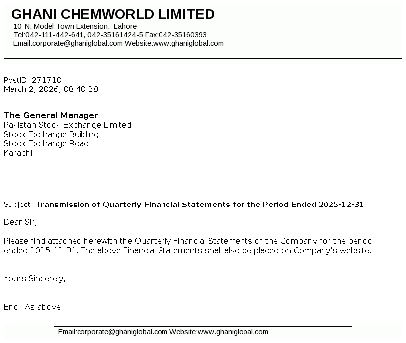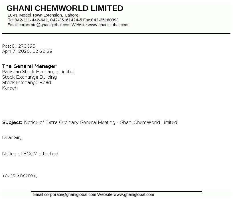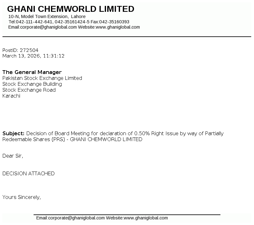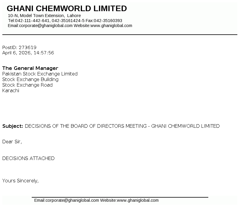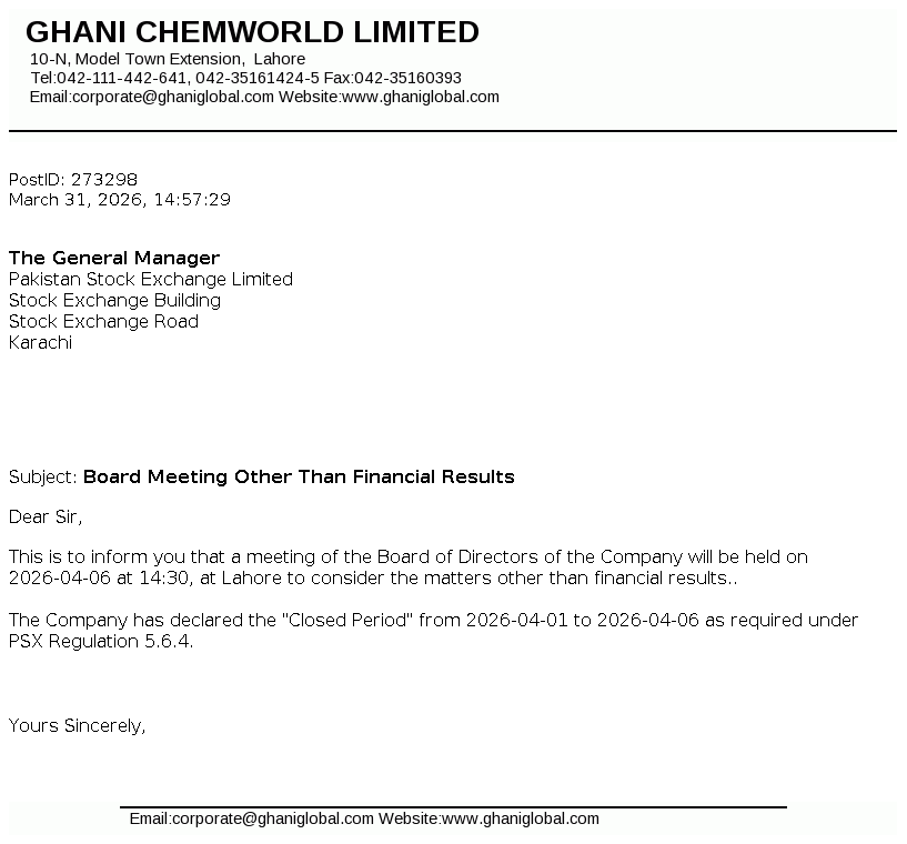 Ghani ChemWorld Limited was formed Pursuant to the Scheme of Arrangement (the “Scheme”) under which, complete business and undertaking of Calcium Carbide Project of Ghani Chemical Industries Limited (“GCIL”) has .been transferred with and into GCWL. The Scheme has been sanctioned by the Lahore High Court vide Order dated February 20, 2025.
