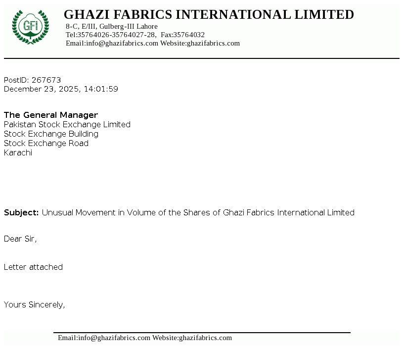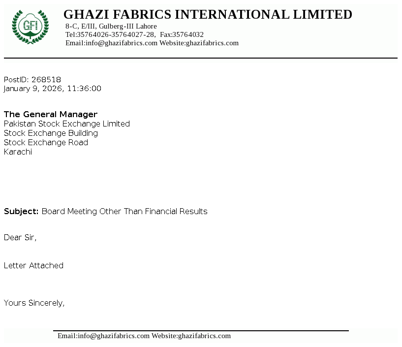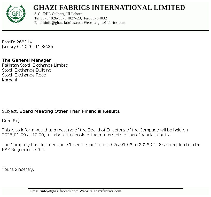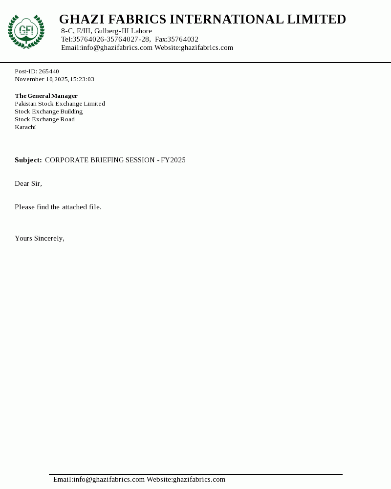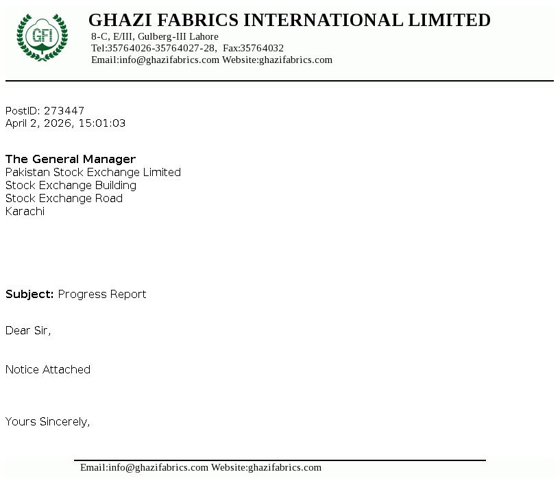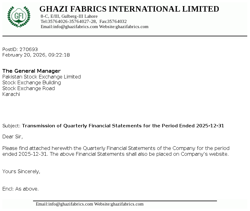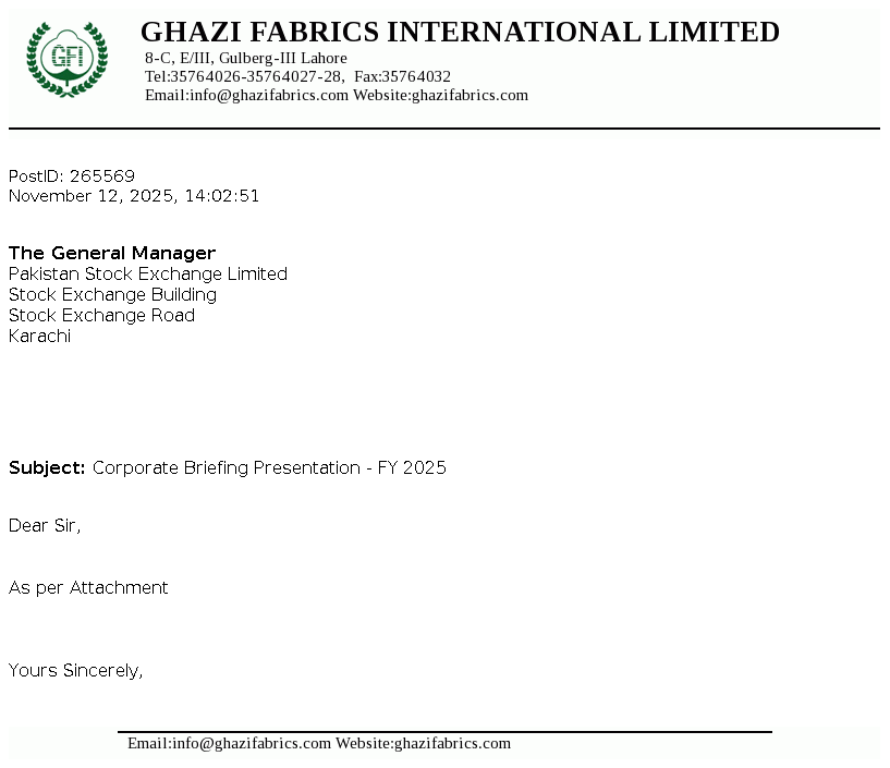 Ghazi Fabrics International Limited's was incorporated in Pakistan on April 30, 1989 as a Private Limited Company under the Companies Ordinance 1984 (repealed with the enactment of the Companies act 2017)and converted into Public Limited Company on January 07, 1990. The main activities of the Company are textile manufacturing, production of cotton and P.C. yarn and grey cloth that are marketed both within and outside Pakistan.