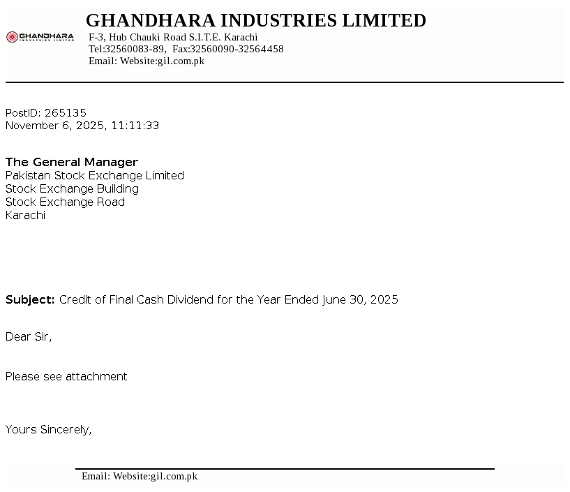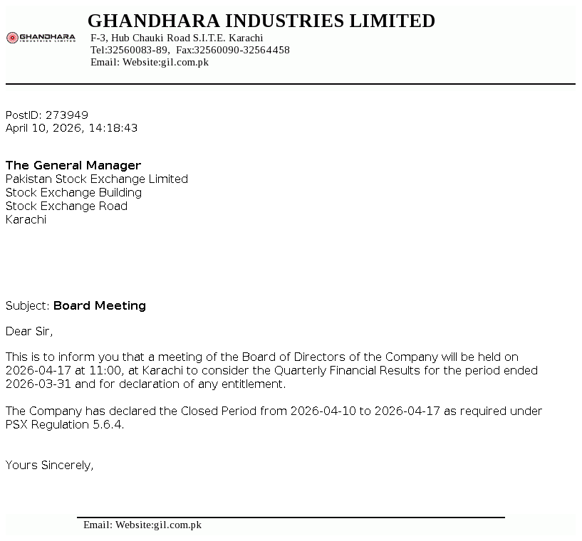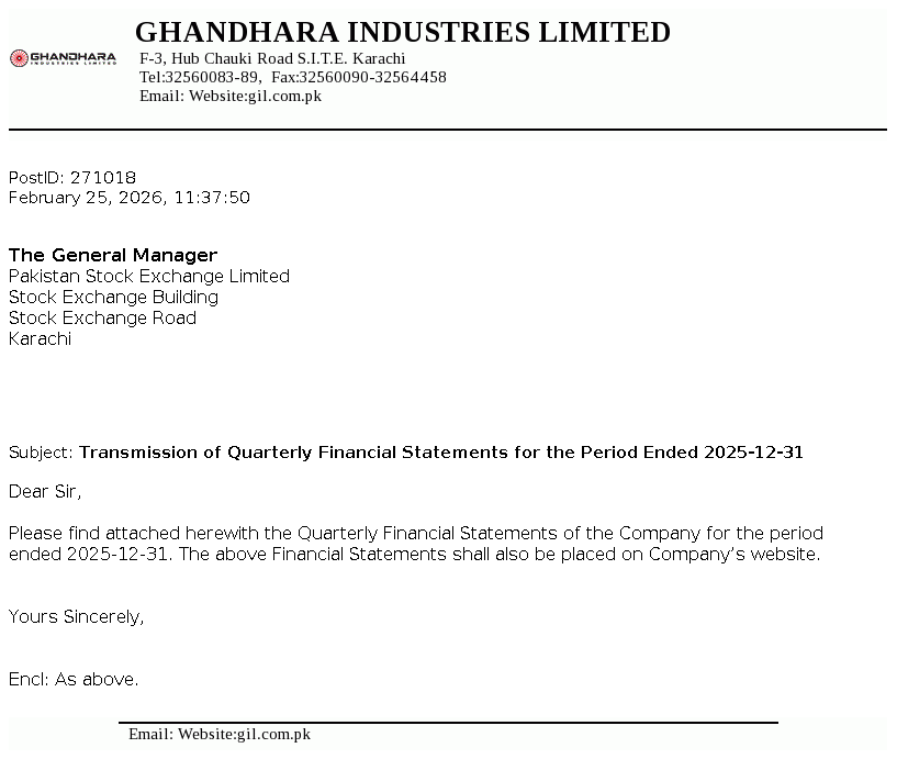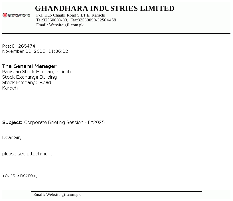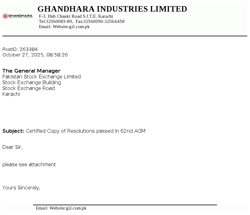 Ghandhara Industries Limited was incorporated on February 23, 1963. The principal activity is the assembly, progressive manufacturing and sale of Isuzu trucks, buses and pick ups.