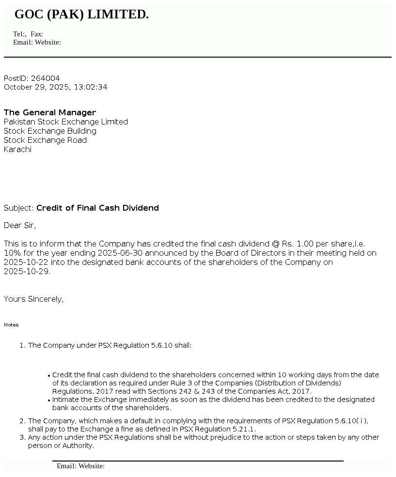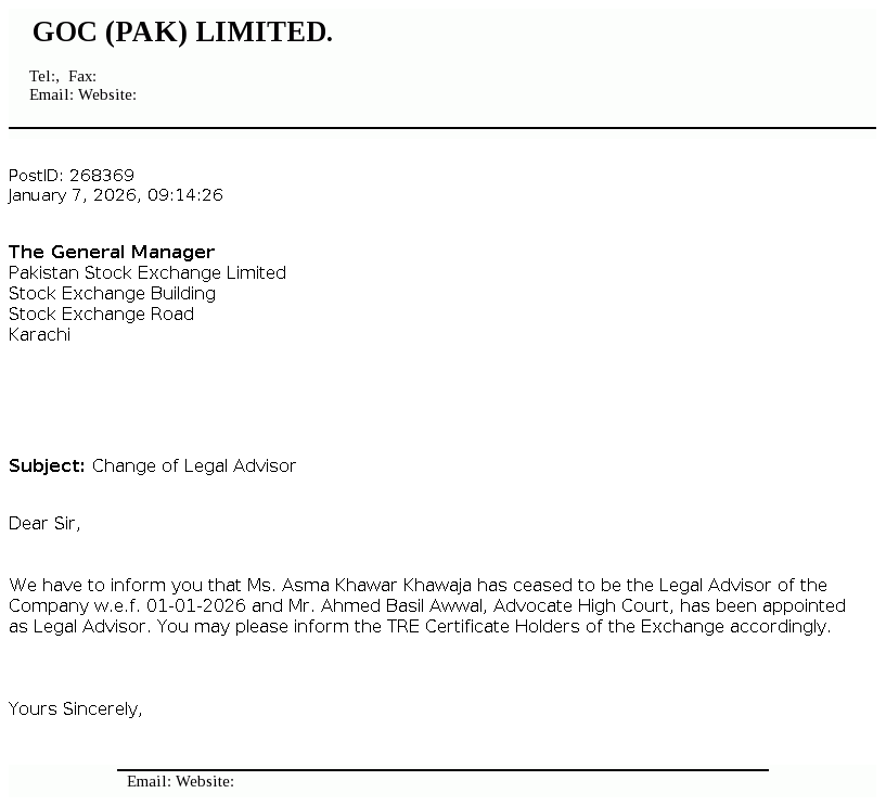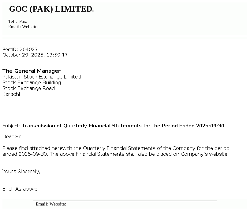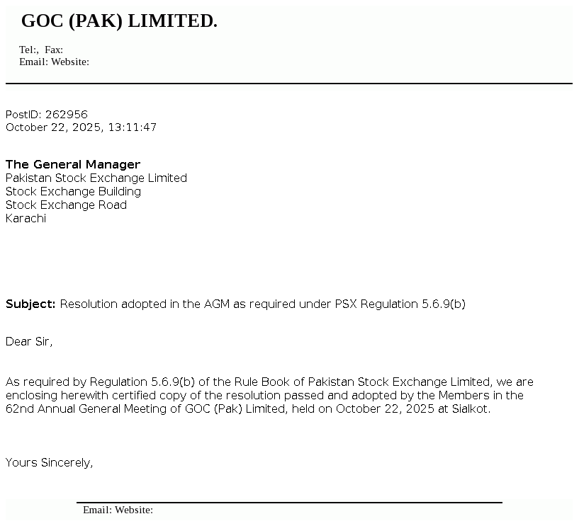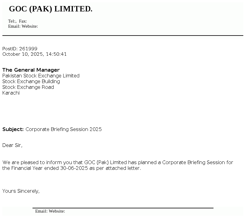 GOC (Pak) Limited was incorporated in Pakistan on 02 June 1964 as a private Company limited by shares under the Companies Act, 1913 (now Companies Act, 2017) and converted into a public limited company on April 17, 1986. The Company is engaged in manufacturing and sale of hockey sticks, cricket ball and other quality sports goods.