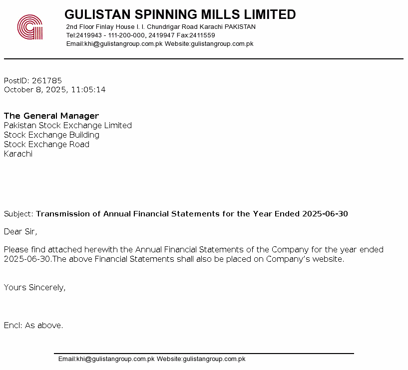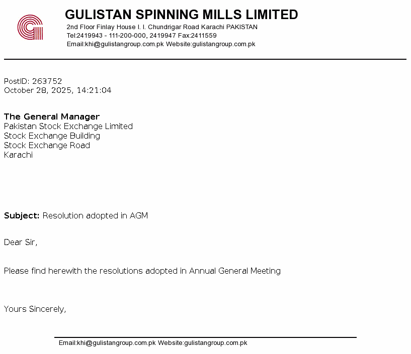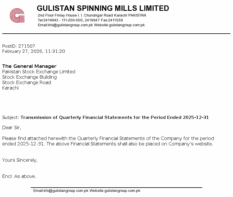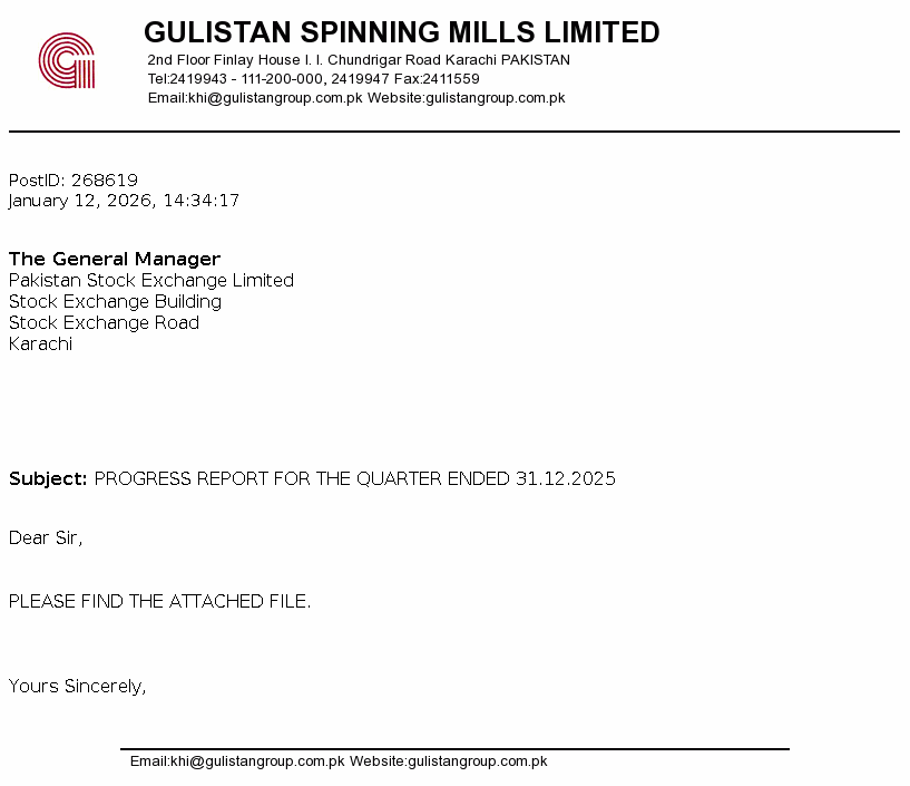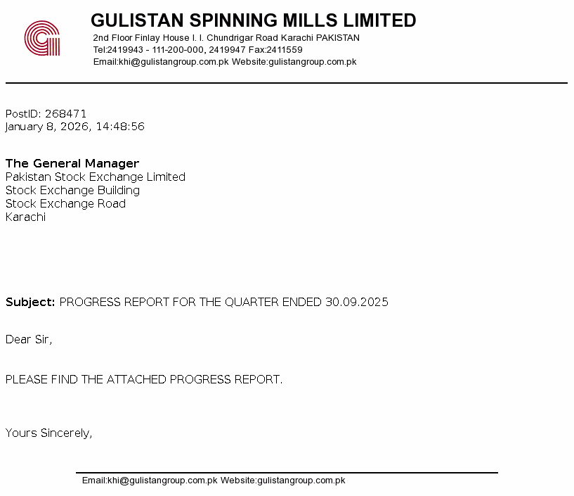 Gulistan Textile Mills Limited engages in the manufacture and sale of yarn in Pakistan and internationally. The company was incorporated in 1966 and is based in Lahore, Pakistan.