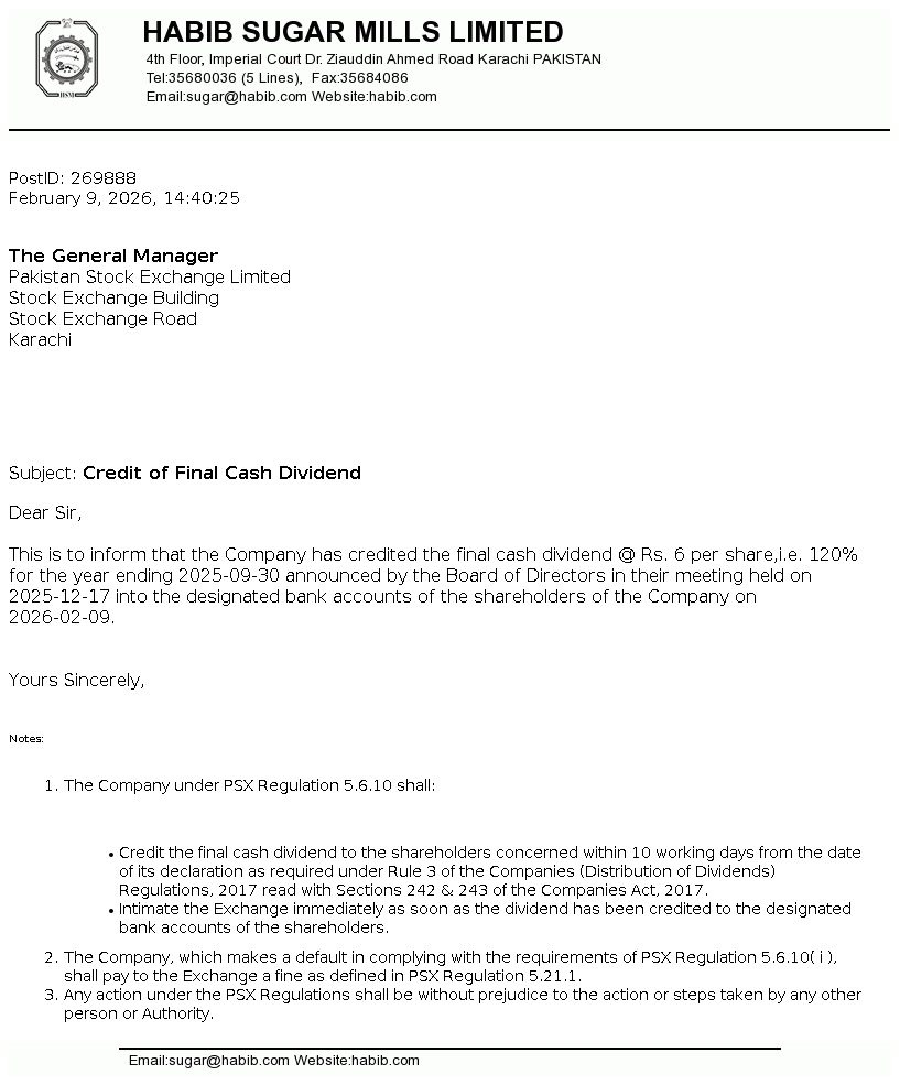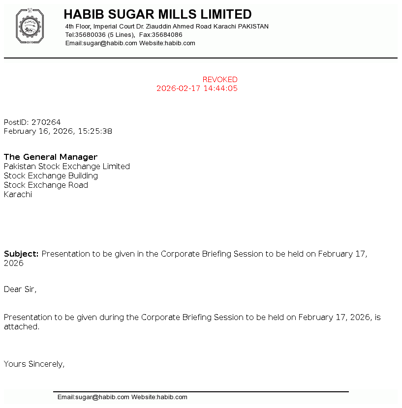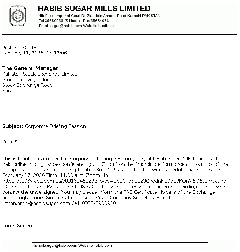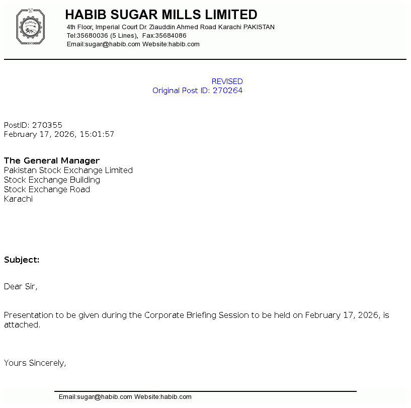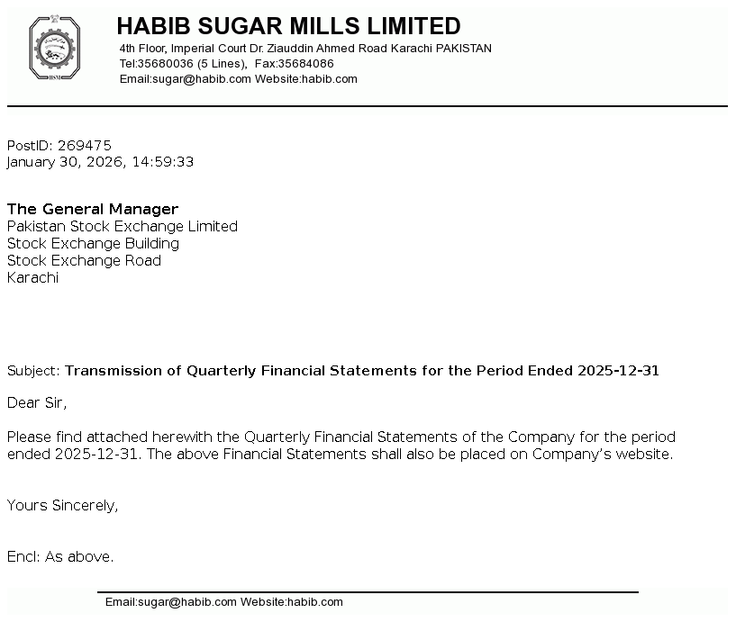 Habib Sugar Mills Limited is a public limited company incorporated in Pakistan on February 08, 1962. The Company is engaged in the manufacturing and marketing of refined sugar, ethanol, liquidified carbon dioxide (CO2), household textiles, providing bulk storage facilities and trading of commodities.