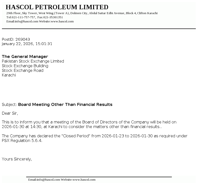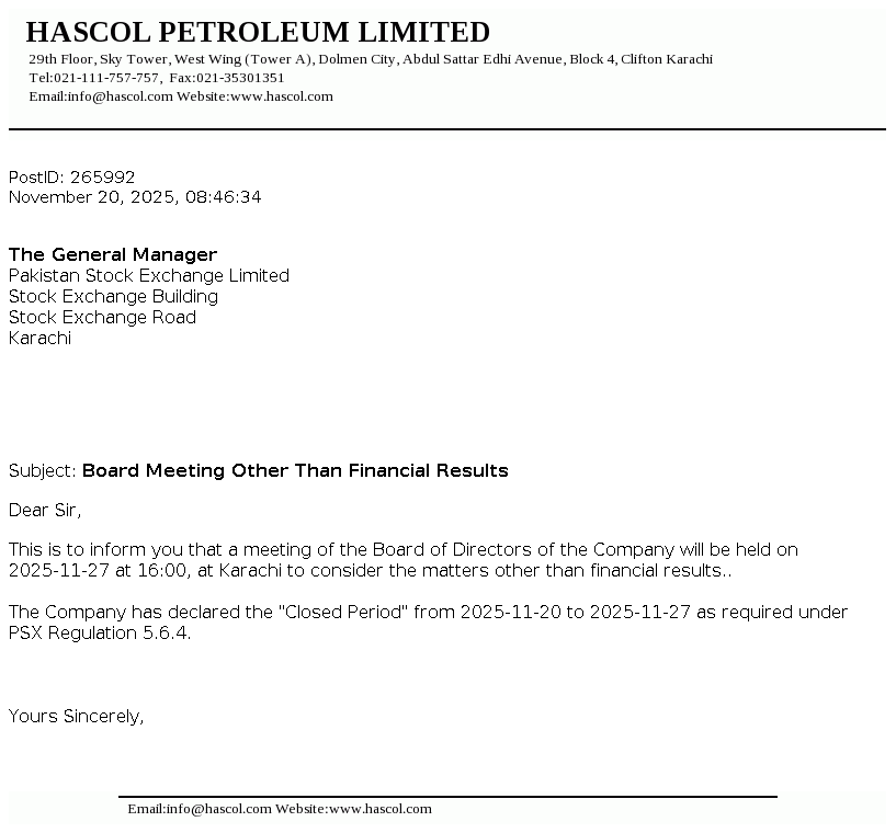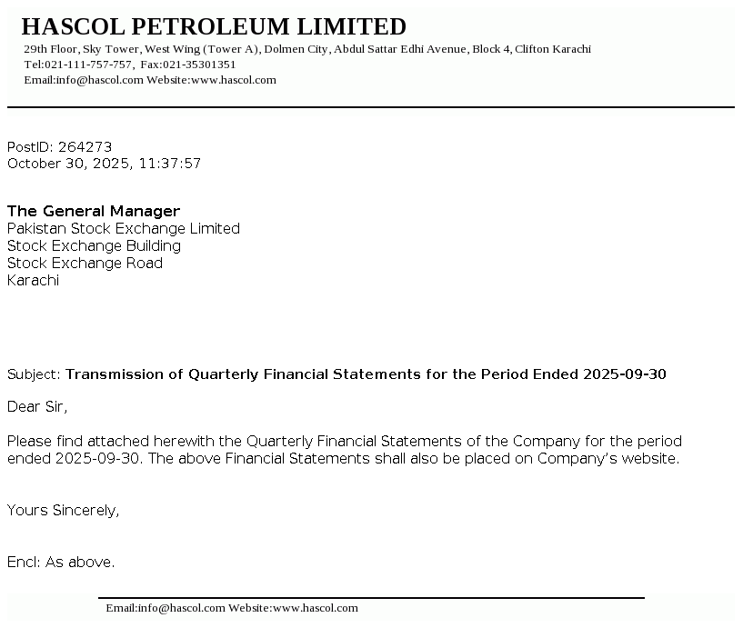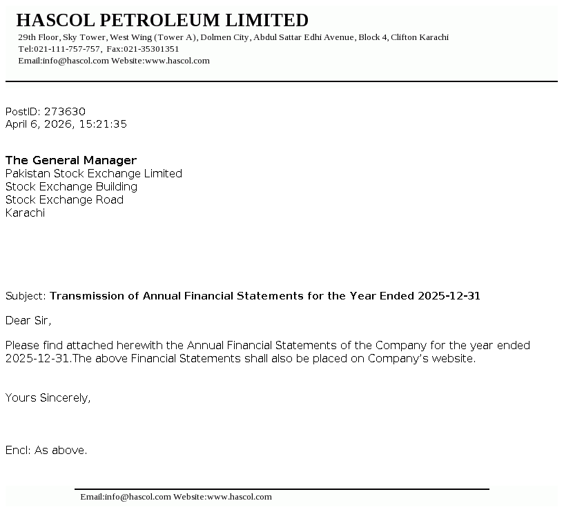 Hascol Petroleum Limited was incorporated in Pakistan as a private limited company on March 28, 2001. On September 12, 2007 the Company was converted into a public unlisted company. The Company is engaged in the business of procurement, storage and marketing of petroleum, chemicals, LPG and related products. The Company obtained oil marketing license from Ministry of Petroleum and Natural Resources in the year 2005 and acquired assets of LPG licensed company in the year 2018.