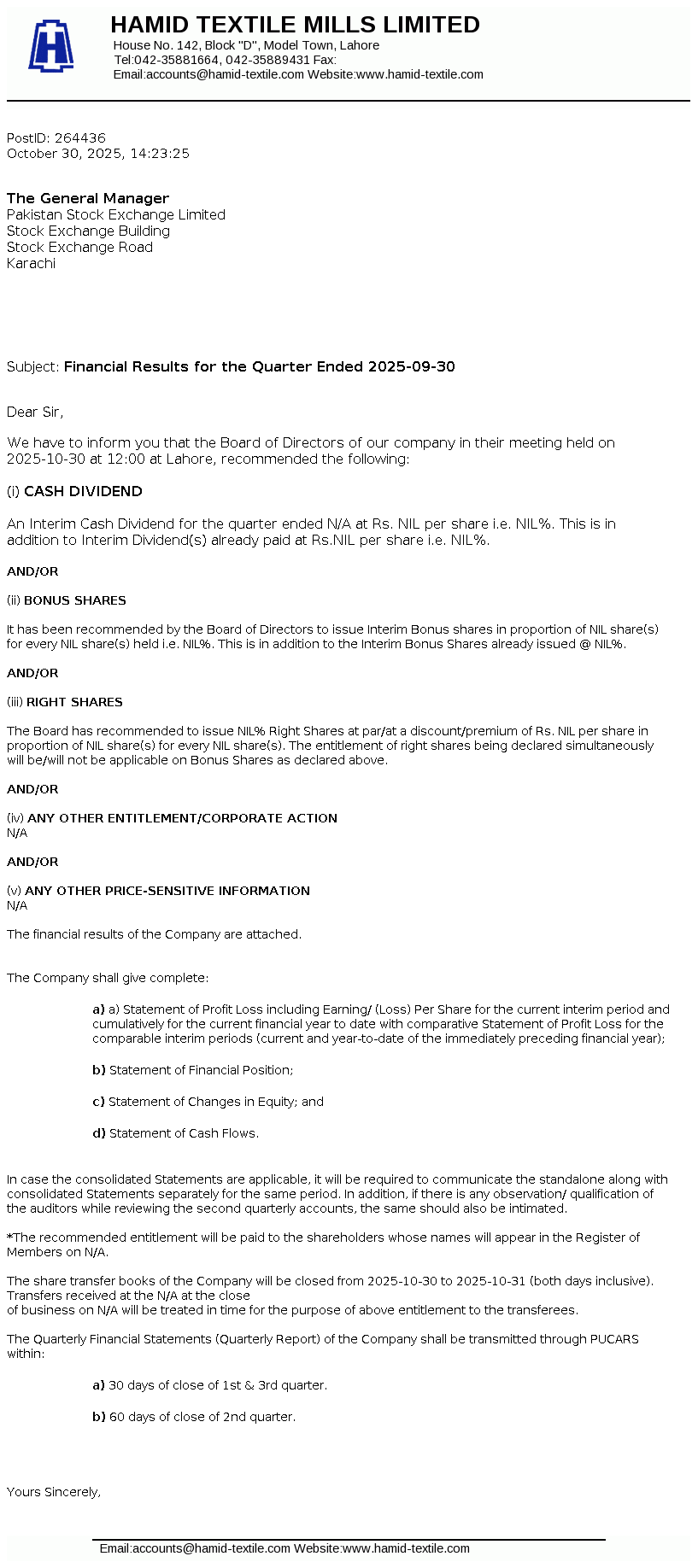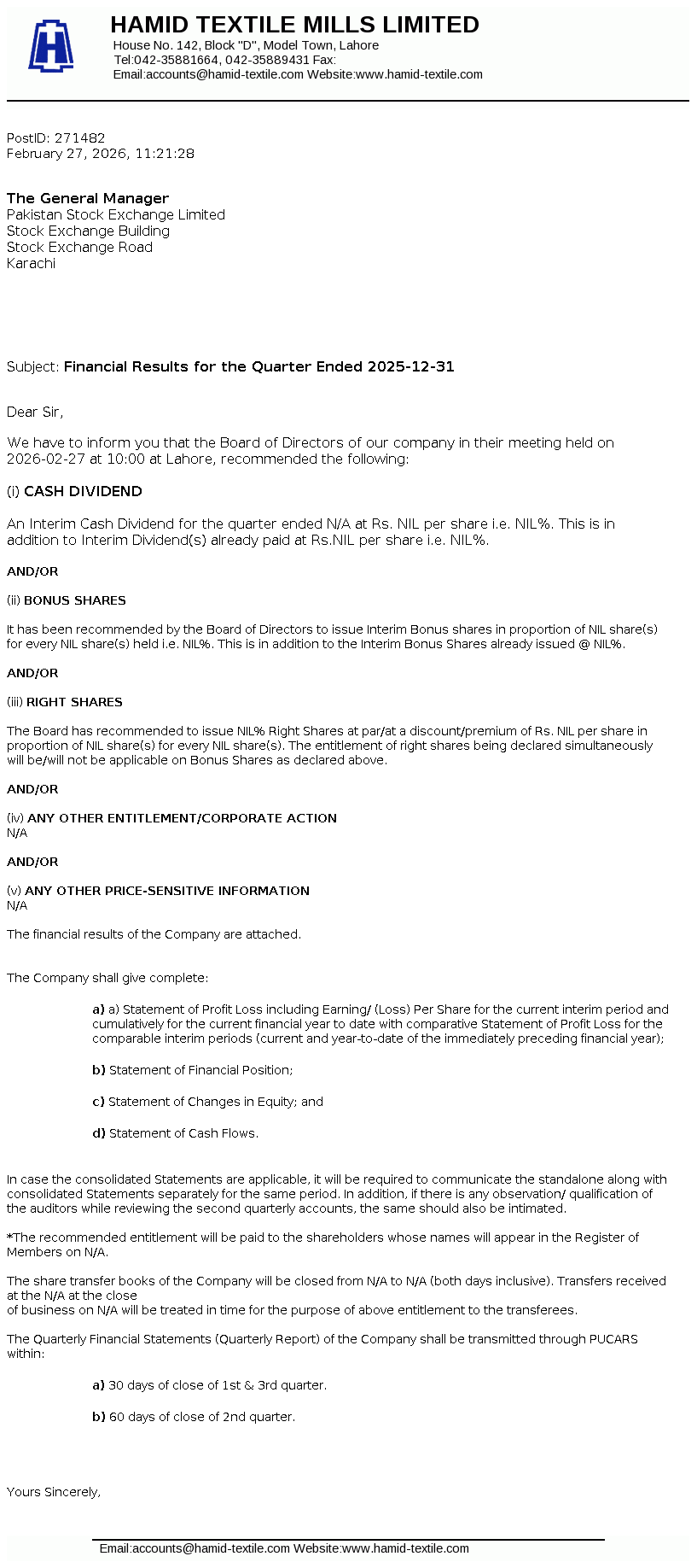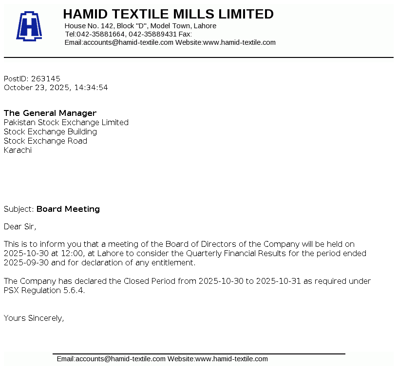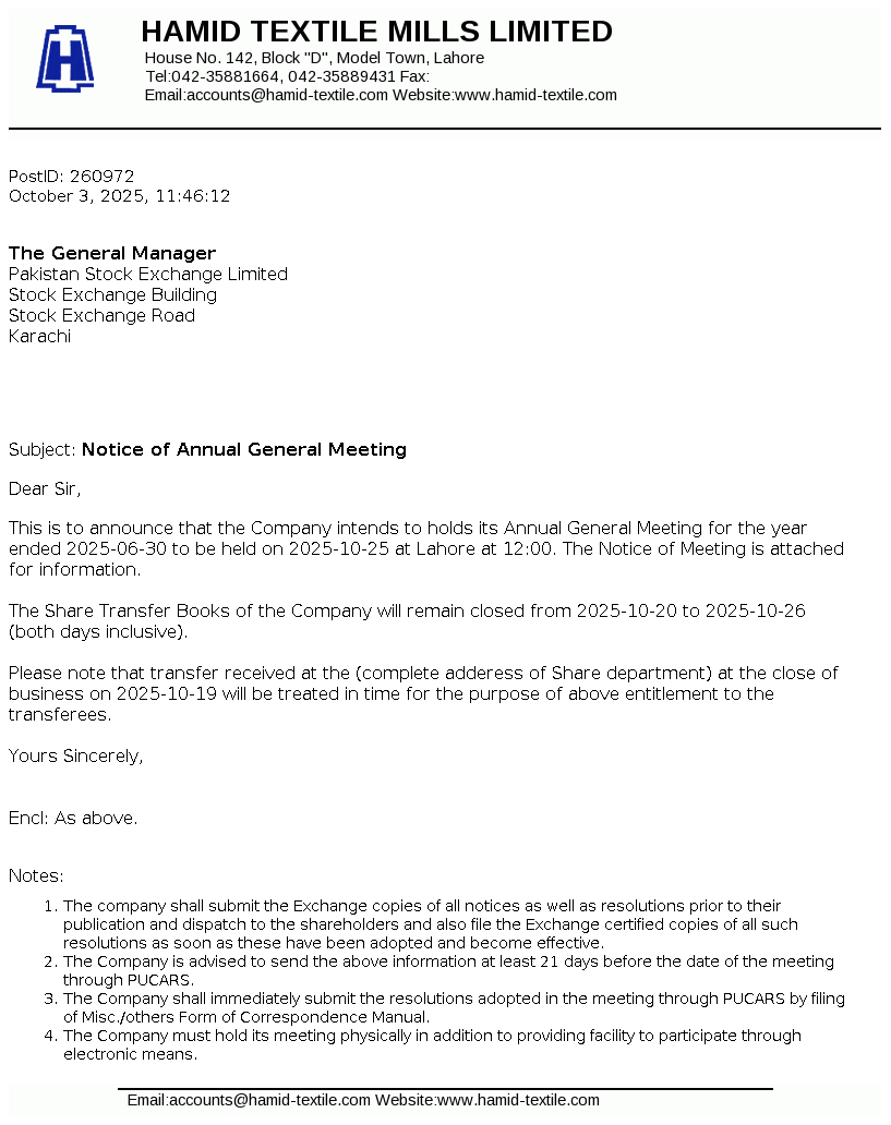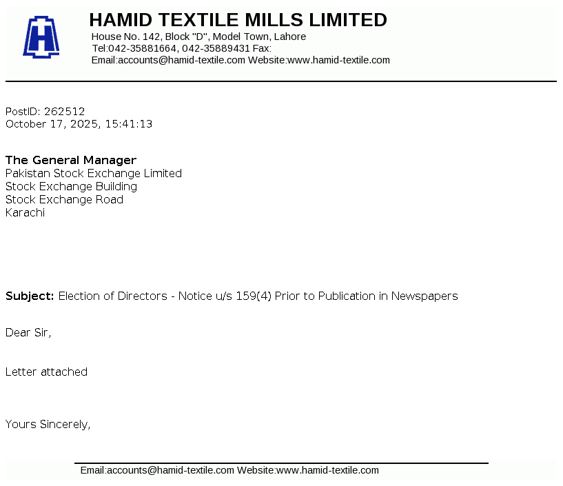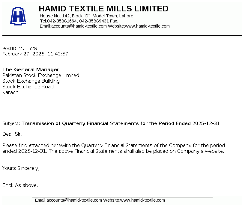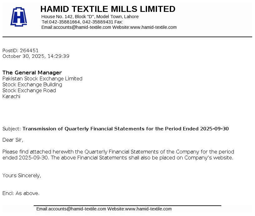 Hamid Textile Mills Limited was incorporated in Pakistan on April, 09, 1987 as a Private Limited Company and was subsequently converted on February 15, 1988 into Public Limited Company under the Companies Ordinance, 1984 (repealed by Companies Act, 2017). The principal business of the company is to manufacture yarn and grey cloth, which are marketed within and outside Pakistan.