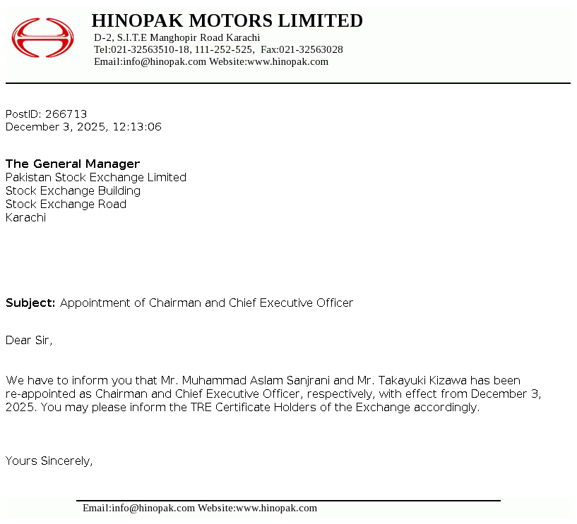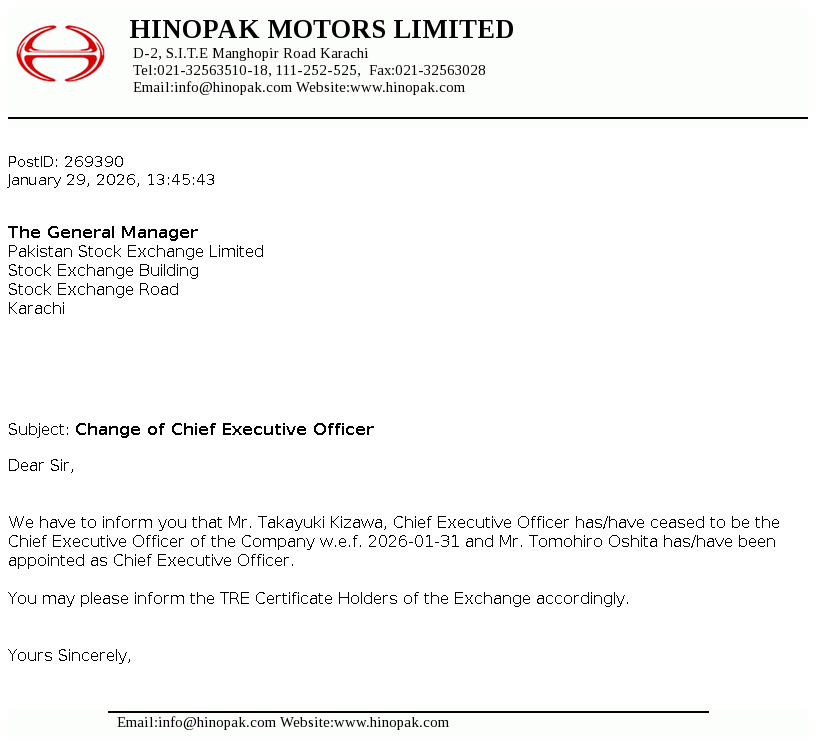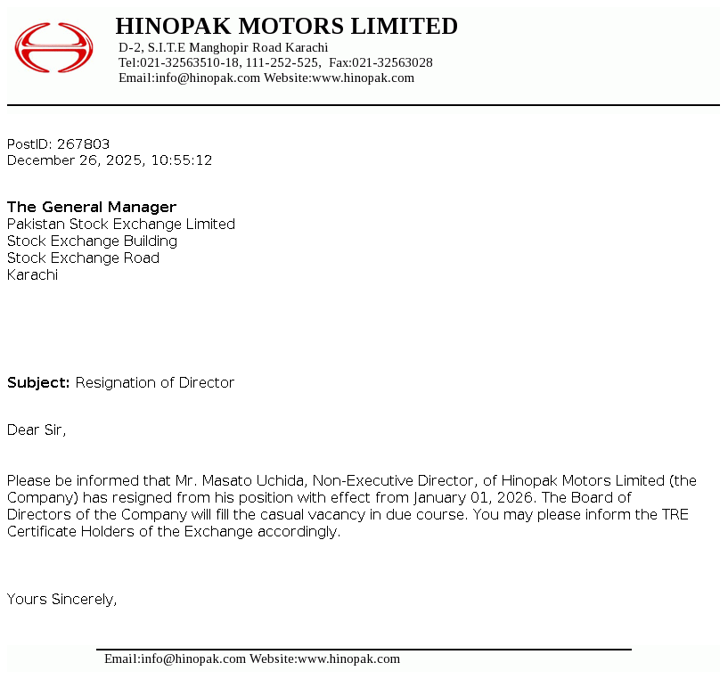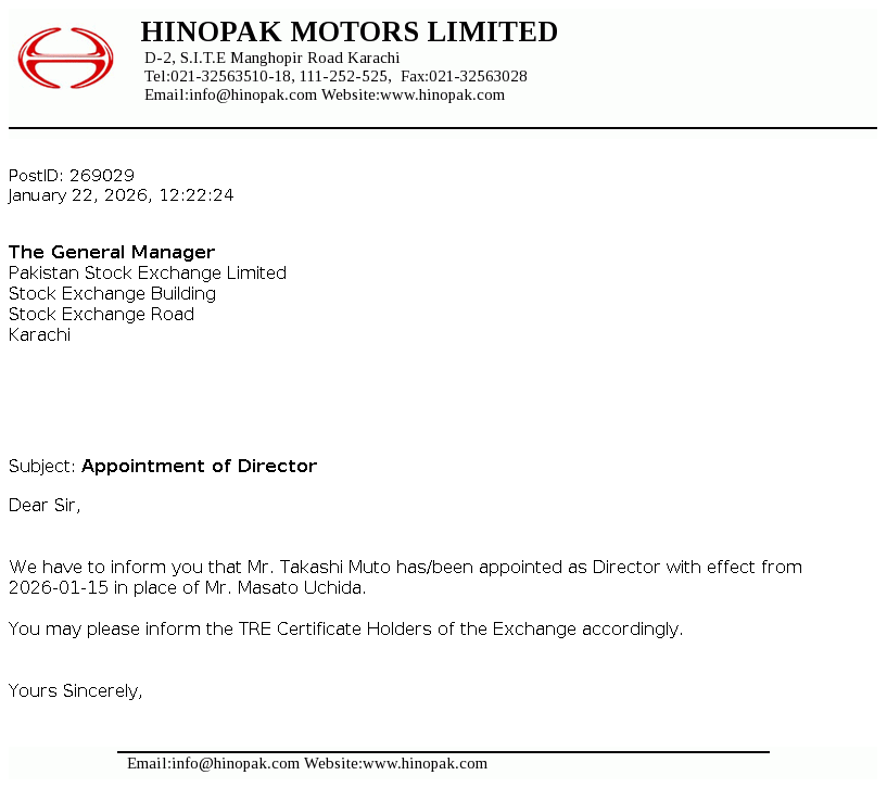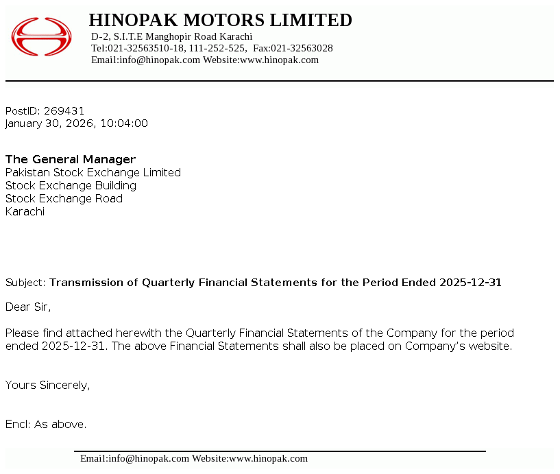 Hinopak Motors Limited is incorporated in Pakistan as a public limited Company. The Company’s principal activity is the assembly, progressive manufacturing and sale of Hino buses and trucks. The company is a subsidiary of Hino Motors Limited Japan and the ultimate parent company is Toyota Motors Corporation Japan.