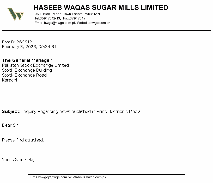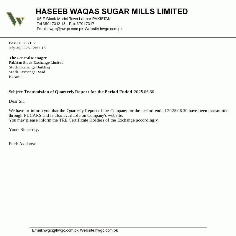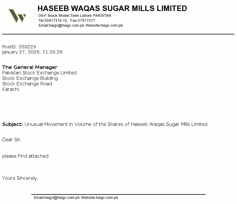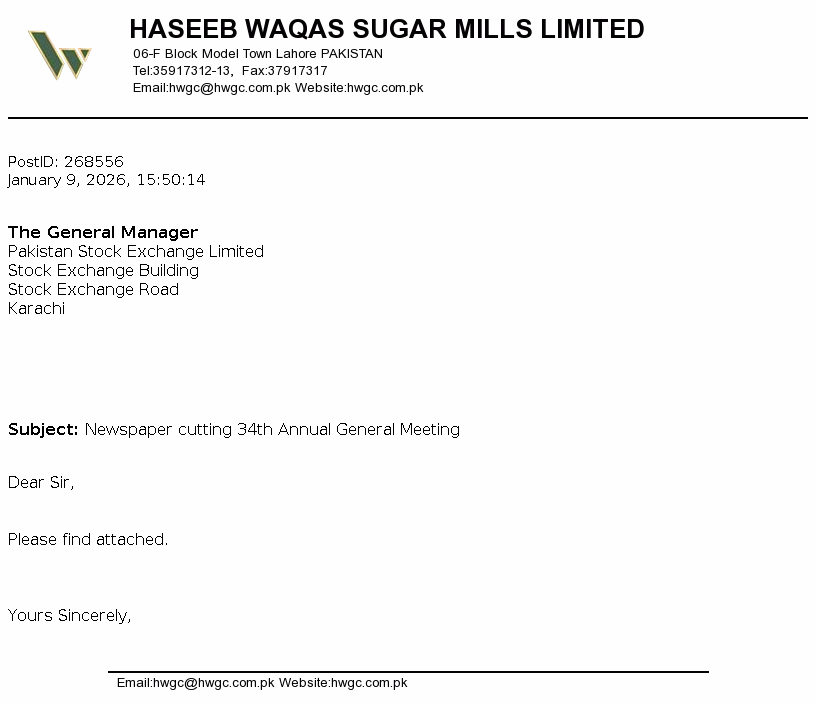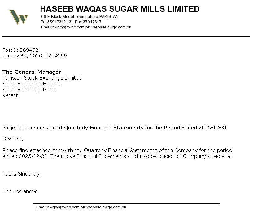 Haseeb Waqas Sugar Mills Limited was incorporated in Pakistan on 13 January 1992 as a Public Limited Company under the repealed Companies Ordinance, 1984 (now the Companies Act 2017). The principal activity of the Company is manufacture and sale of refined sugar and its by-products.