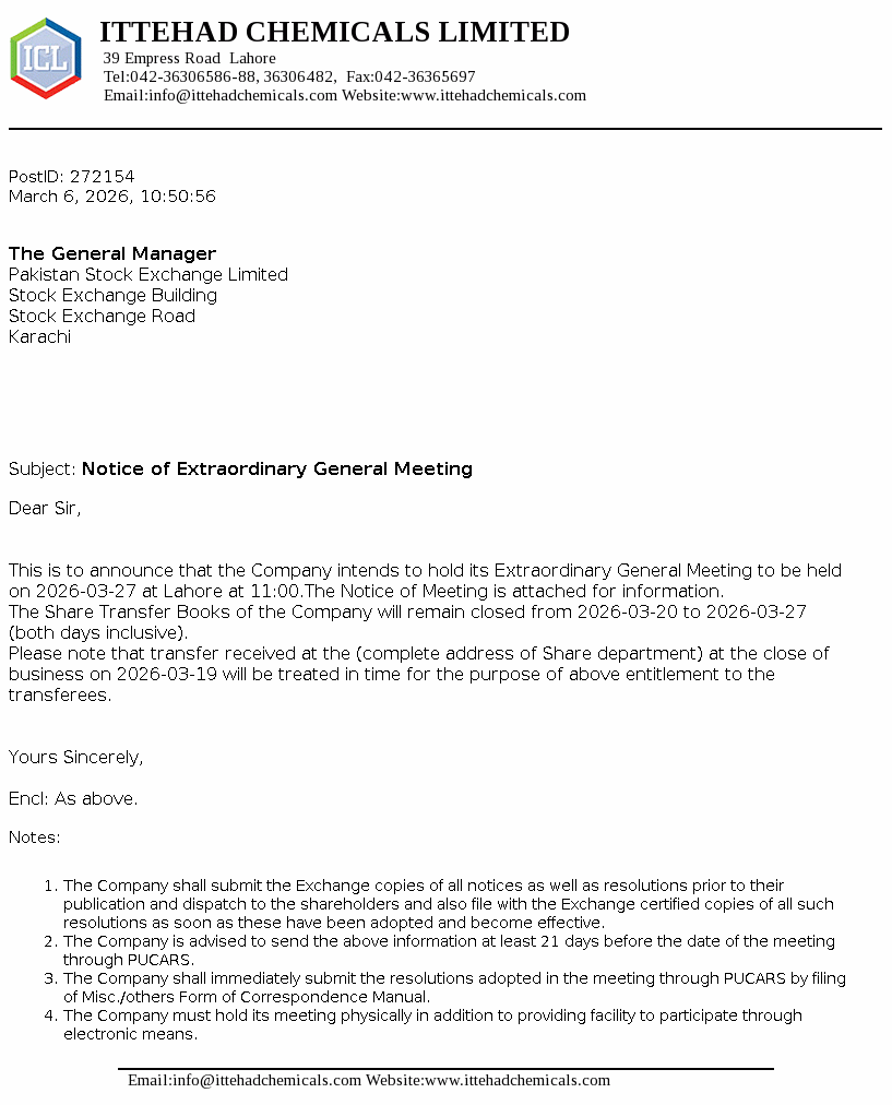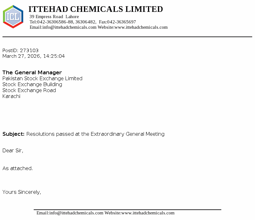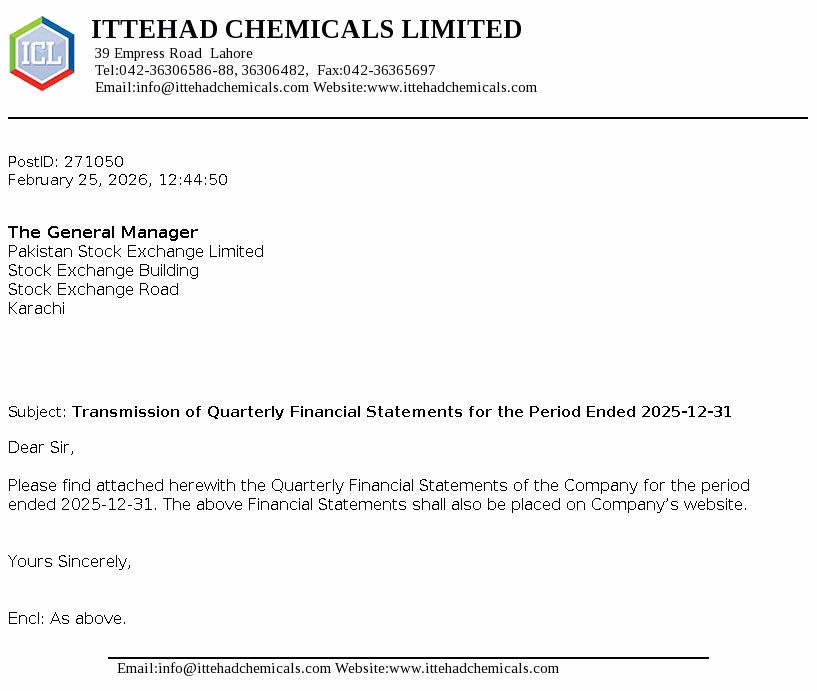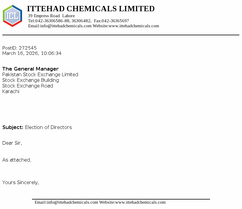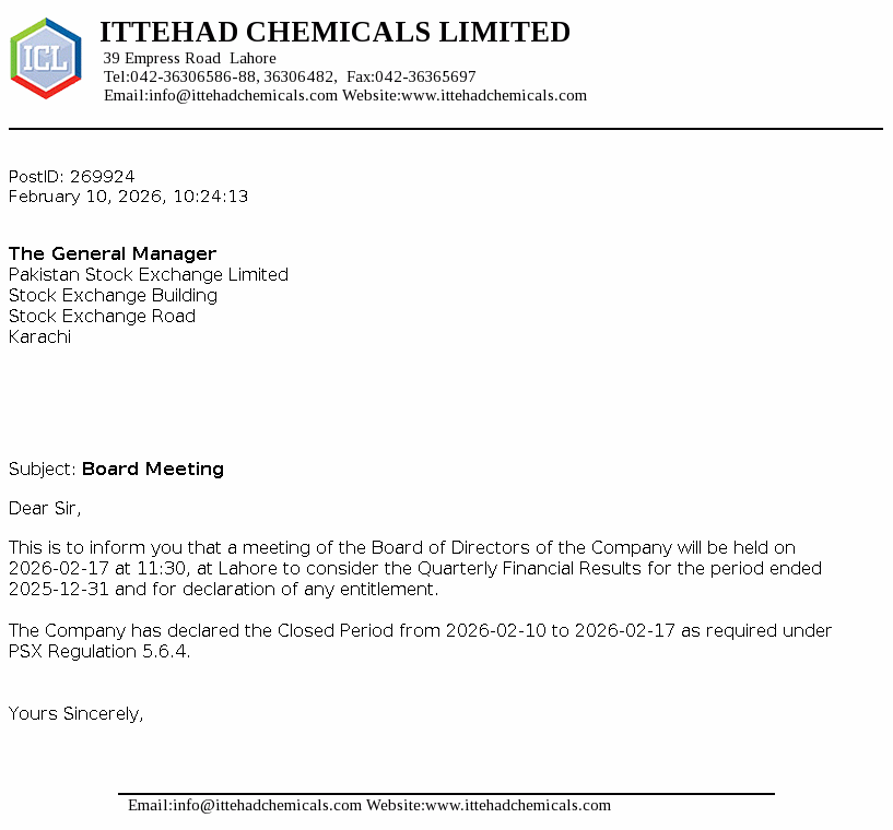 Ittehad Chemicals Limited was incorporated on September 28, 1991 to takeover the assets of Ittehad Chemicals and Ittehad Pesticides under a Scheme of Arrangement dated June 18, 1992. The Company was privatised on July 03, 1995. The Company is engaged in the business of manufacturing and selling caustic soda and other allied chemicals.