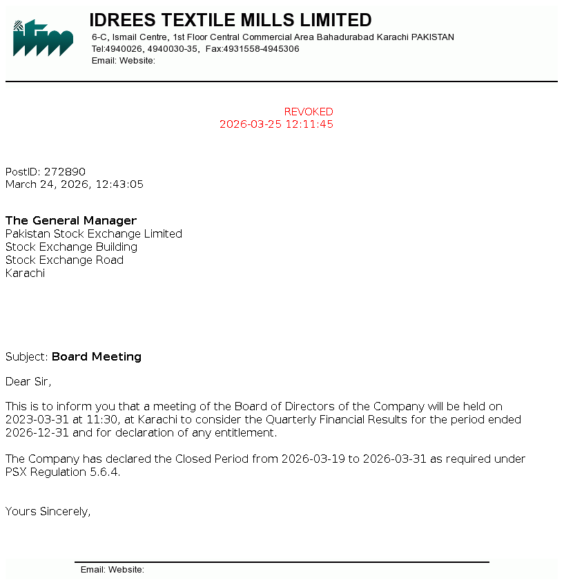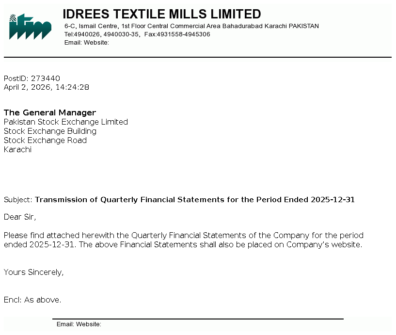 Idrees Textile Mills Limited was incorporated in Pakistan as an unquoted public limited company on June 5, 1990. The principal activity of the Company is to manufacture and sell yarn and fabric