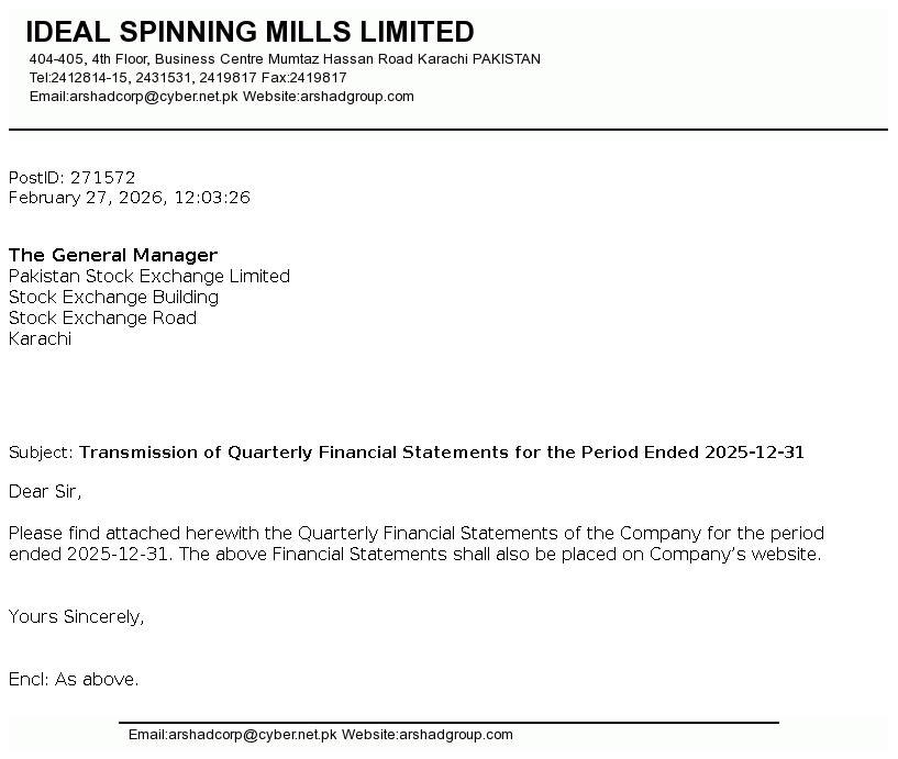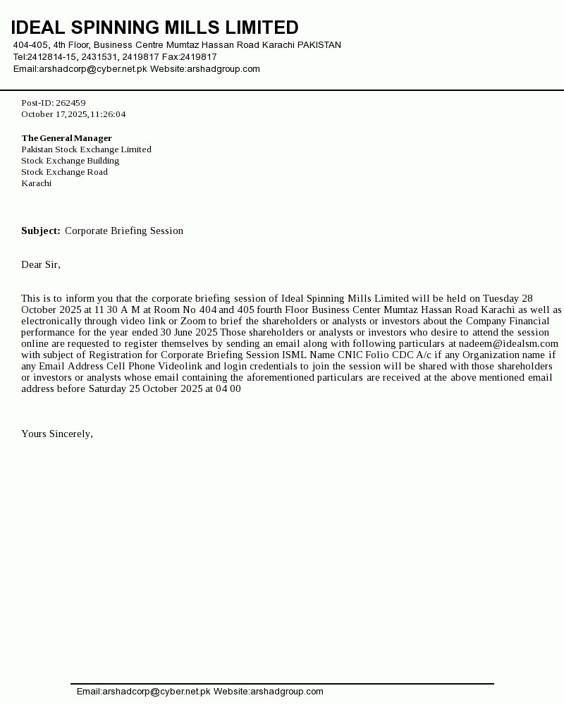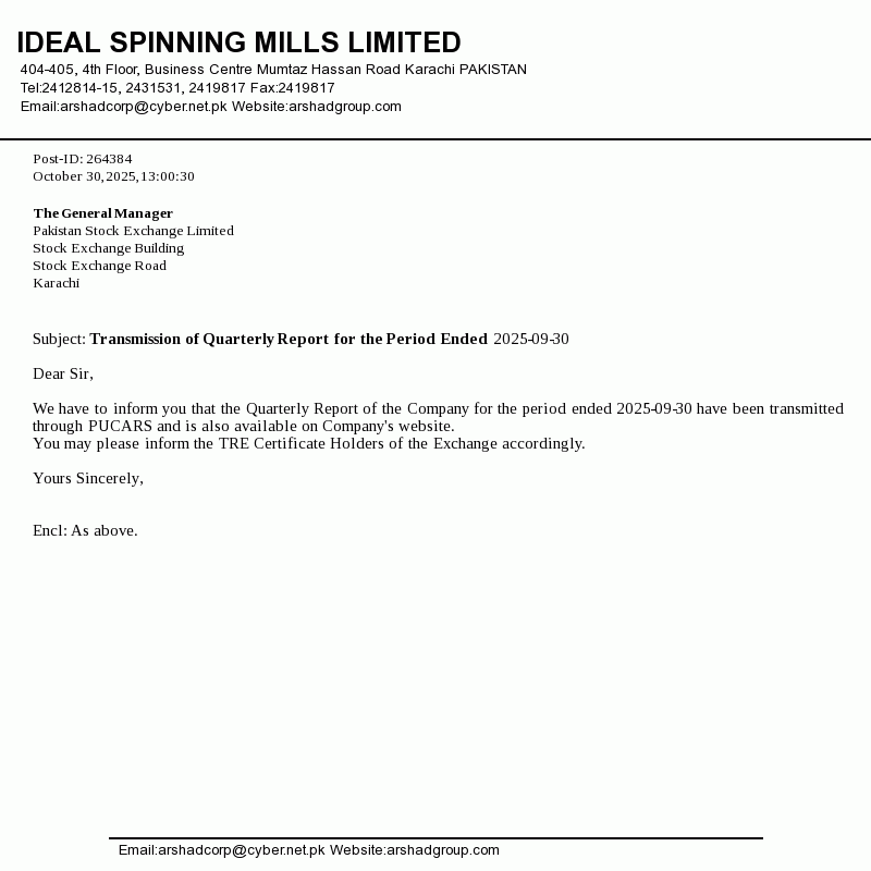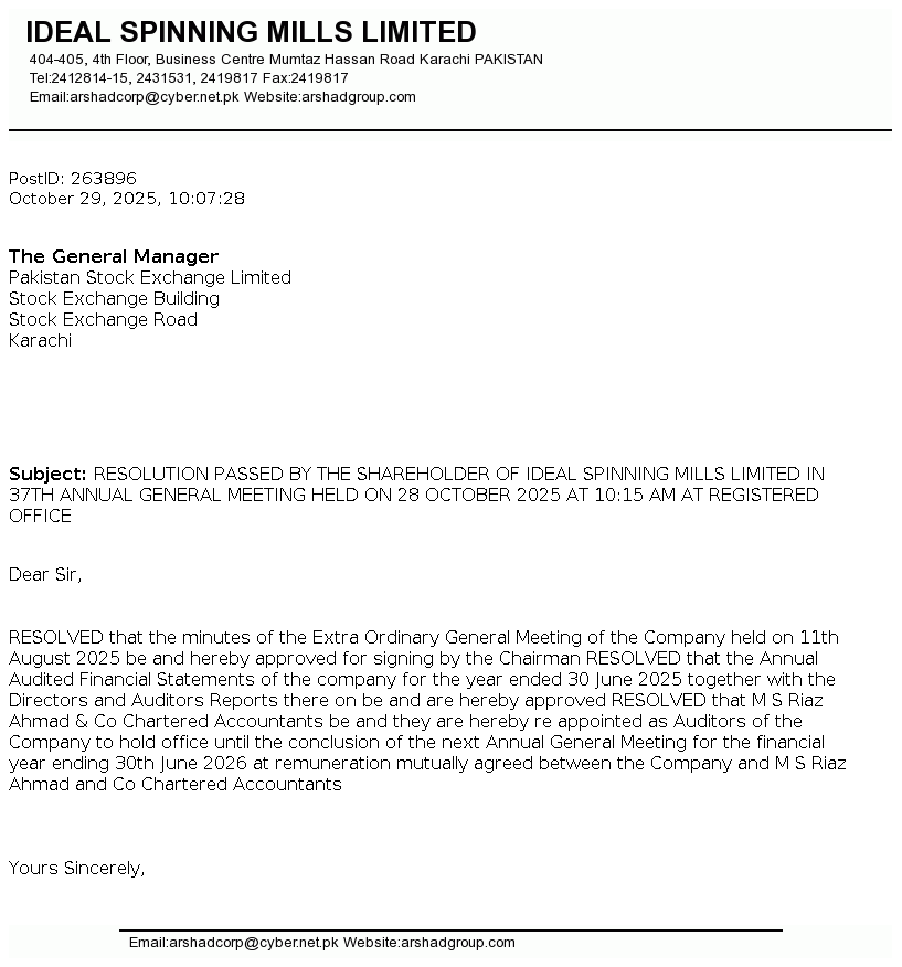 Ideal Spinning Mills Ltd is a public limited company incorporated in Pakistan on 8 June 1989 under the Companies Ordinance, 1984 (now the Companies Act, 2017). The principal activity of the Company is manufacturing and sale of yarn, cloth and hosiery products.