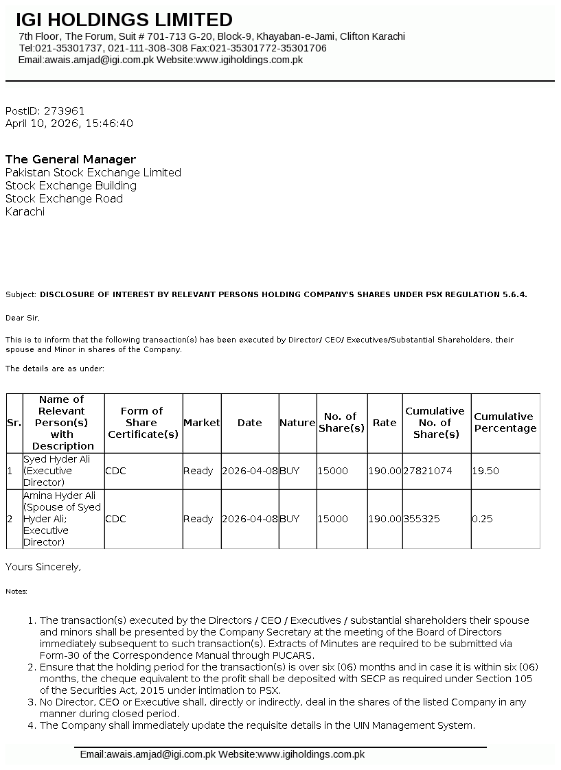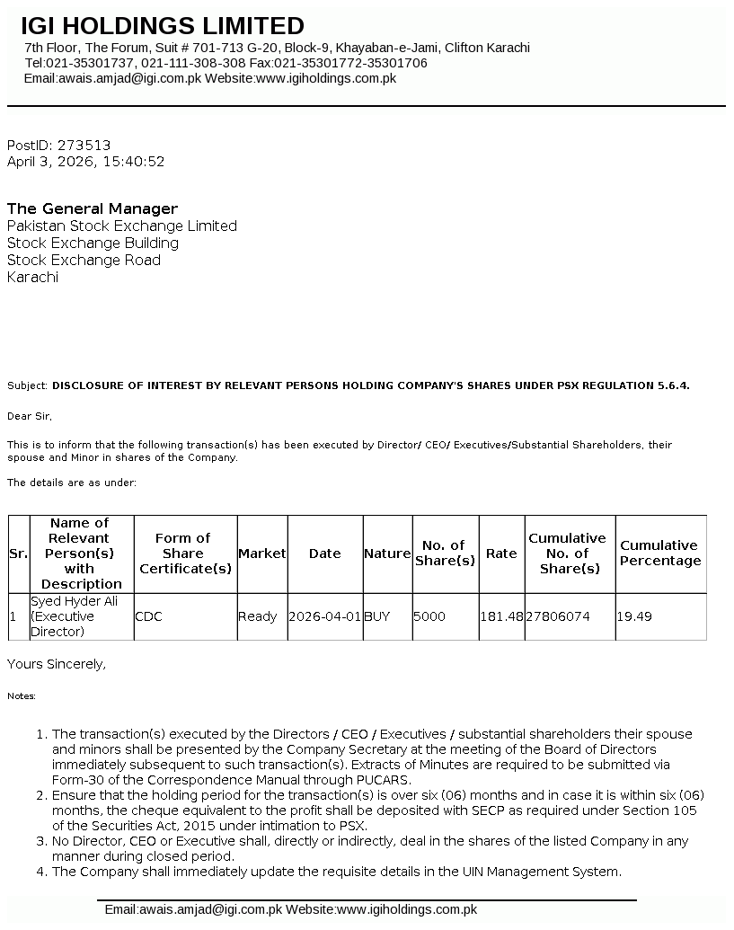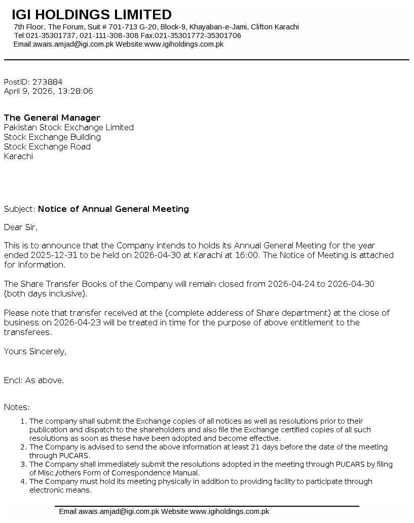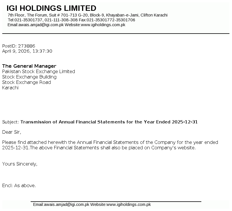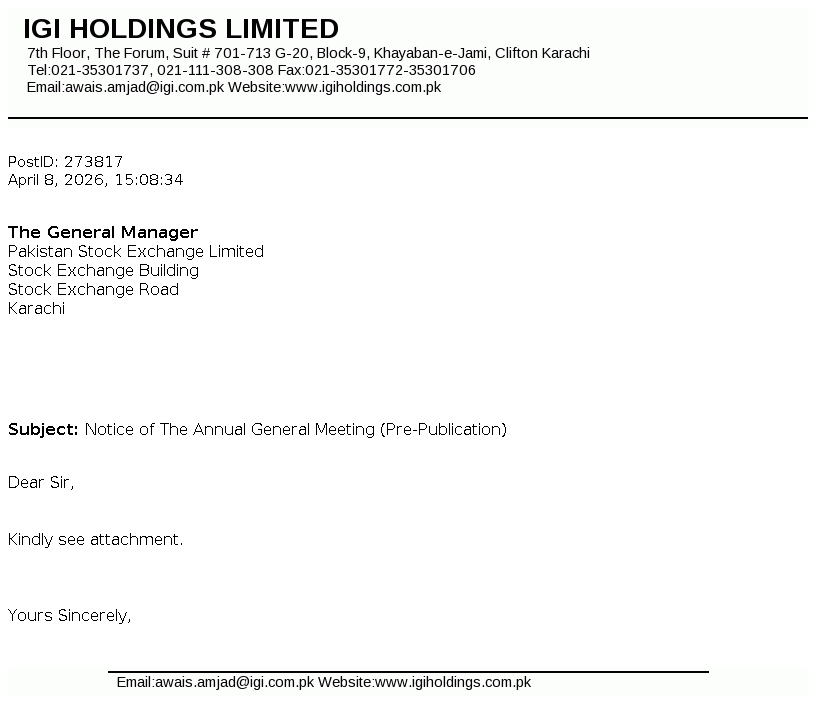 IGI Holdings Limited, a Packages Group Company was incorporated as a public limited company in 1953 under the repealed Companies Ordinance, 1984 (now the Companies Act, 2017). The objects of the Company include to act as an investment holding company and for that purpose invest, acquire, sell and hold the securities and financial instruments subject to compliance by relevant laws prevailing in Pakistan from time to time.