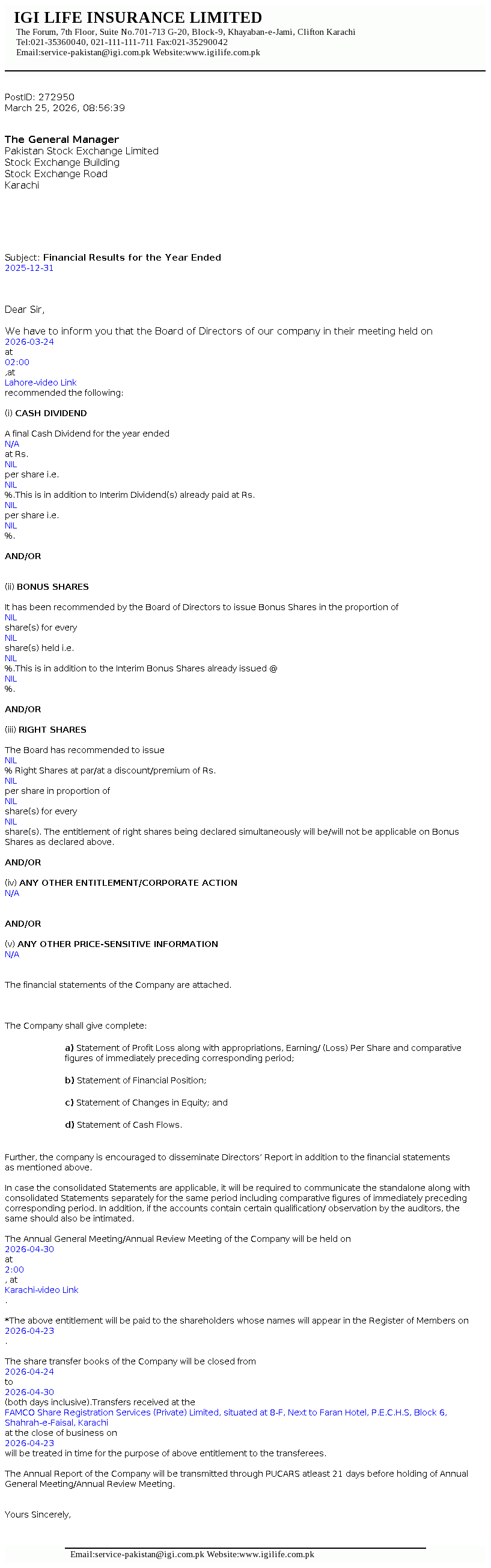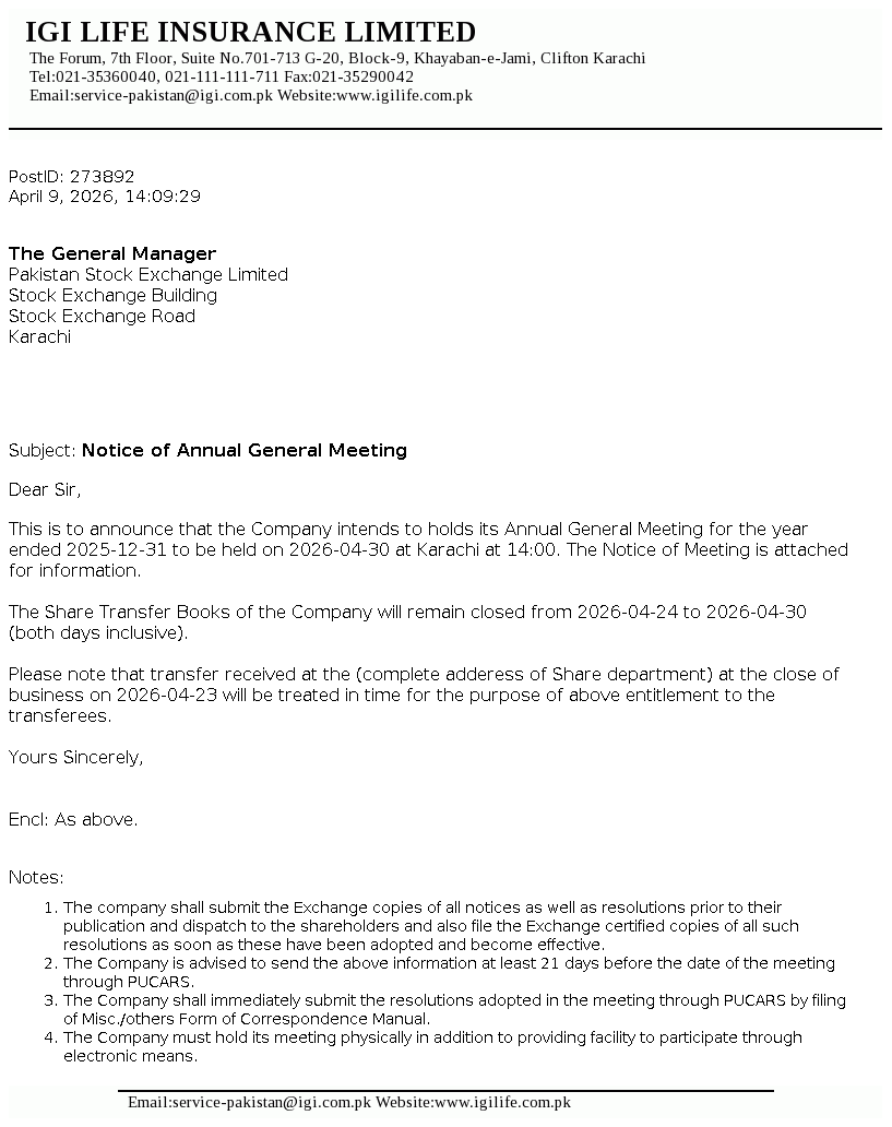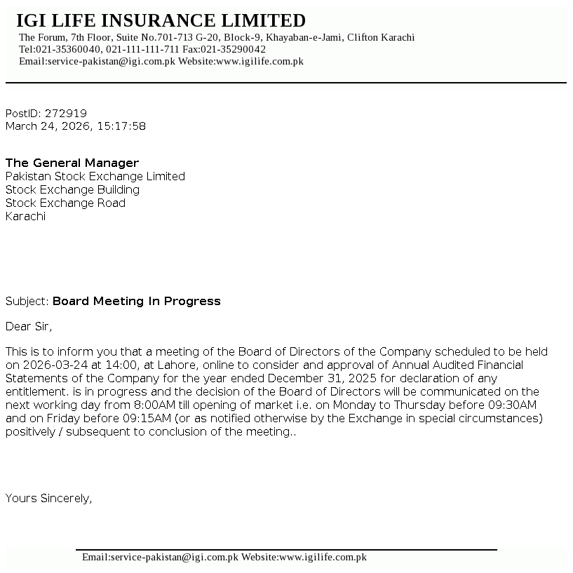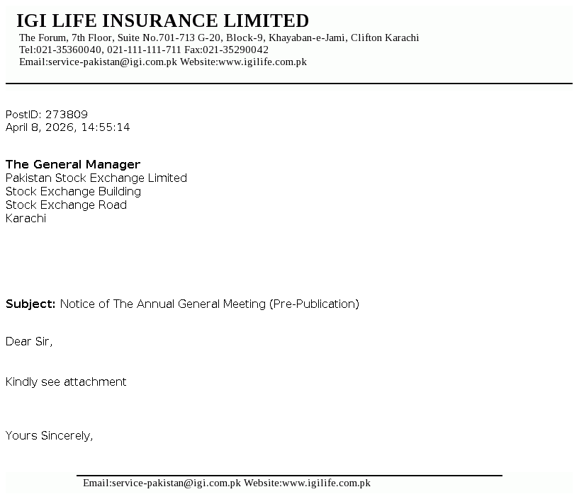 IGI Life Insurance Limited was incorporated in Pakistan on October 9, 1994 as a public limited company under the Companies Ordinance, 1984 (now the Companies Act, 2017). The Company is engaged in life insurance, carrying on both participating and non-participating business. The Company is also engaged in providing Shariah Compliant family takaful products as an approved window takaful operator. The Company is a subsidiary of IGI Holdings Limited.