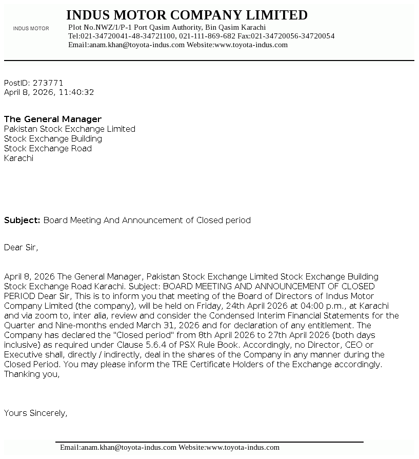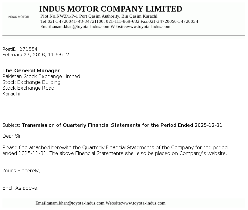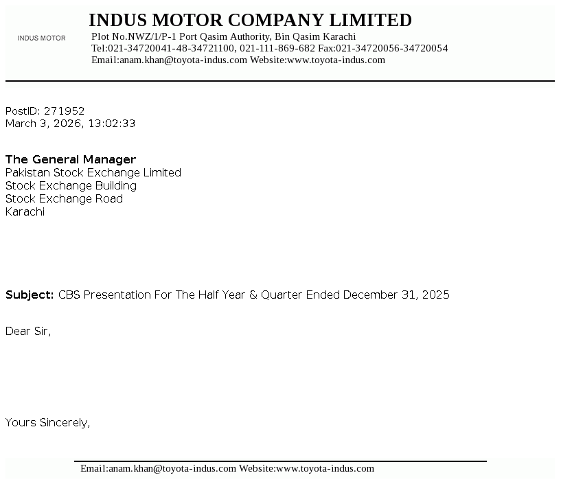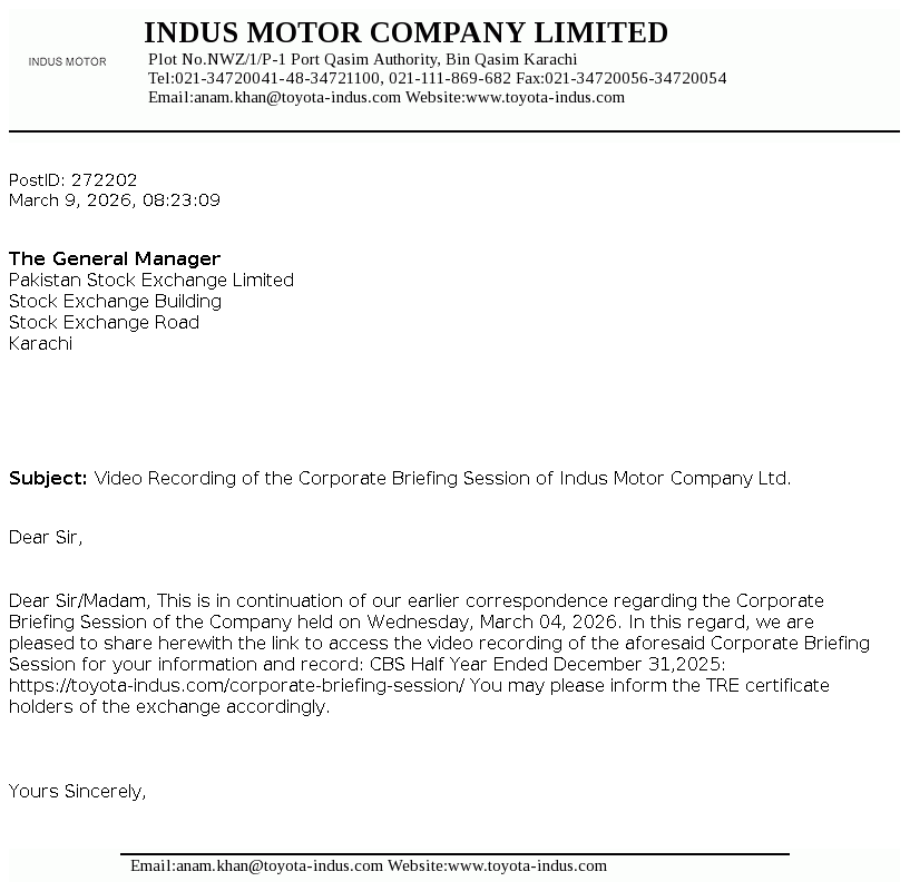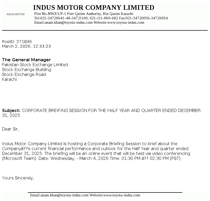 Indus Motor Company Limited was incorporated in Pakistan as a public limited company in December 1989 and started commercial production in May 1993. The Company was formed in accordance with the terms of a Joint Venture agreement concluded amongst certain House of Habib companies, Toyota Motor Corporation and Toyota Tsusho Corporation for the purposes of assembling, progressive manufacturing and marketing of Toyota vehicles. The Company also acts as the sole distributor of Toyota and Daihatsu vehicles in Pakistan and has a license for assembling, progressive manufacturing and marketing of these vehicles in Pakistan.
