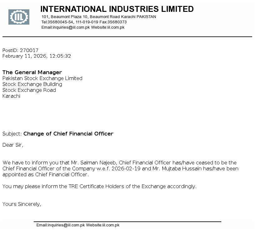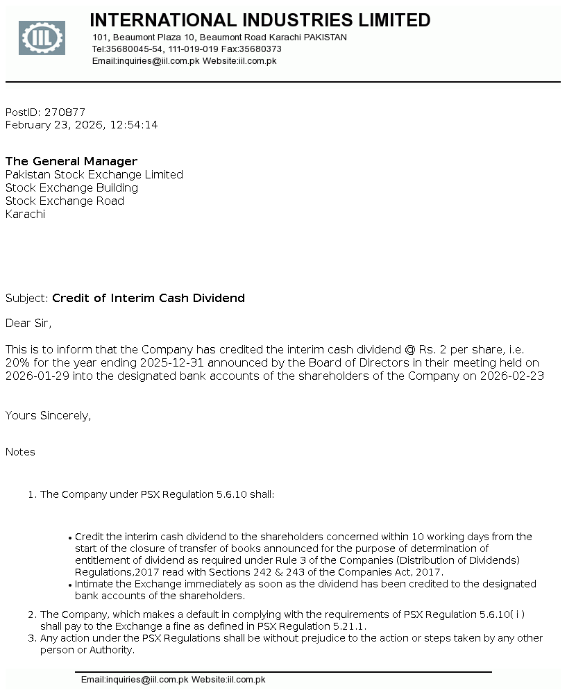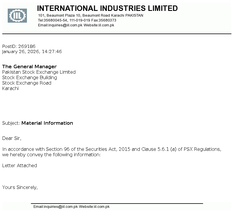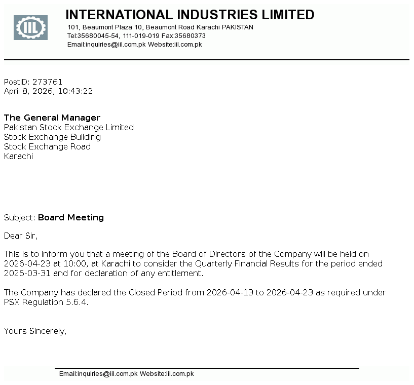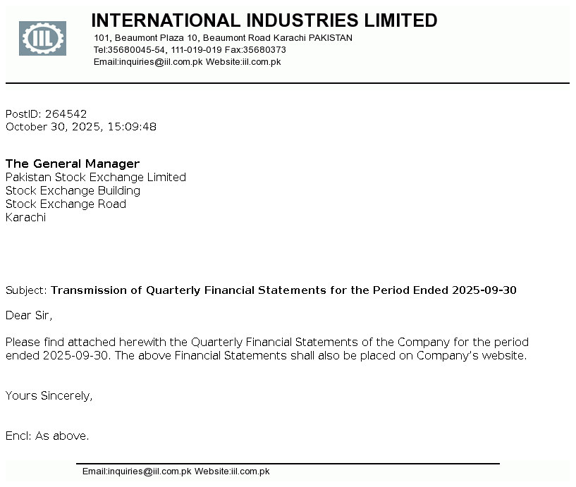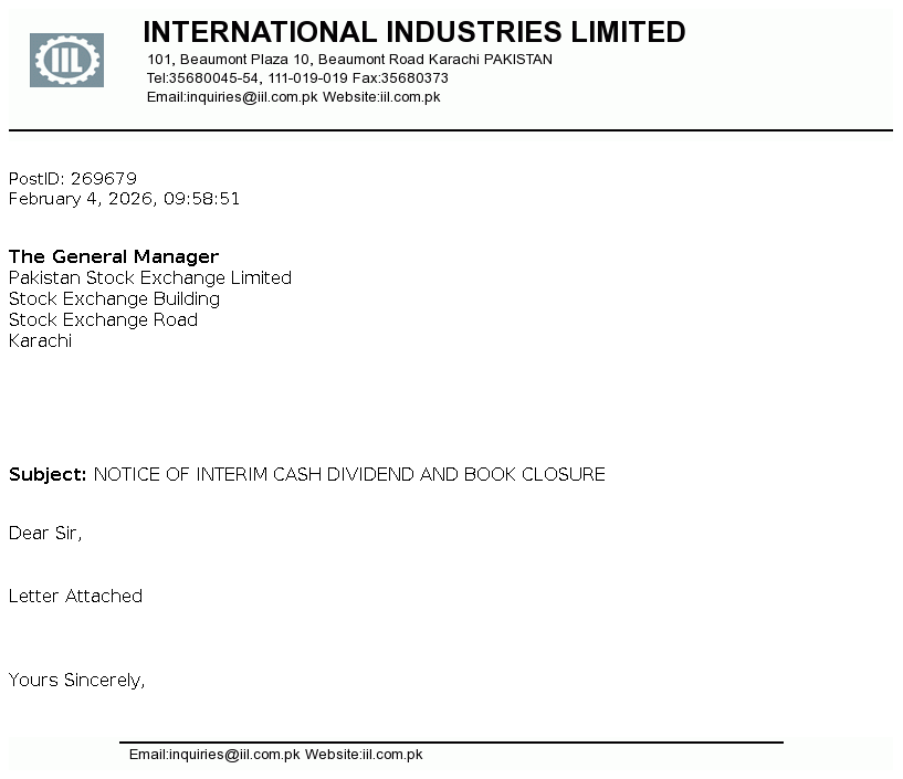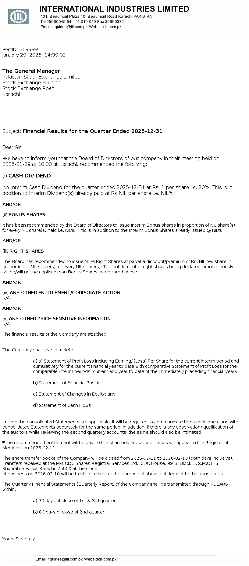 International Industries Limited was incorporated in Pakistan in 1948. The Company is engaged in the business of manufacturing and marketing of galvanized steel pipes, precision steel tubes, API line pipes and polymer pipes & fittings.