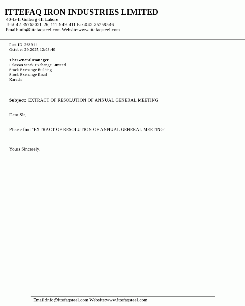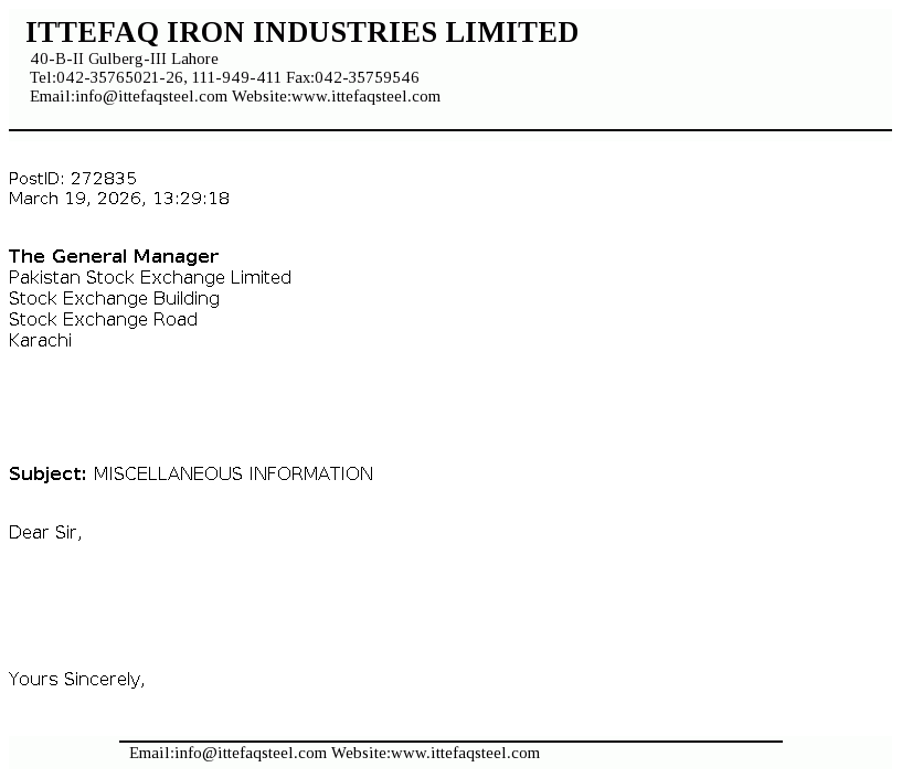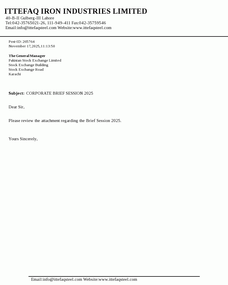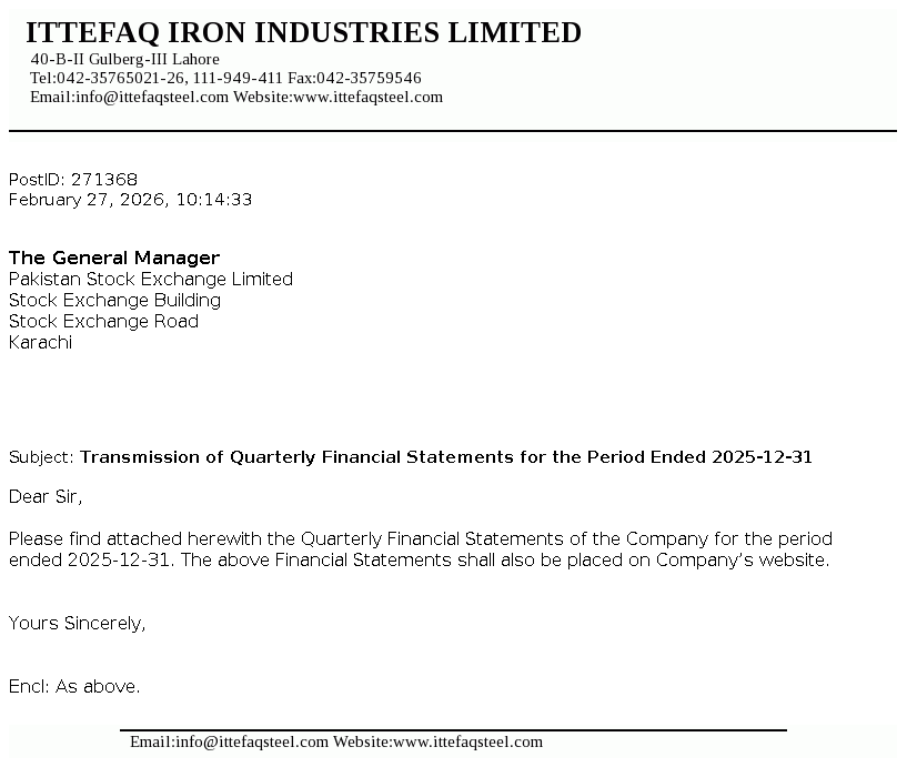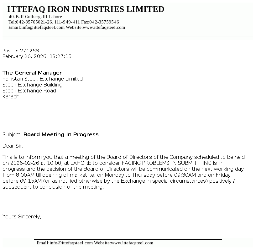 Ittefaq Iron Industries Limited (Formerly Ittefaq Sons Private Limited) was incorporated on February 20, 2004 and converted into public unquoted company on 05 January 2017. The company also changed its name from (Ittefaq Sons (Private) Limited) to (Ittefaq Iron Industries Limited) on 09 February 2017. The principal activity of the company is manufacturing of Iron Bars and Girders.