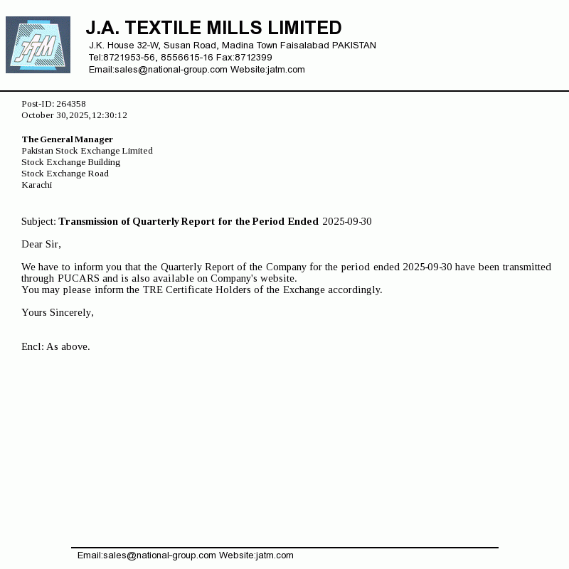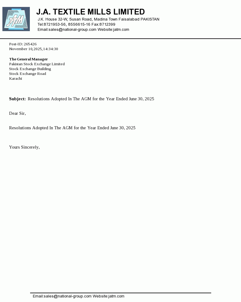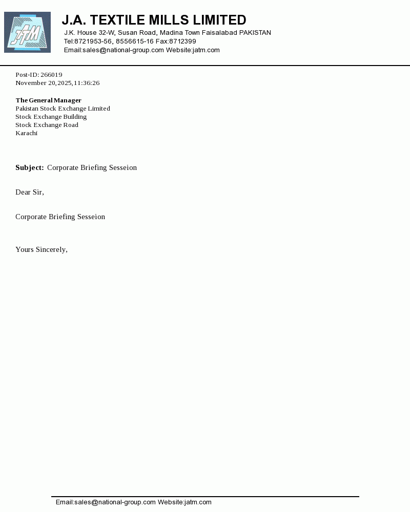 J.A. Textile Mills Limited was incorporated in Pakistan on May 25, 1987 under the companies Ordinance 1984. The principal activity of the company is manufacturing and sale of yarn.