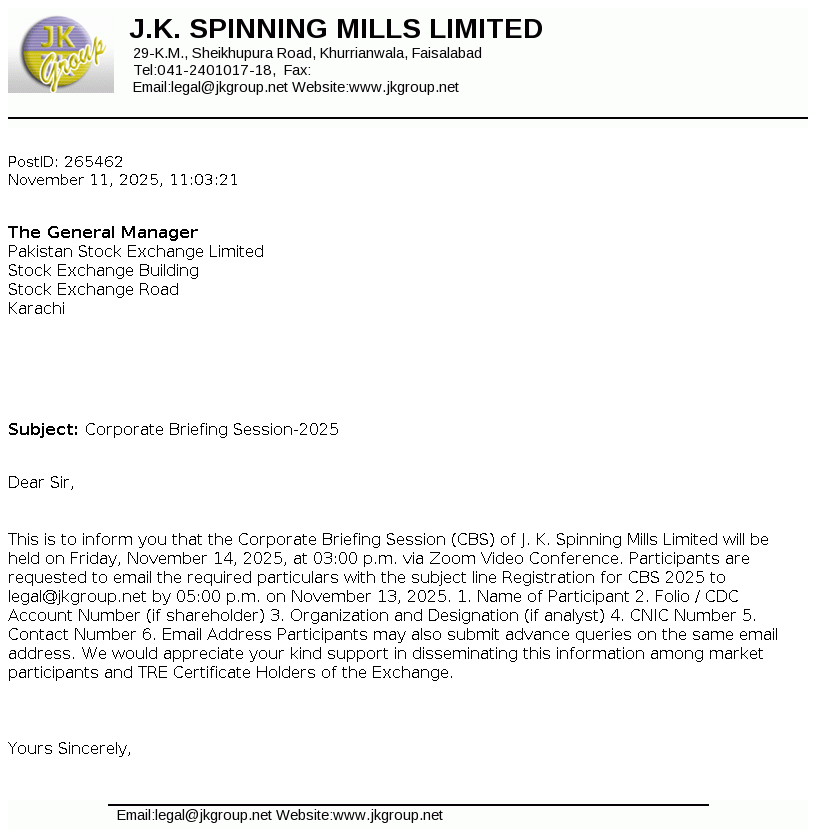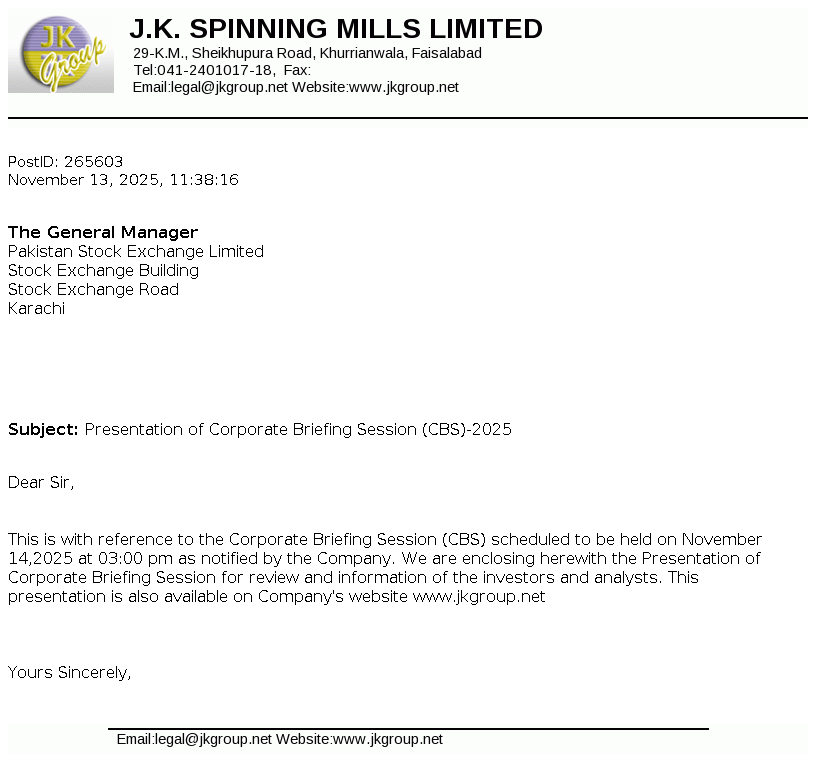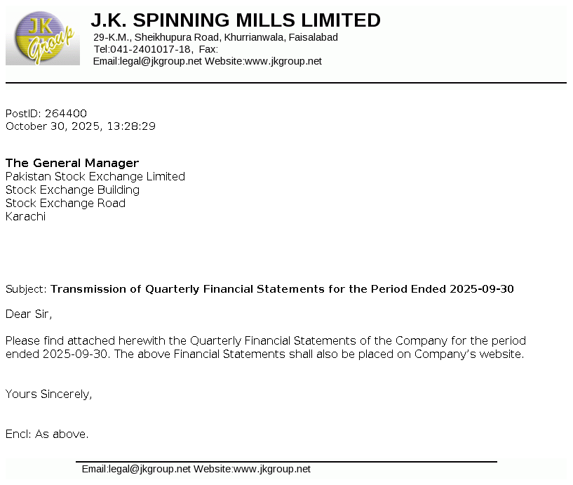 J.K.Spinning Mills Limited 34-Falcon Enclave, Tufail Road, Lahore Cantt, Lahore