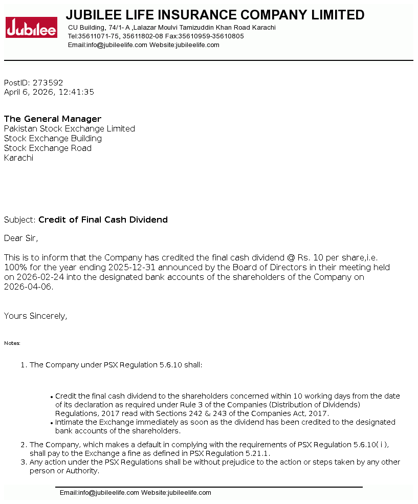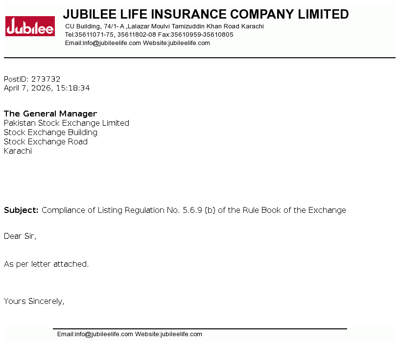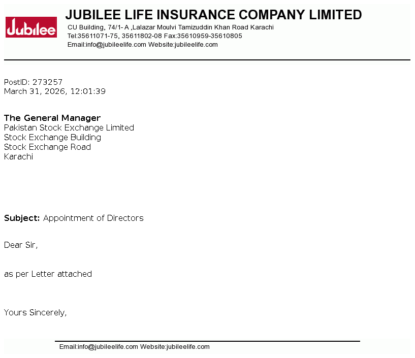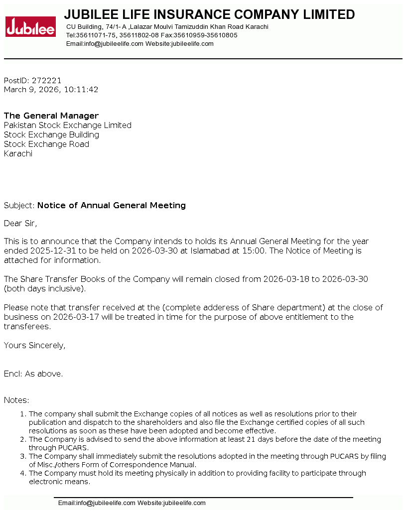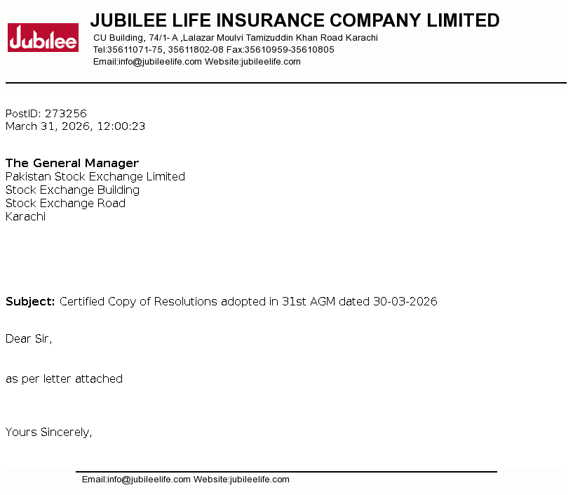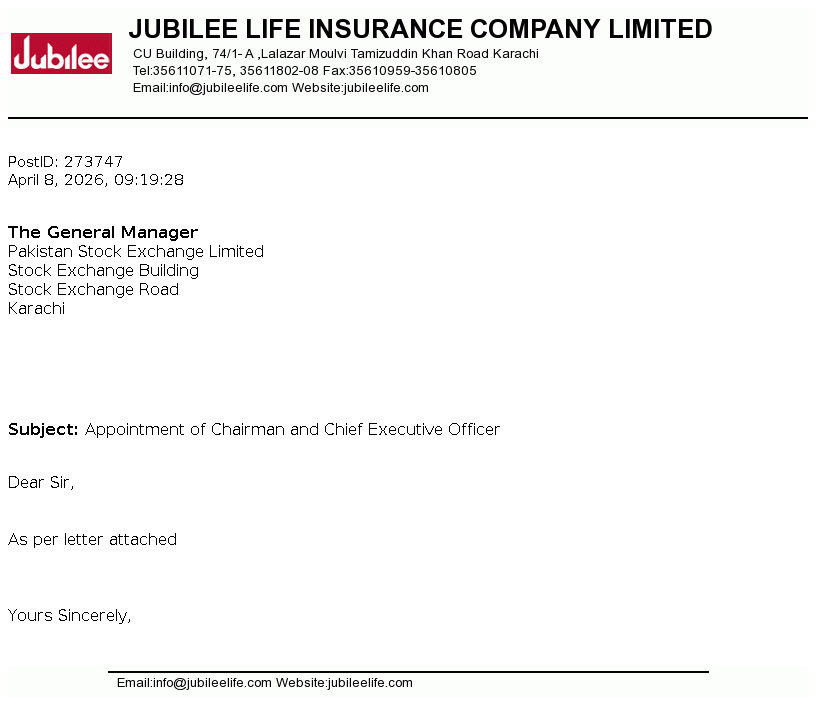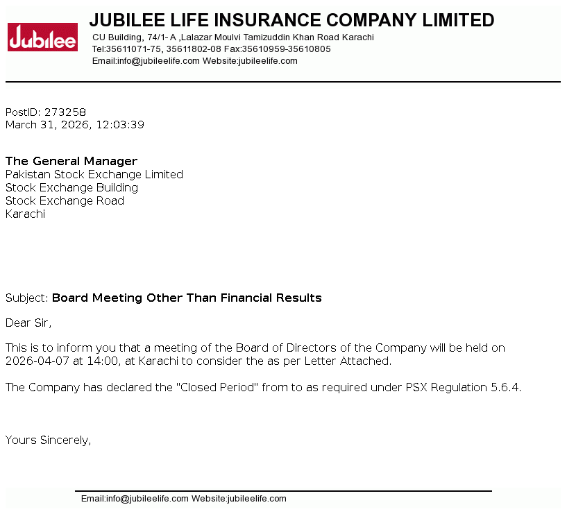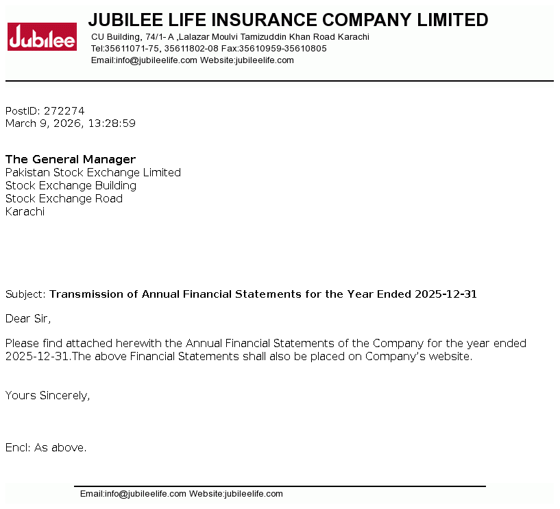 Jubilee Life Insurance Company Limited was incorporated in Pakistan on June 29, 1995 as a public limited company under the Companies Ordinance 1984 (now Companies Act, 2017). The company is engaged in life insurance, carrying on non-participating business. The company is a subsidiary of Aga Khan Fund For Economic Development, S.A, Switzerland.