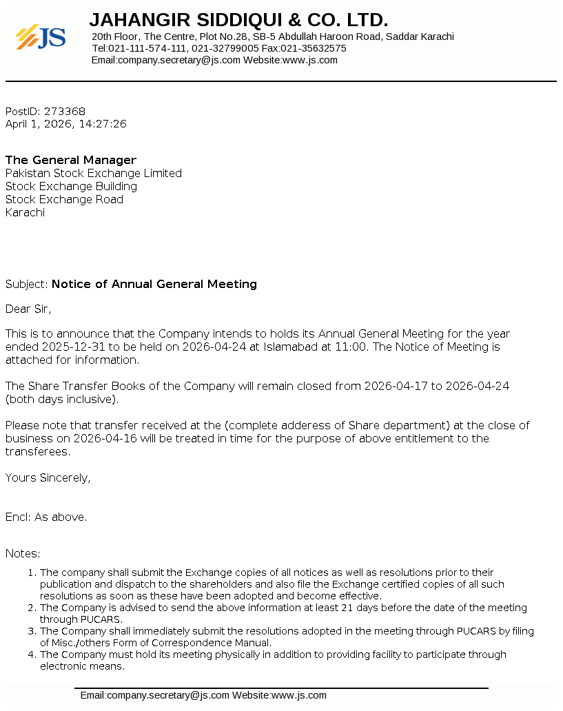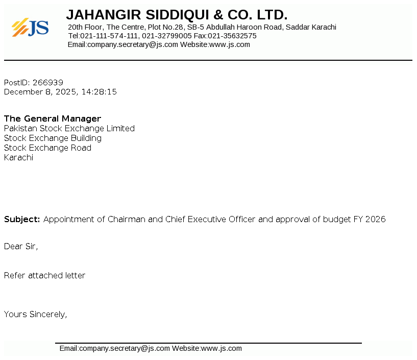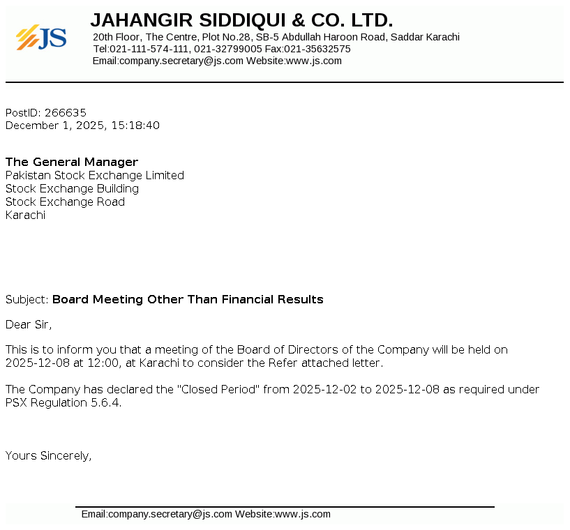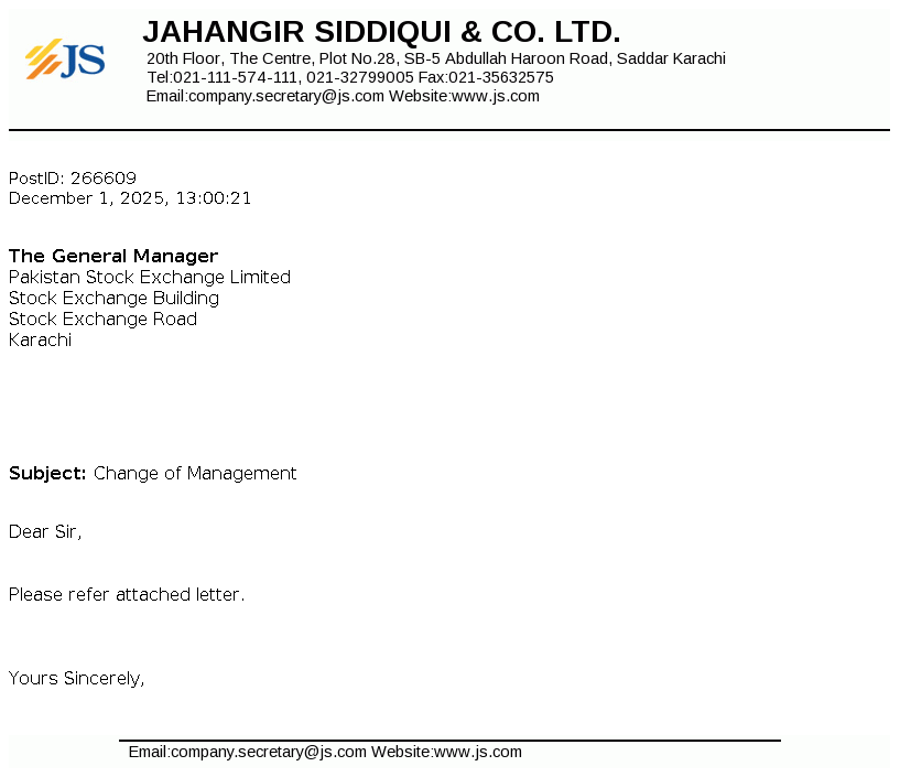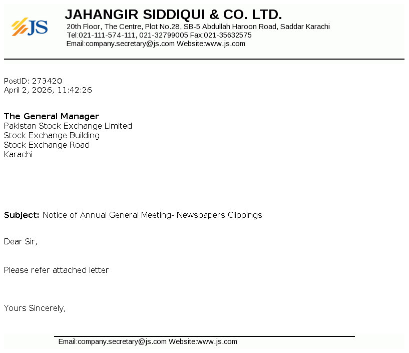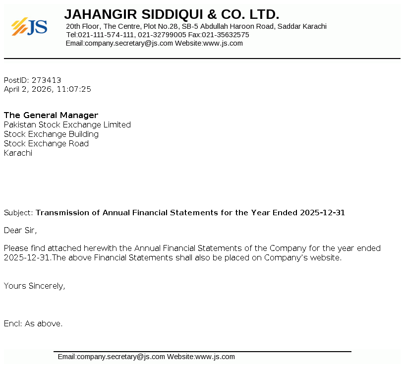 Jahangir Siddiqui & Co. Ltd. was incorporated under the repealed Companies Ordinance, 1984 on May 04, 1991 as a public unquoted company. The principal activities of the Company are managing strategic investments, trading of securities, consultancy services, etc.