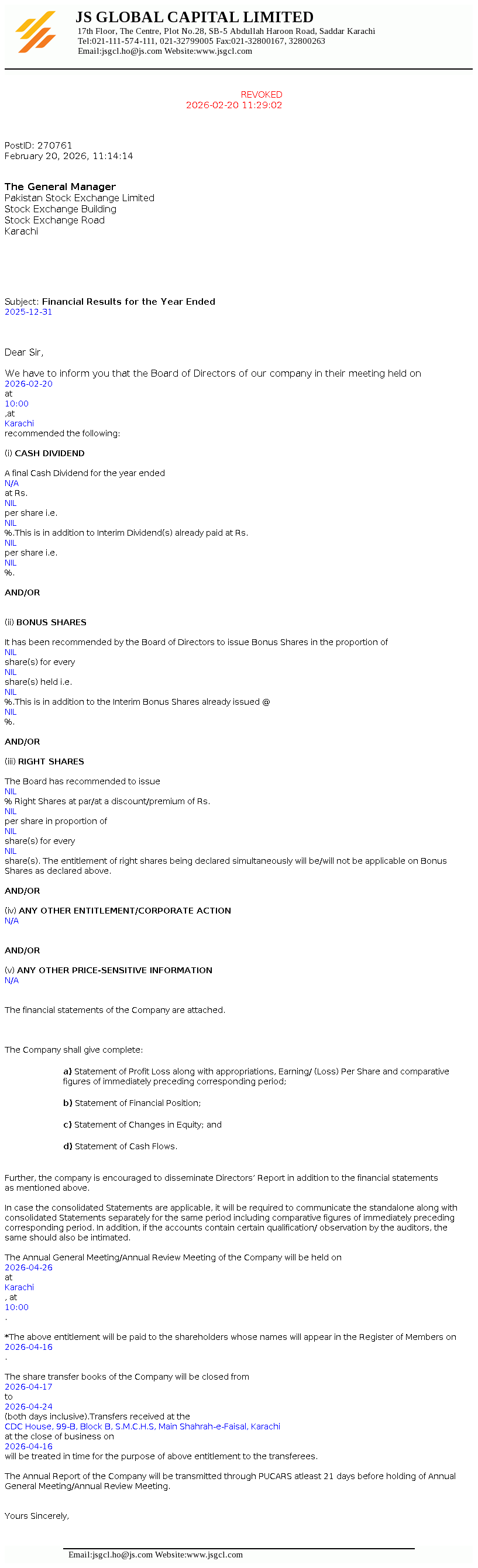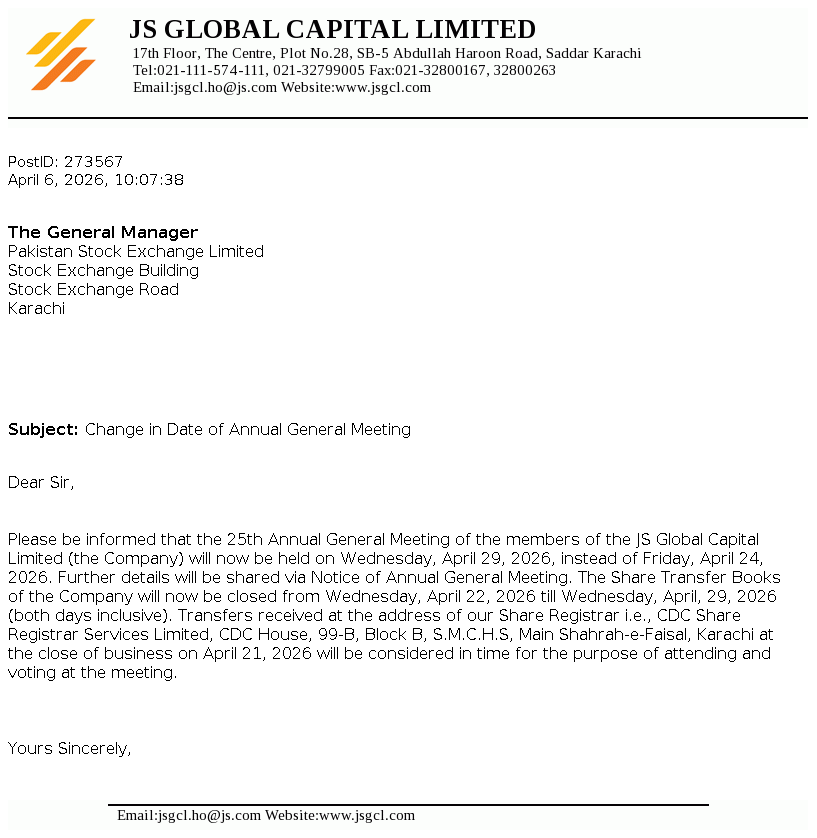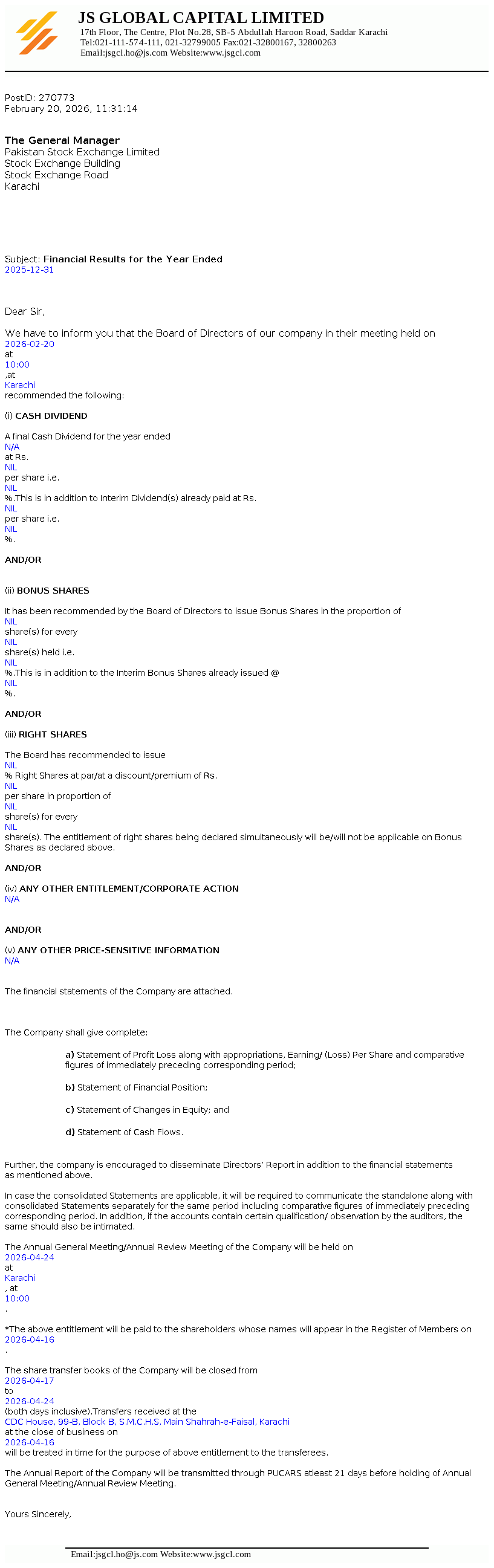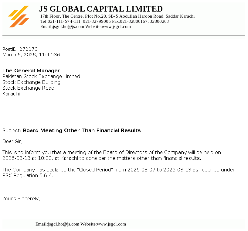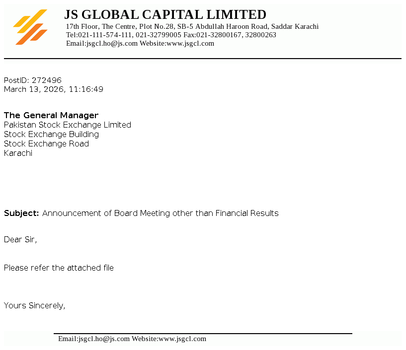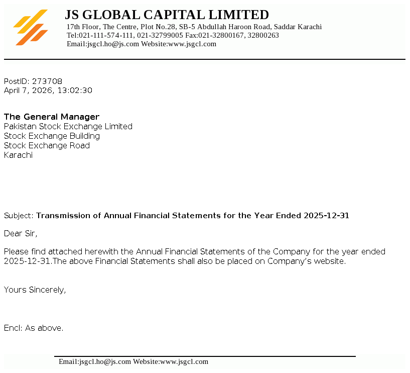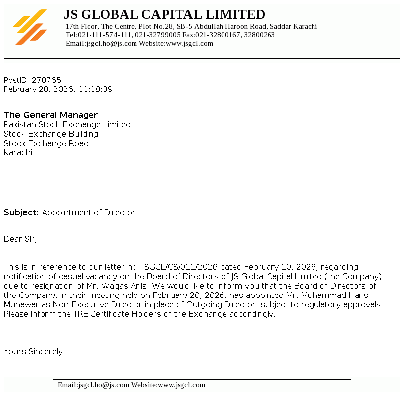 JS Global Capital Limited was incorporated as a private limited company on June 28, 2000. The Company is a Trading Right Entitlement Certificate (TREC) holder of Pakistan Stock Exchange Limited (PSX) and member of Pakistan Mercantile Exchange Limited (PMEX). The principal activities of the Company are share brokerage, money market brokerage, forex brokerage, commodity brokerage, advisory, underwriting, book running and consultancy services. Other activities include investment in a mix of listed and unlisted equity and debt securities and reverse repurchase transactions.