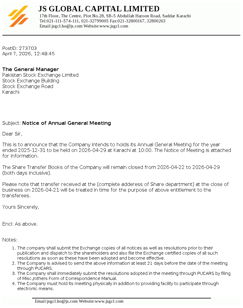 CDC Share Registrar Services Limited CDC House, 99 – B, Block ‘B’, S.M.C.H.S., Main Shahra-e-Faisal, Karachi