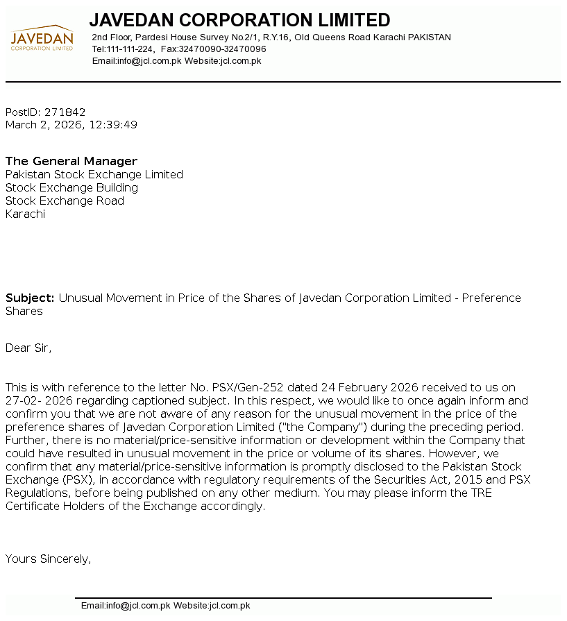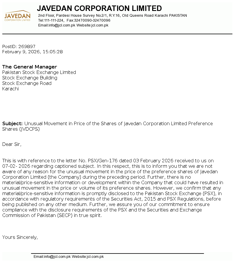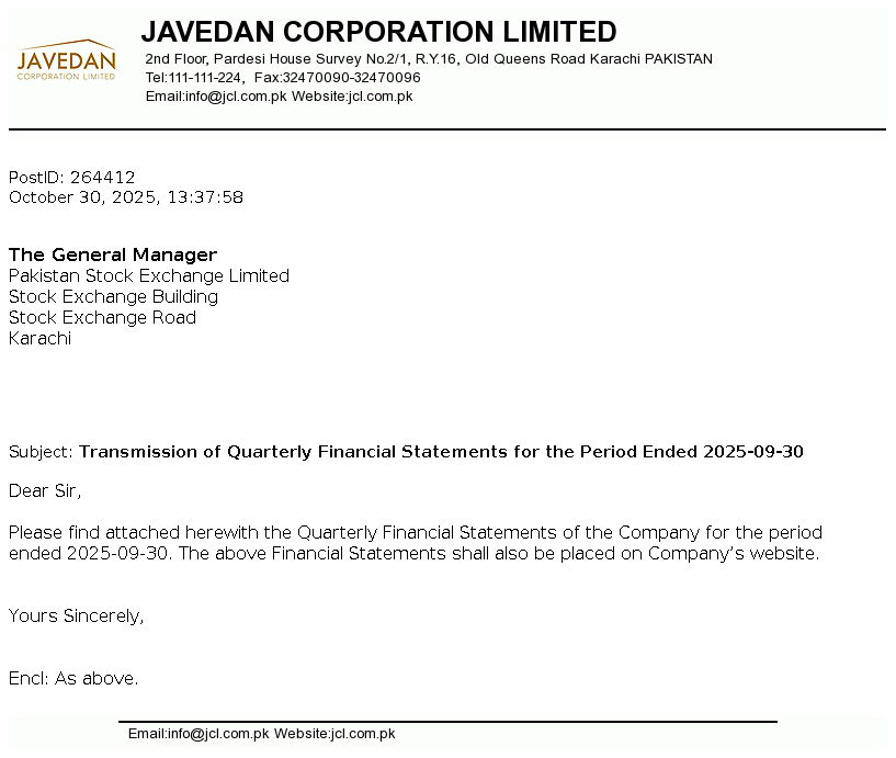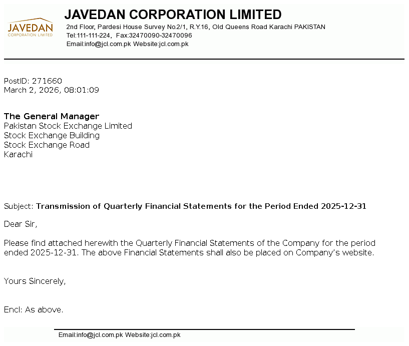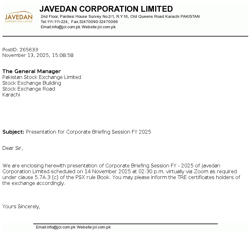 Javedan Corporation Limited was incorporated in Pakistan on June 08, 1961, as a public limited company under the repealed Companies Act, 1913 (now Companies Act, 2017). The Company has ceased its cement business since July 01, 2010 and the management has developed business diversification strategy for utilizing the Company’s land having area of 1,367 acres for developing a housing scheme, “Naya Nazimabad”, that includes bungalows, open plots, flat sites and commercial sites.