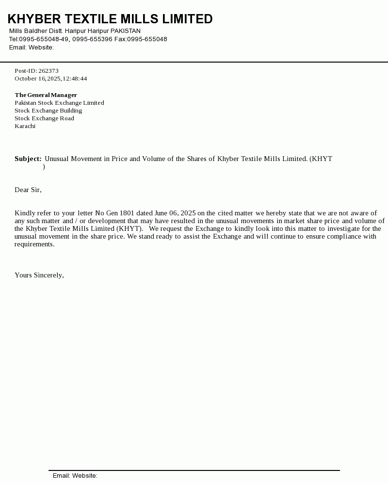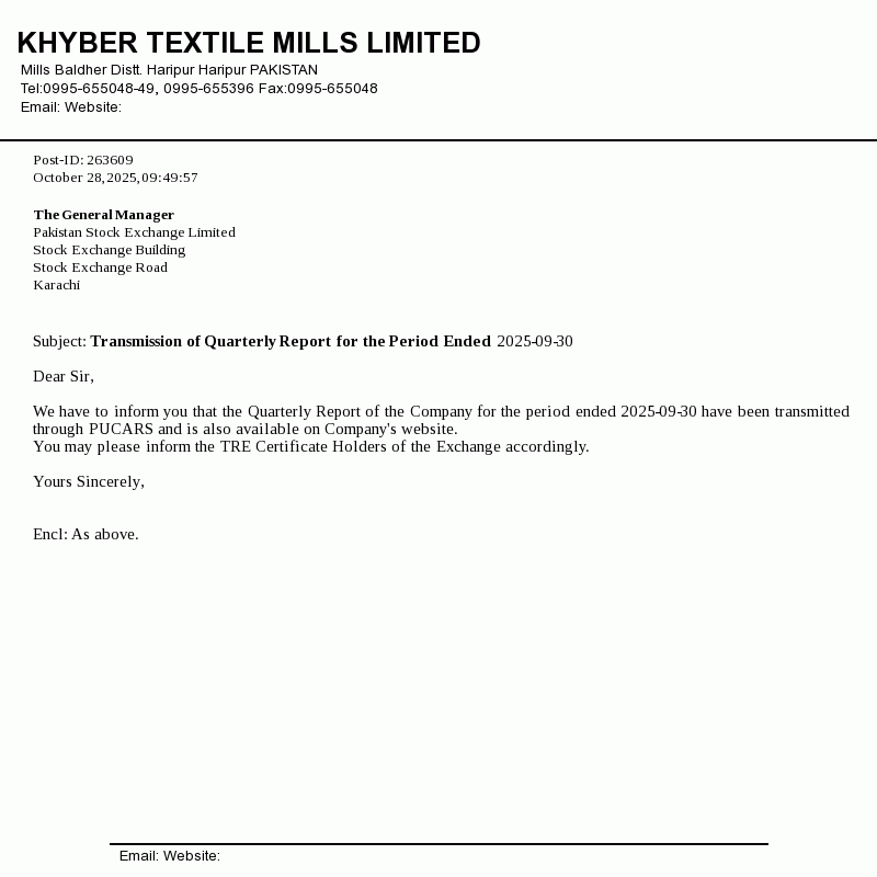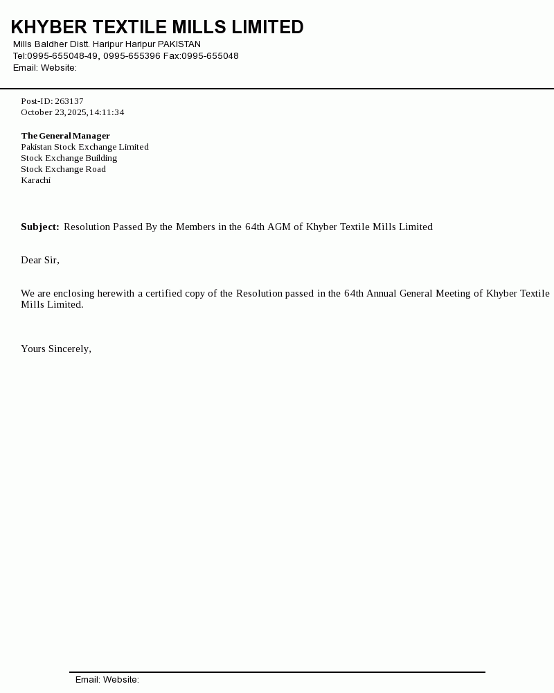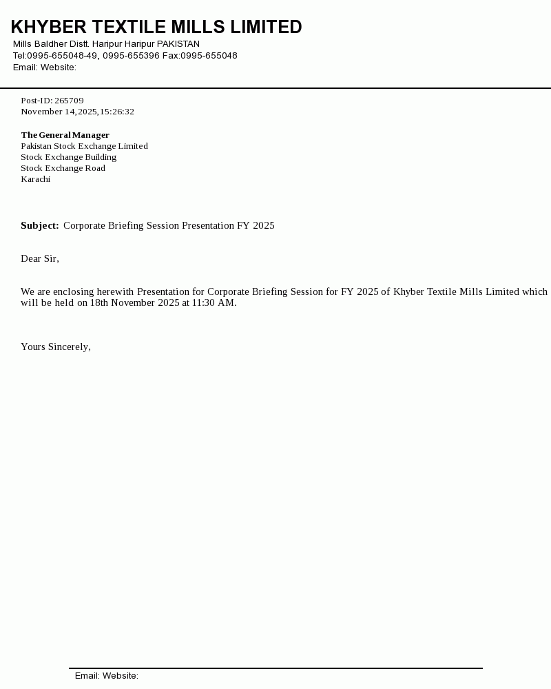 Khyber Textile Mills Ltd Baldher , Distt Haripur Khyber Pakhtunkhawa